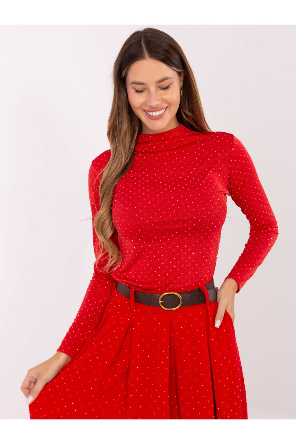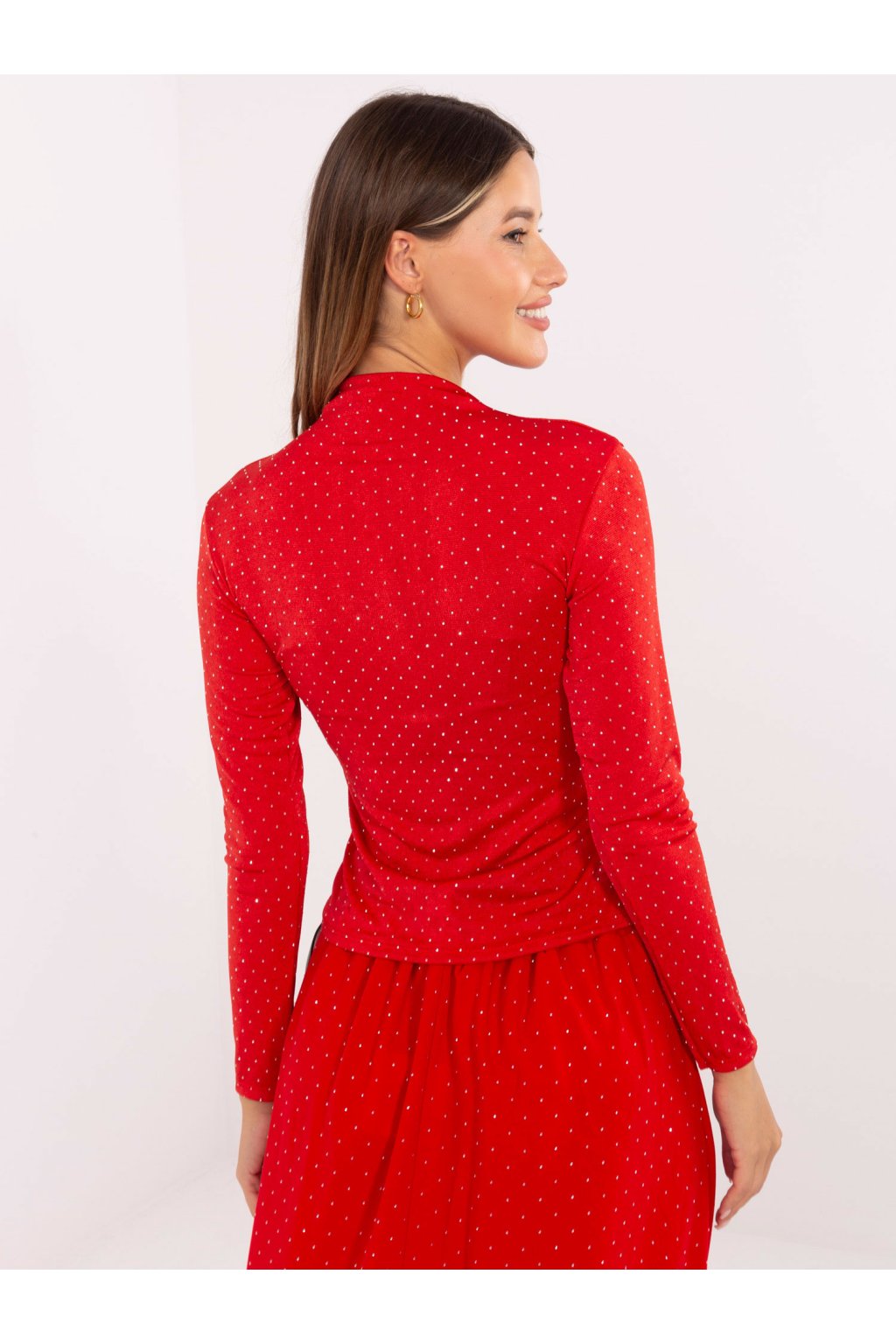 Elegantní slavnostní top se stojáčkem. Přiléhavý střih z pružného materiálu, jemný potisk drobných puntíků. Dlouhý rukáv.