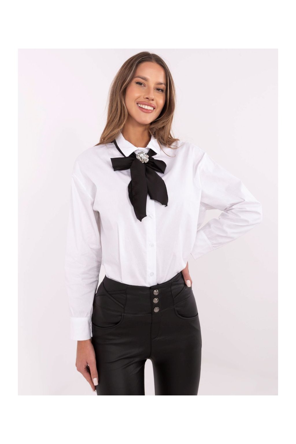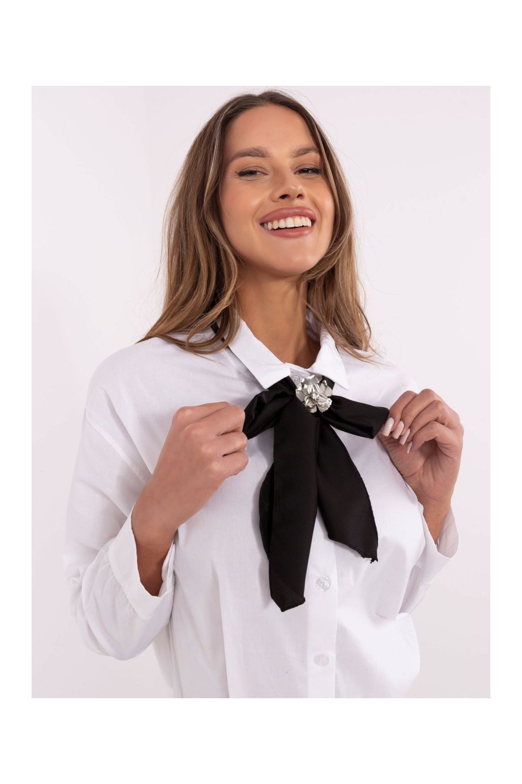 Klasická košile na knoflíčky, u krku výrazná černá vázačka s broží, dlouhé rukávy s manžetou a knoflíčkem.