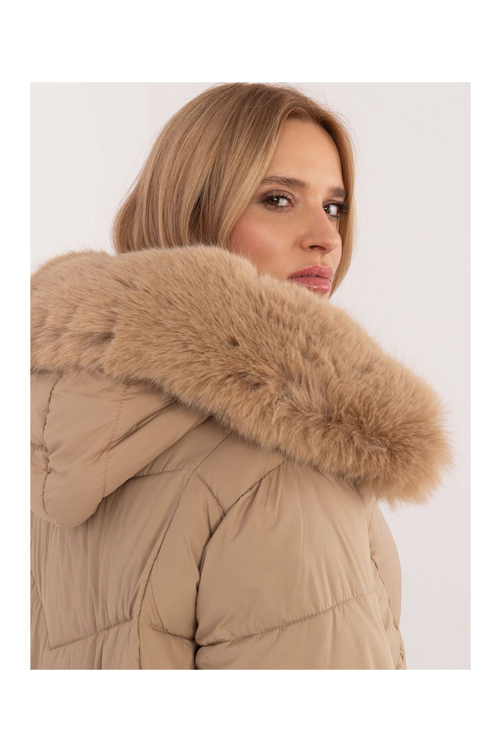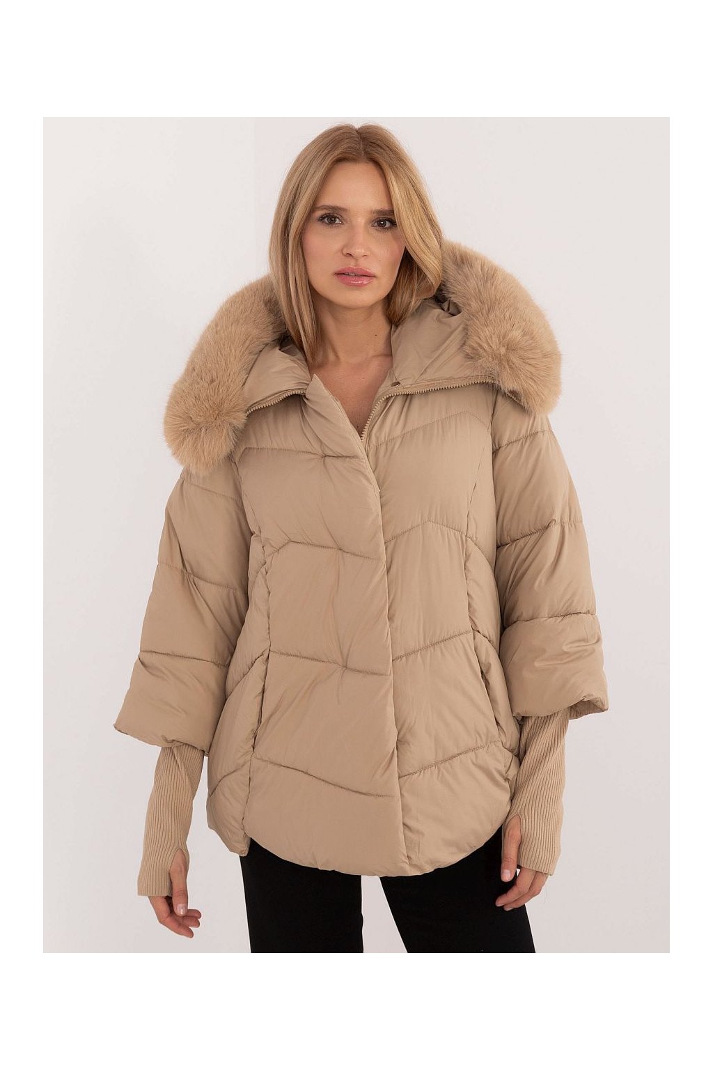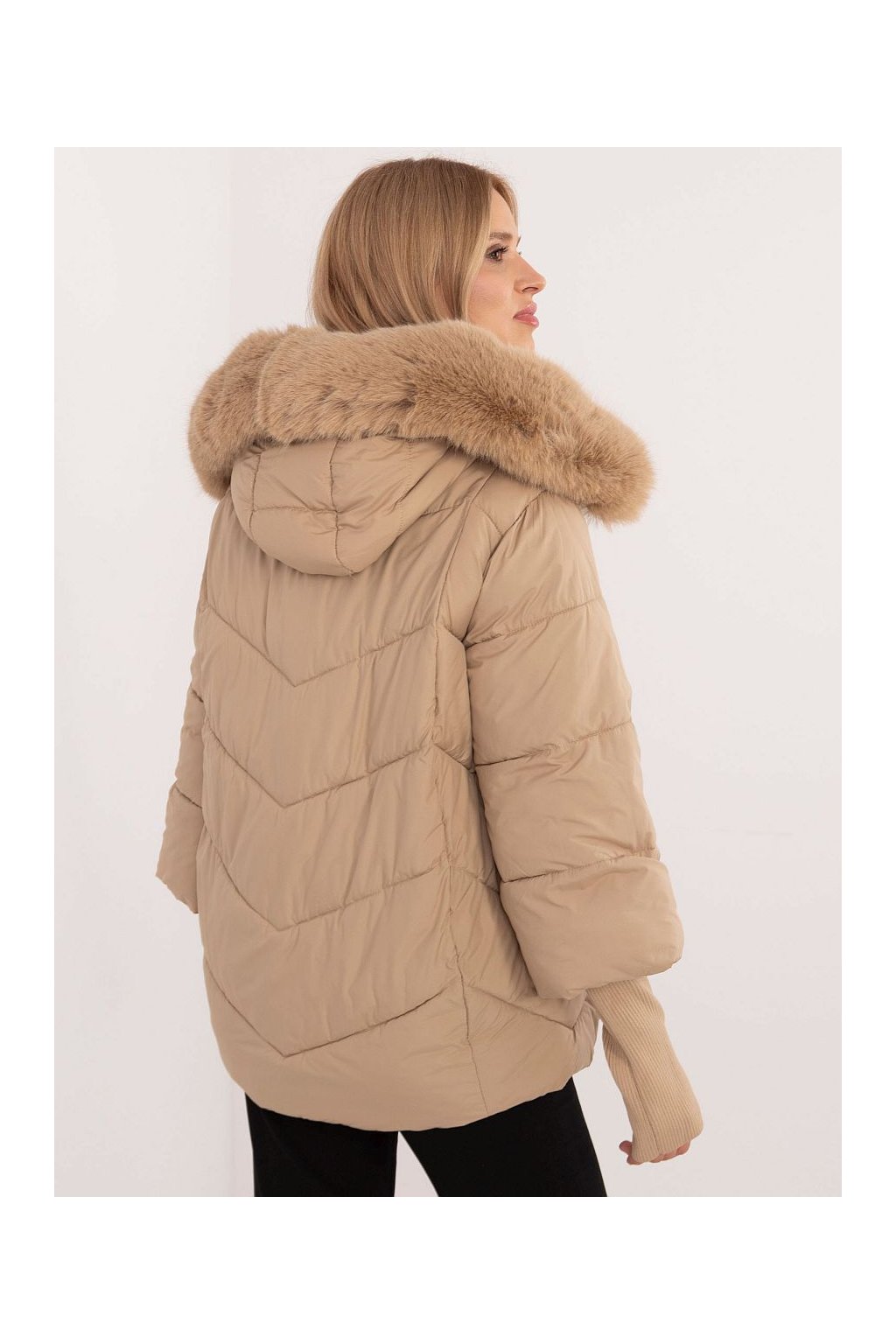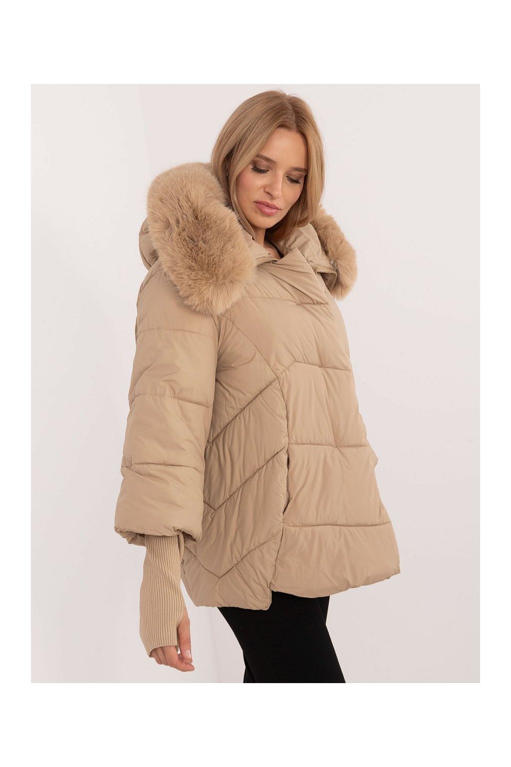 Teplá zimní prošívaná bunda s kapucou s výraznou kožešinou, zapínání na zip, postraní kapsy na zip, rozšířený střih. Na rukávech vysoké náplety.