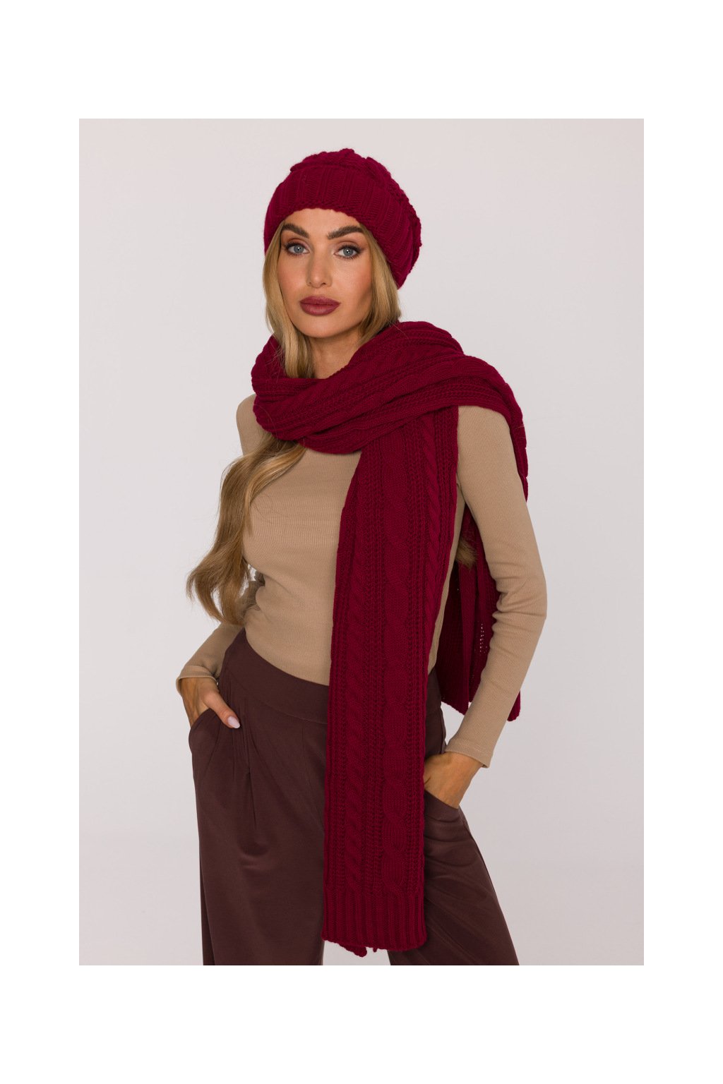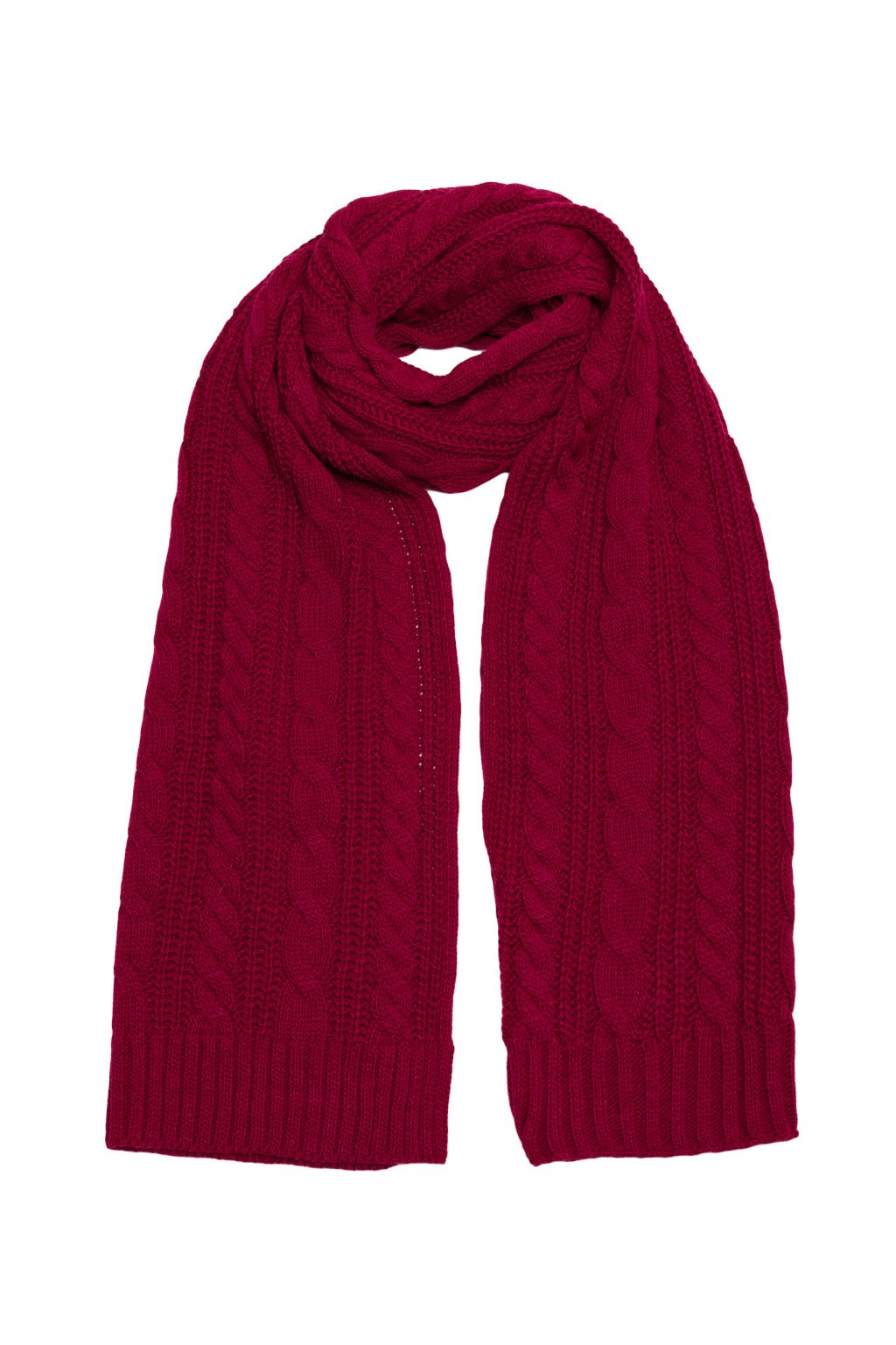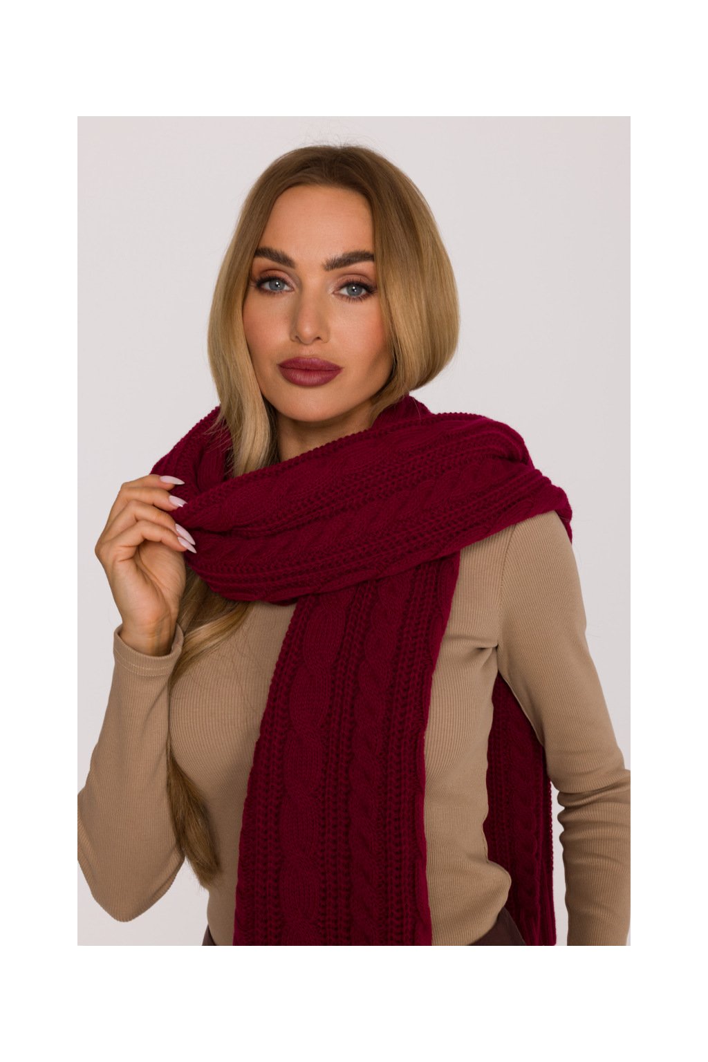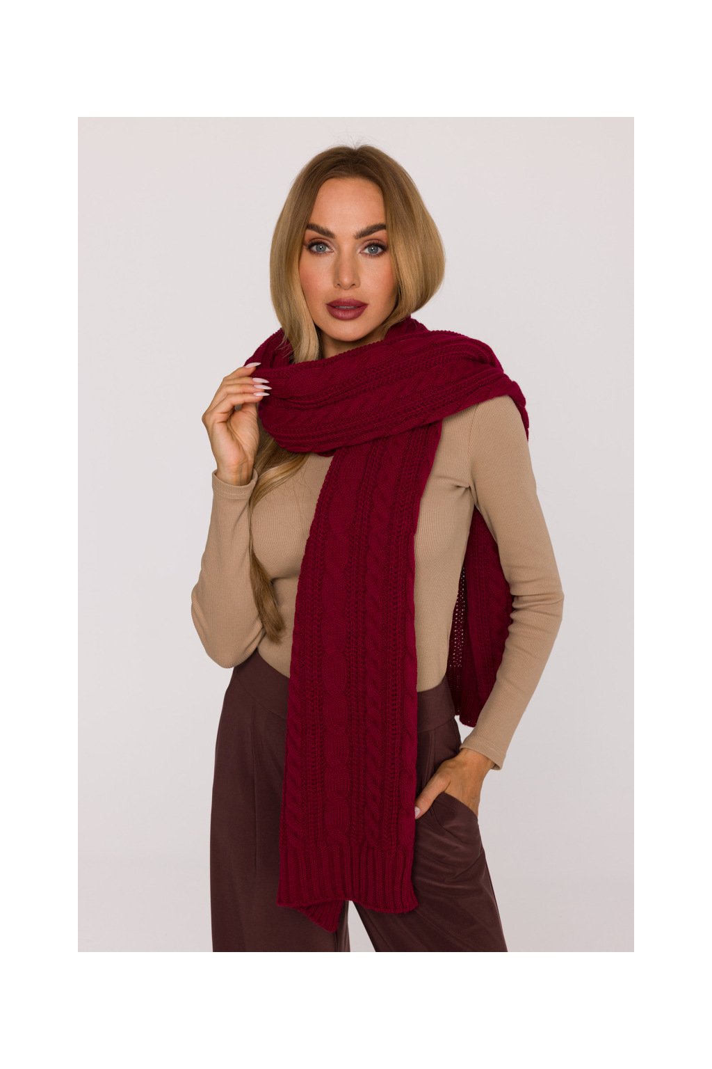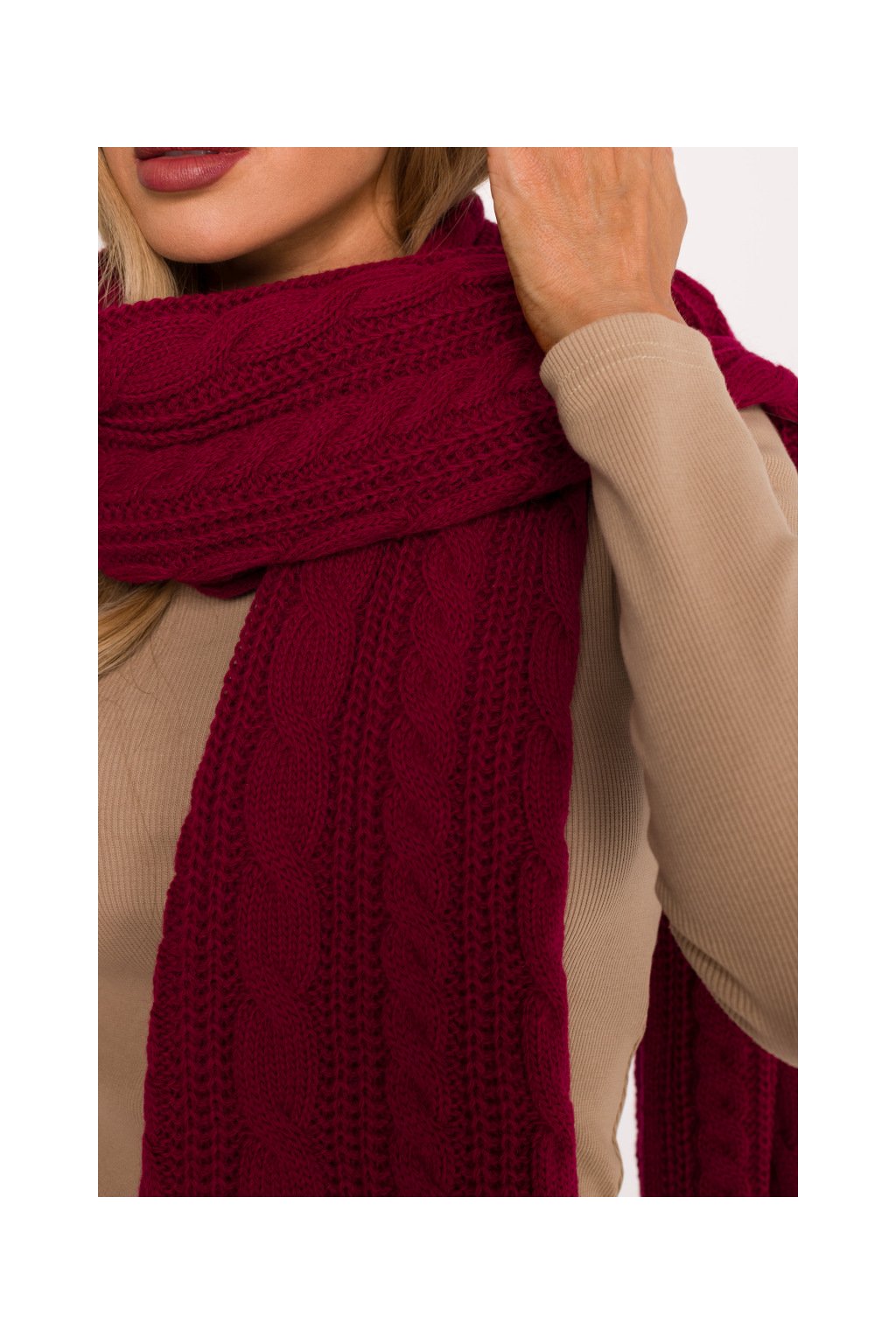 Pletená dlouhá šála s copánky MOE M898 bordó