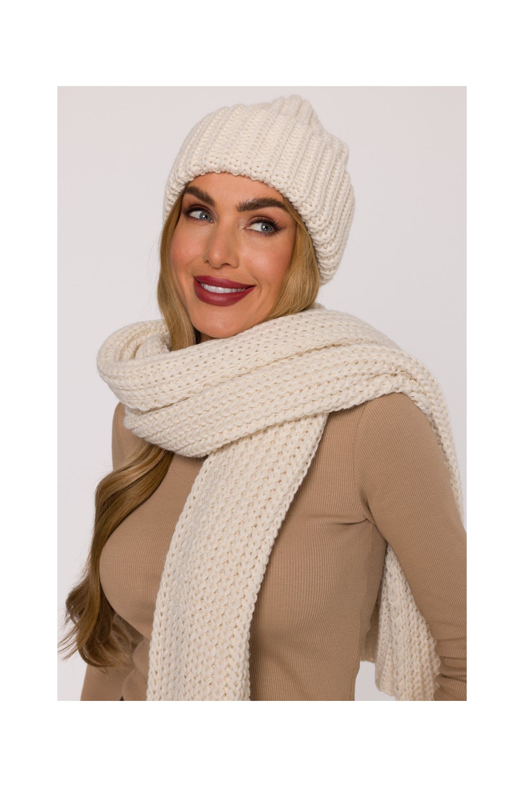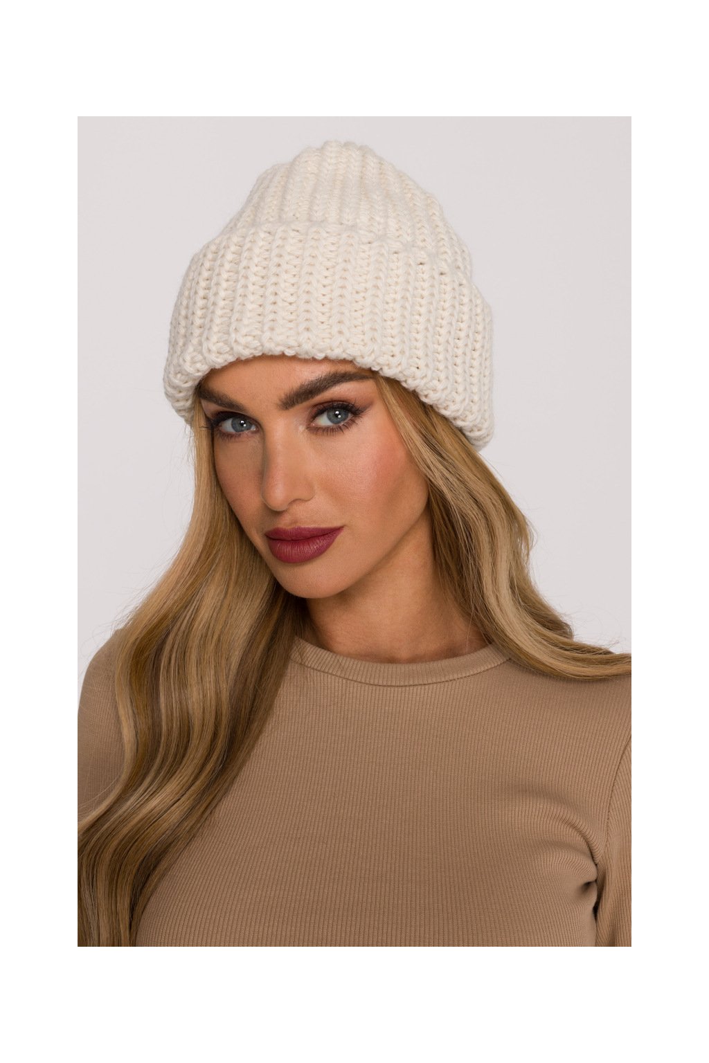 Pletená ohrnutá čepice beanie MOE M895 smetanová