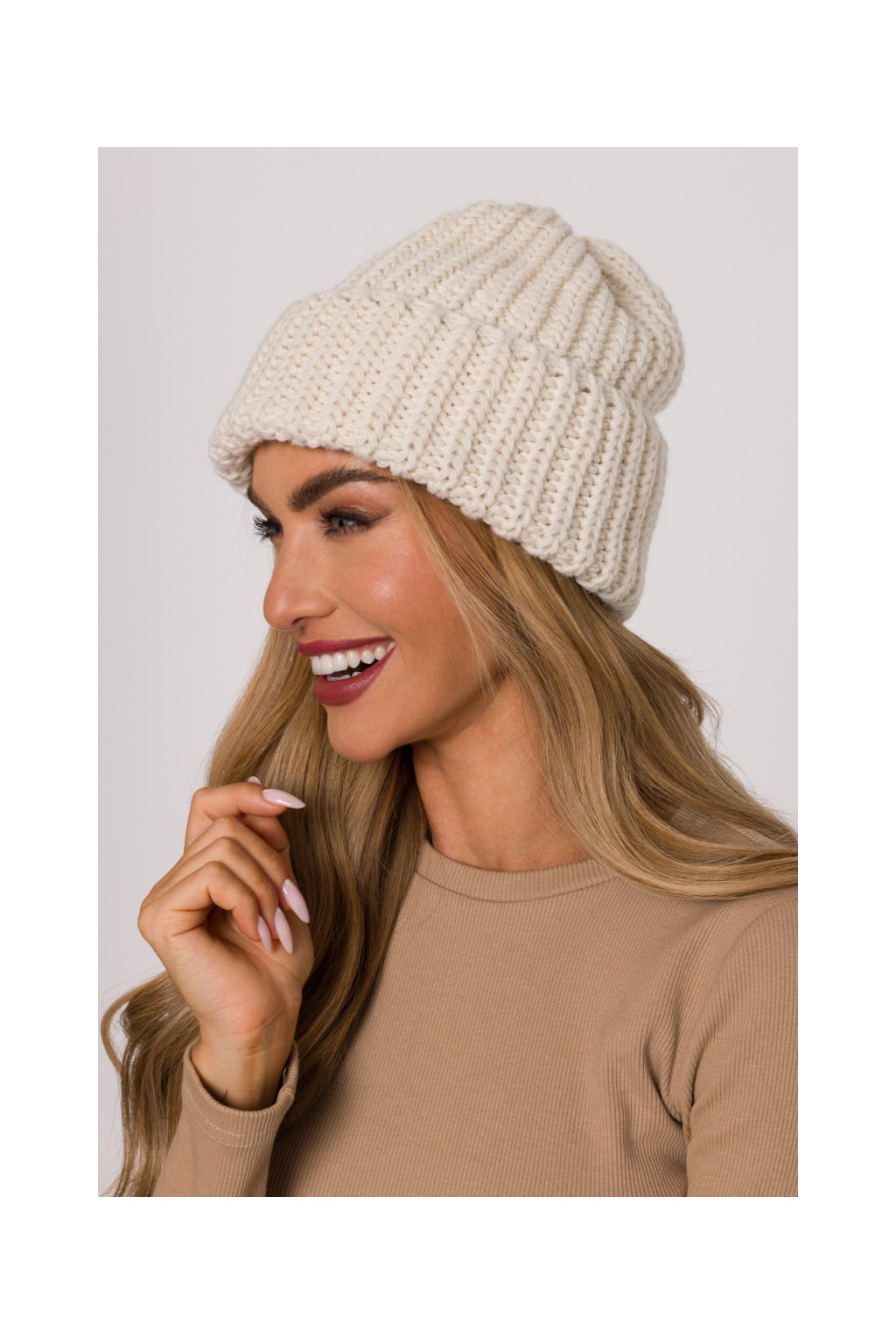 Teplá čepice beanie pletená žebrovaný vzorem (brioche) z měkké příze, v dolní části výrazný ohrnutý lem.