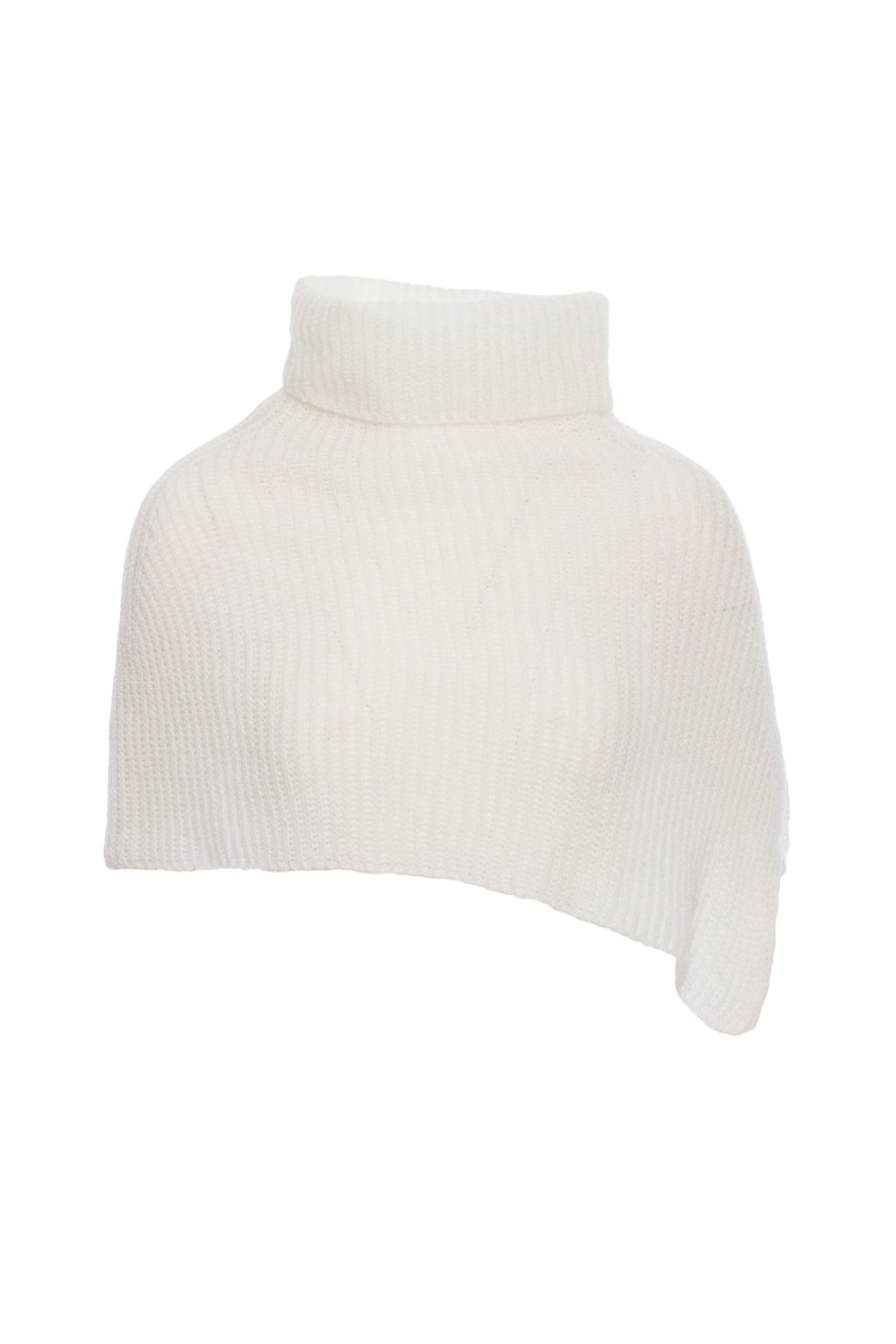 Volně pletený nákrčník s ohrnovacím rolákem z měkké příze. Prodloužený střih obepínající ramena s postranním rozparkem, u krku vysoký ohrnovací rolák.