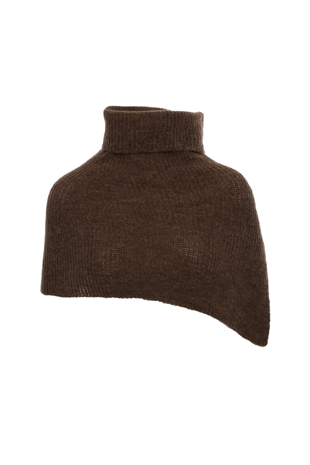 Volně pletený nákrčník s ohrnovacím rolákem z měkké příze. Prodloužený střih obepínající ramena s postranním rozparkem, u krku vysoký ohrnovací rolák.