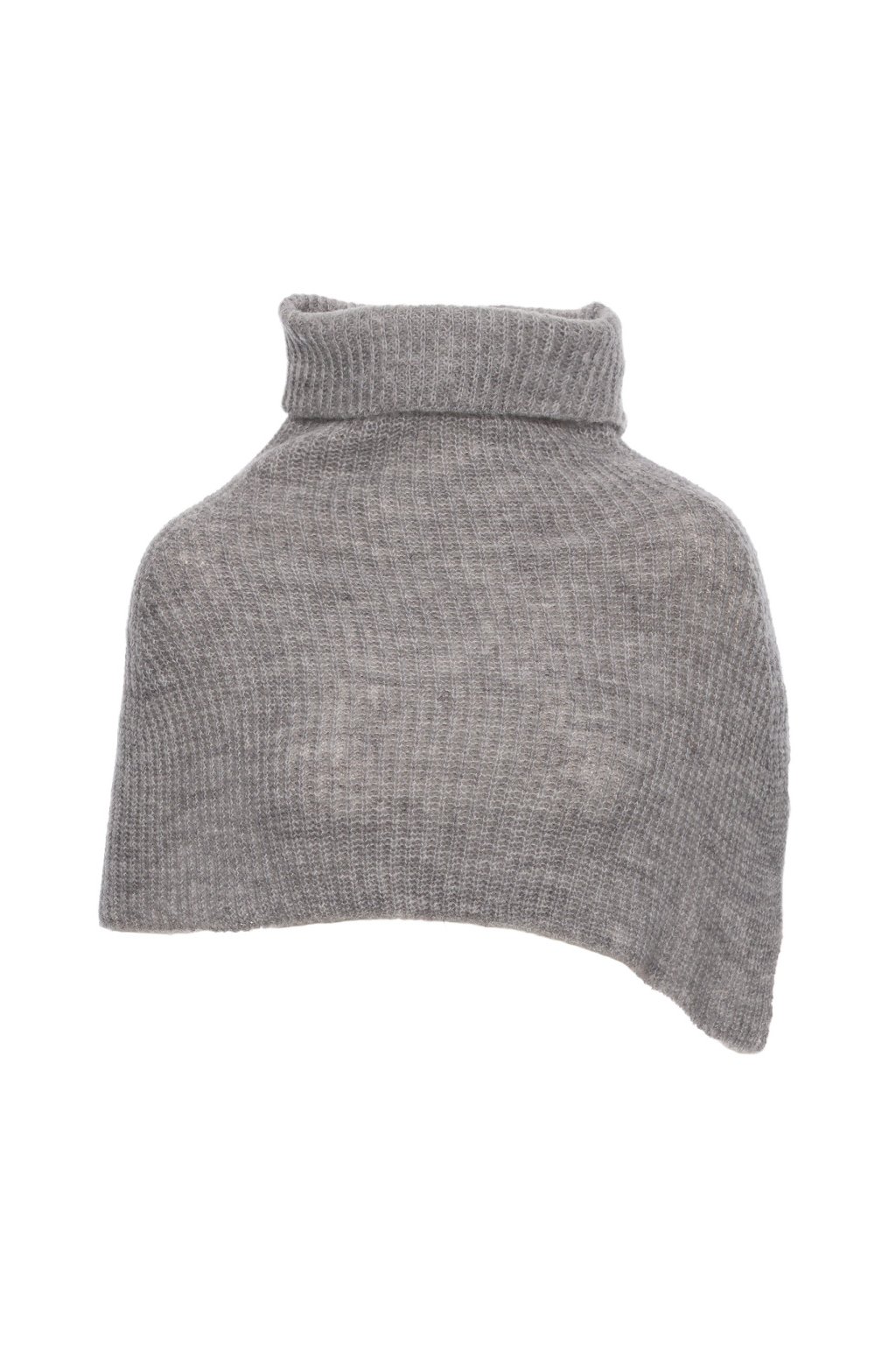 Volně pletený nákrčník s ohrnovacím rolákem z měkké příze. Prodloužený střih obepínající ramena s postranním rozparkem, u krku vysoký ohrnovací rolák.
