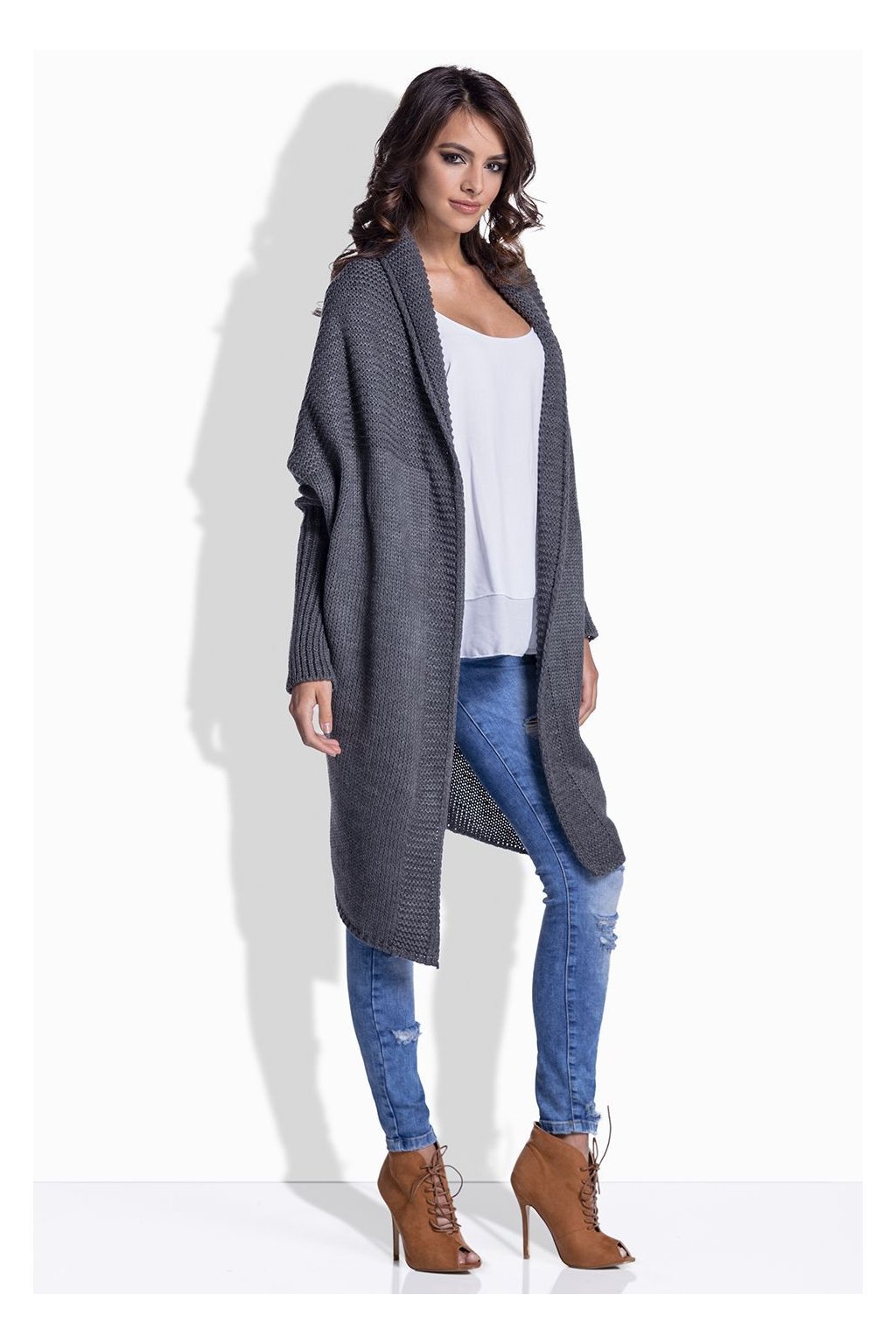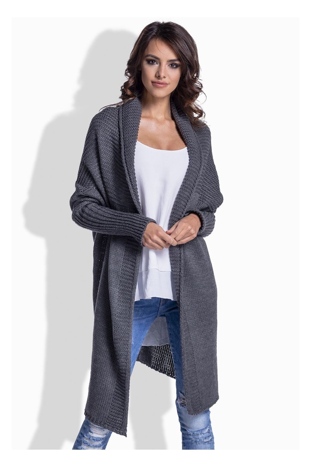 Dámský hladce pletený dlouhý kabátek, široký střih bez zapínání, spadlá ramena, úzké rukávy, stažený zadní díl.