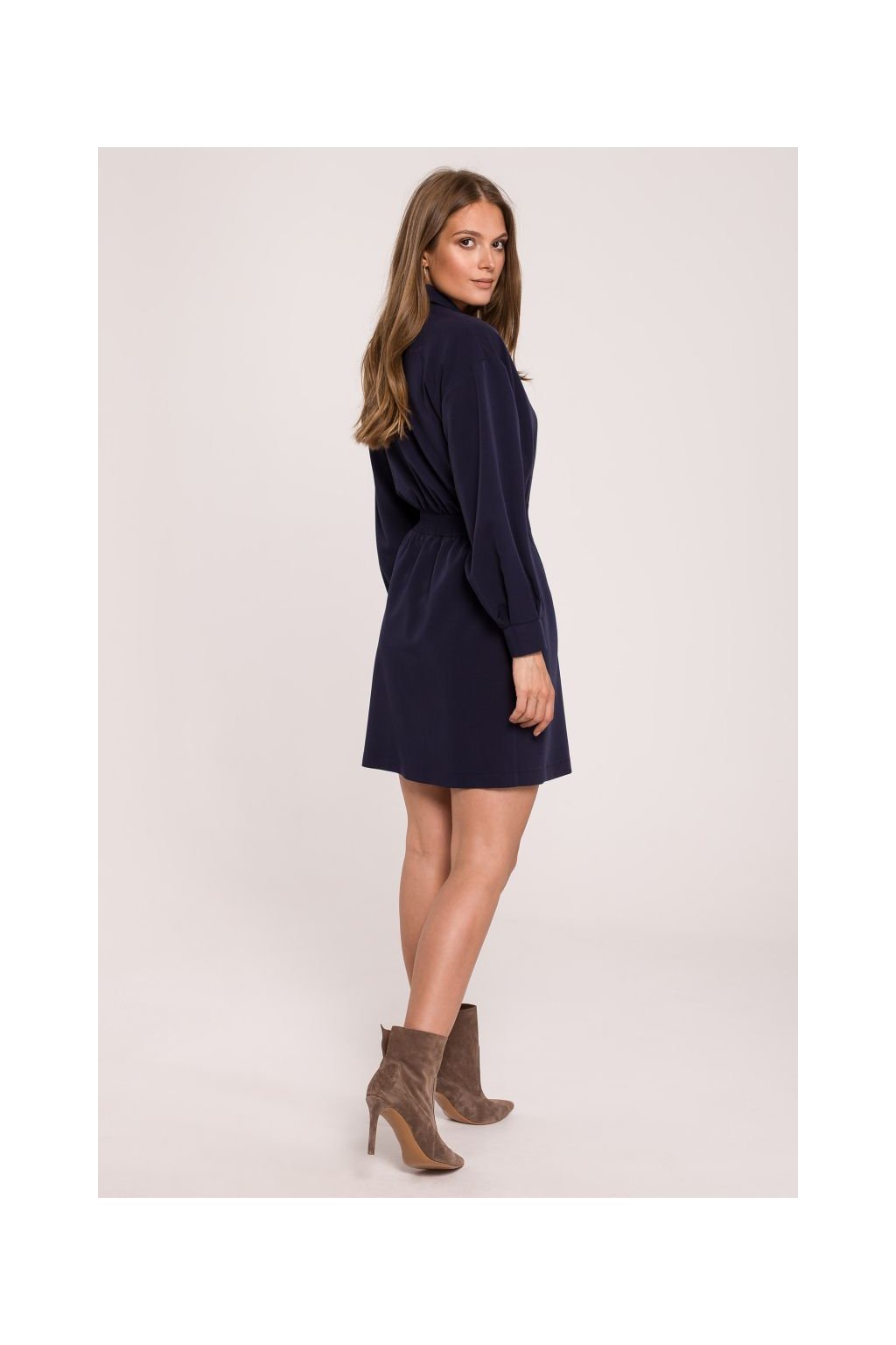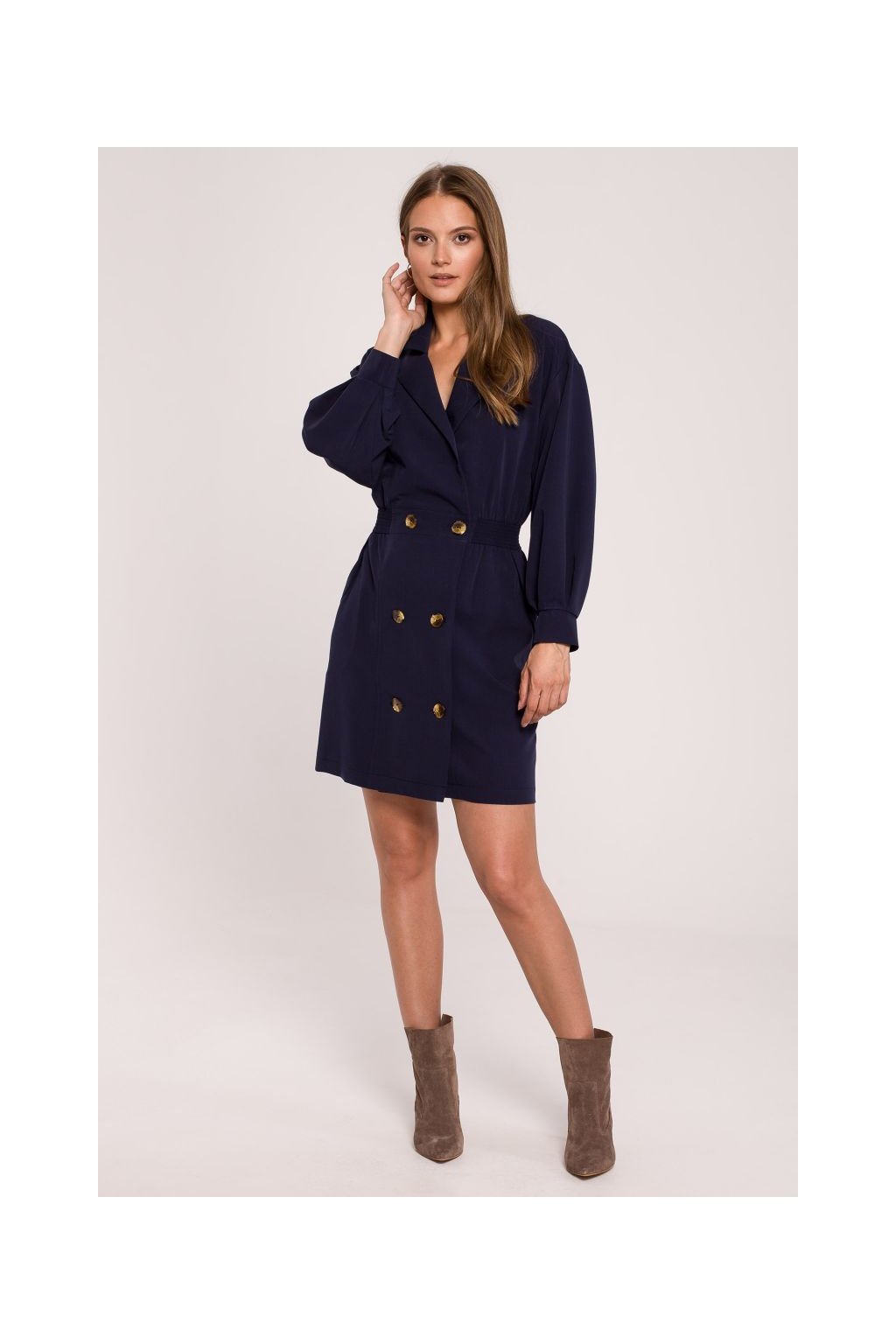 Elegantní sakové šaty dvojitou řadou výrazných knoflíků, v pase nabrané do pružné gumičky ke zvýraznění postavy, nabrané široké rukávy do manžetek. Šaty jsou bez podšívky.