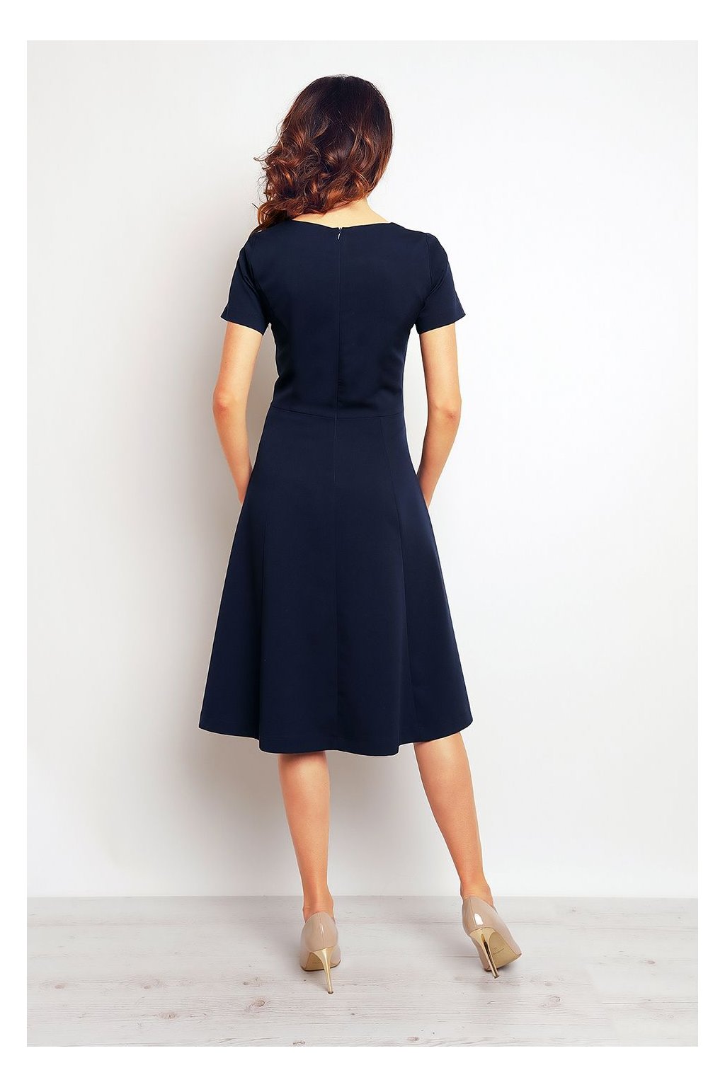 Elegantní šaty do kanceláře s úzkým vypasovaným topem s krátkými rukávy a se širokou rozevlátou sukní. Zapínání na skrytý zip na zádech.