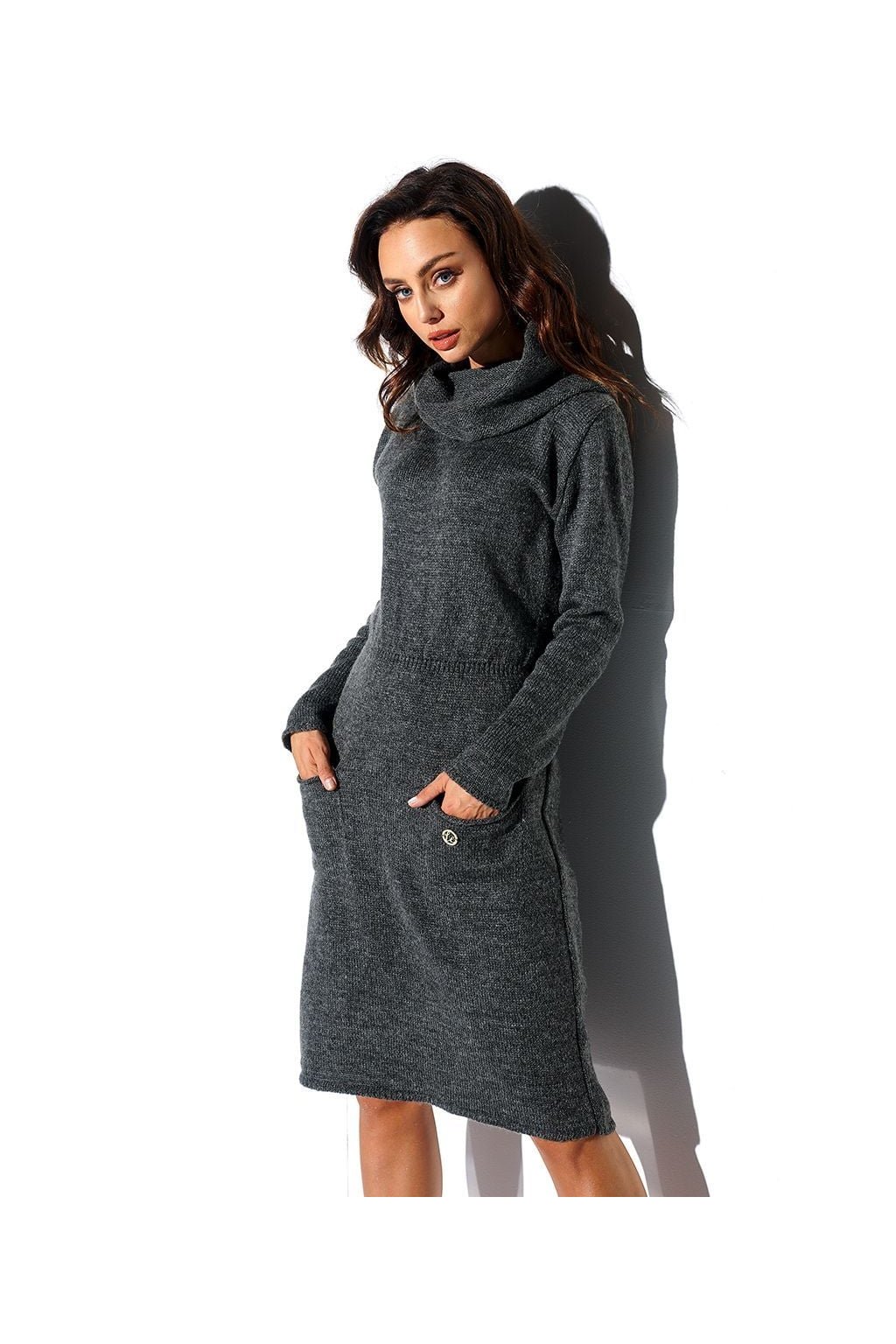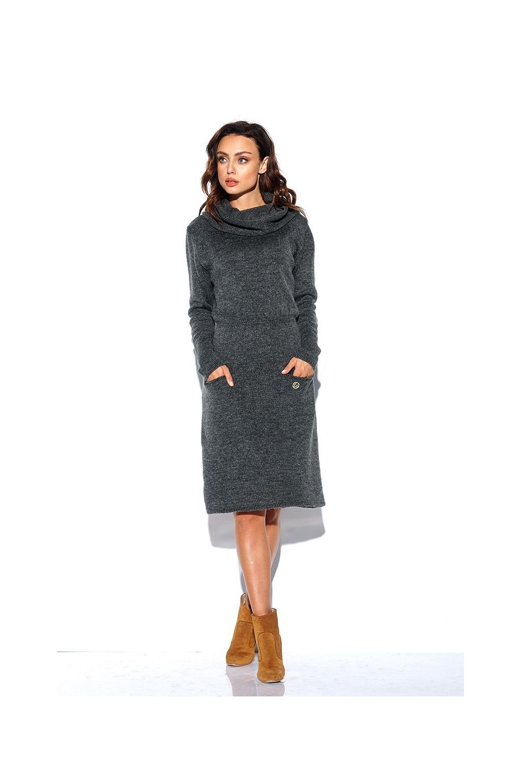 Elegantní pletené šaty z hladkého úpletu. U krku široký rolák, v pase stažené, vpředu na sukni kapsy. Jednoduchý a elegantní model pro chladné dny.
