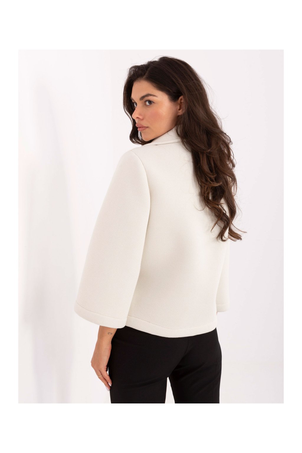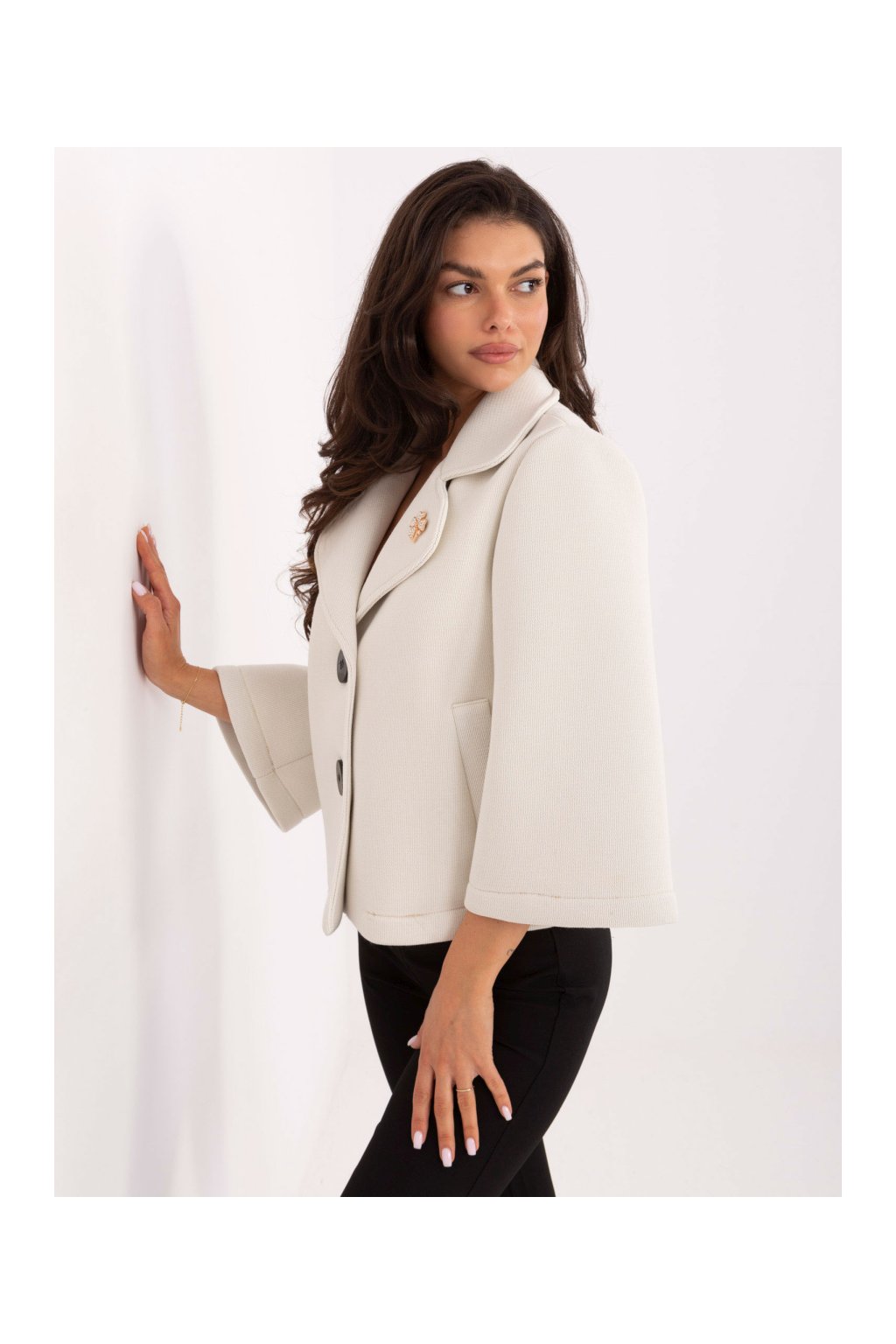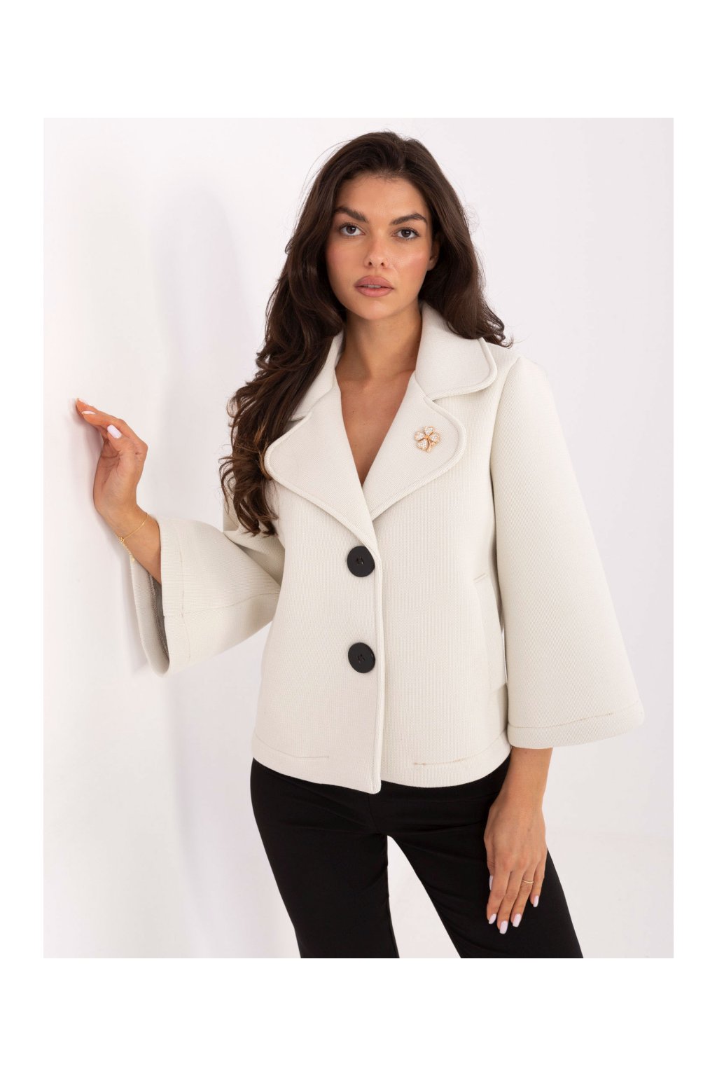 Elegantní podzimní kabátek širokého střihu do A v délce k bokům. Výrazný límec a klopy, na límci ozdobná brož. Tříčtvrteční rukávy, které se mírně rozšiřují. Vpředu kapsy, zapínání jednořadé na velké knoflíky. Bez zateplení.