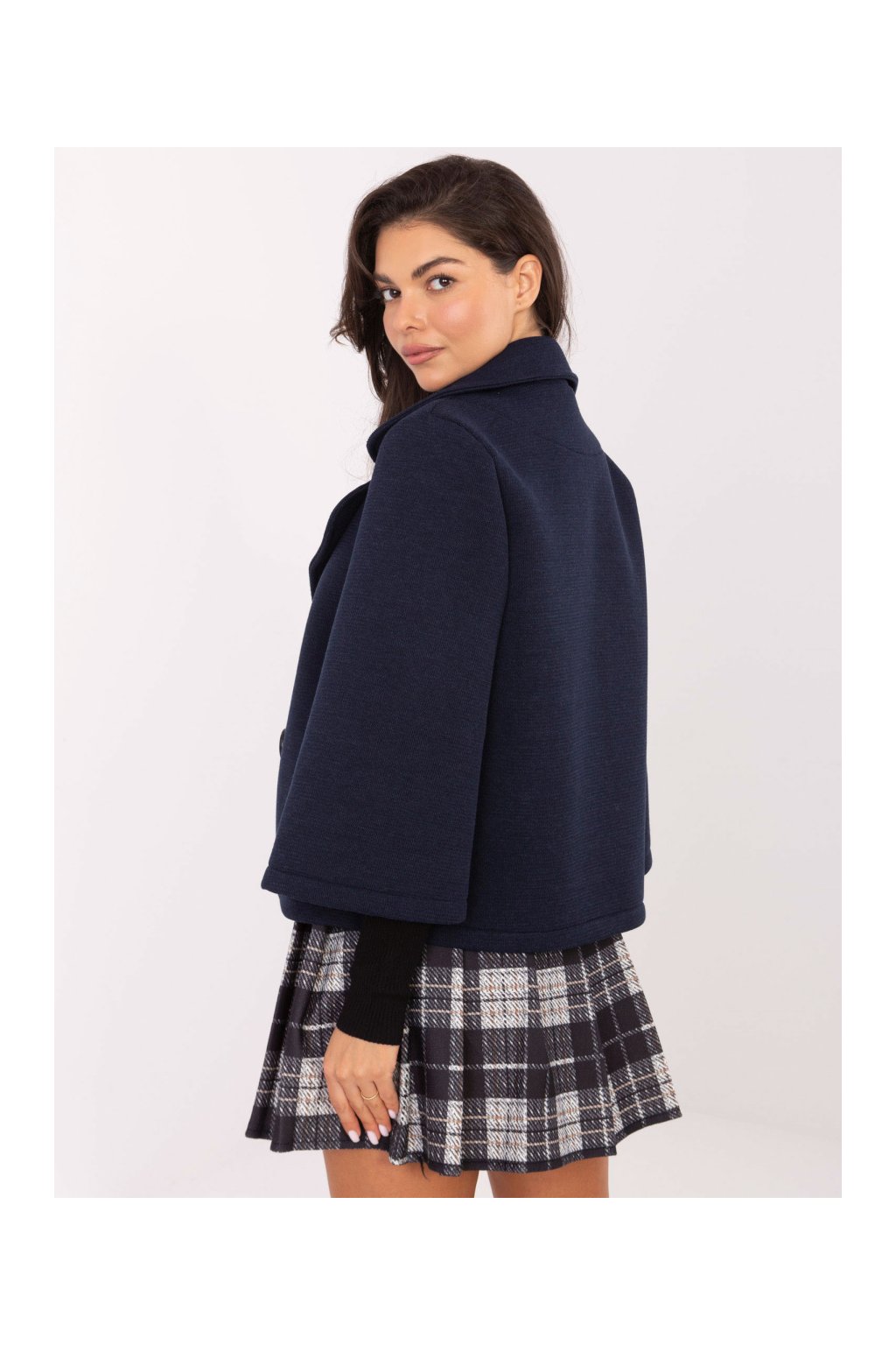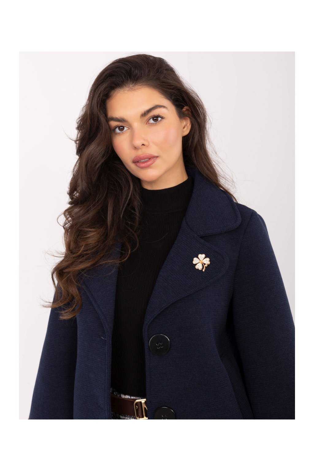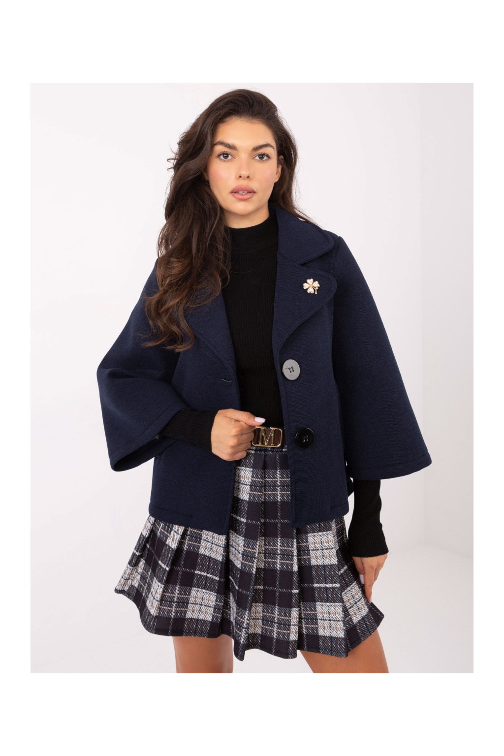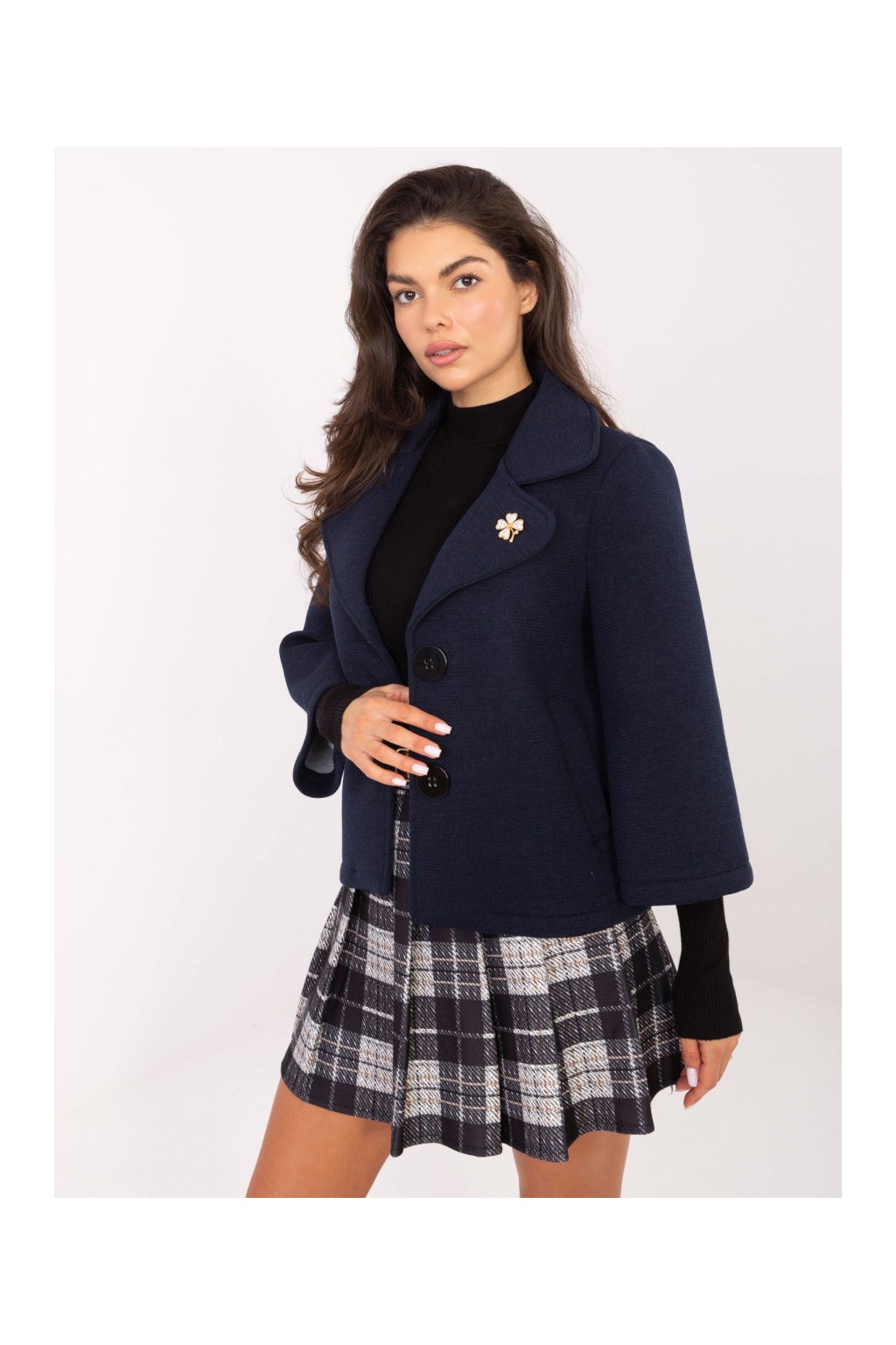 Elegantní podzimní kabátek širokého střihu do A v délce k bokům. Výrazný límec a klopy, na límci ozdobná brož. Tříčtvrteční rukávy, které se mírně rozšiřují. Vpředu kapsy, zapínání jednořadé na velké knoflíky. Bez zateplení.