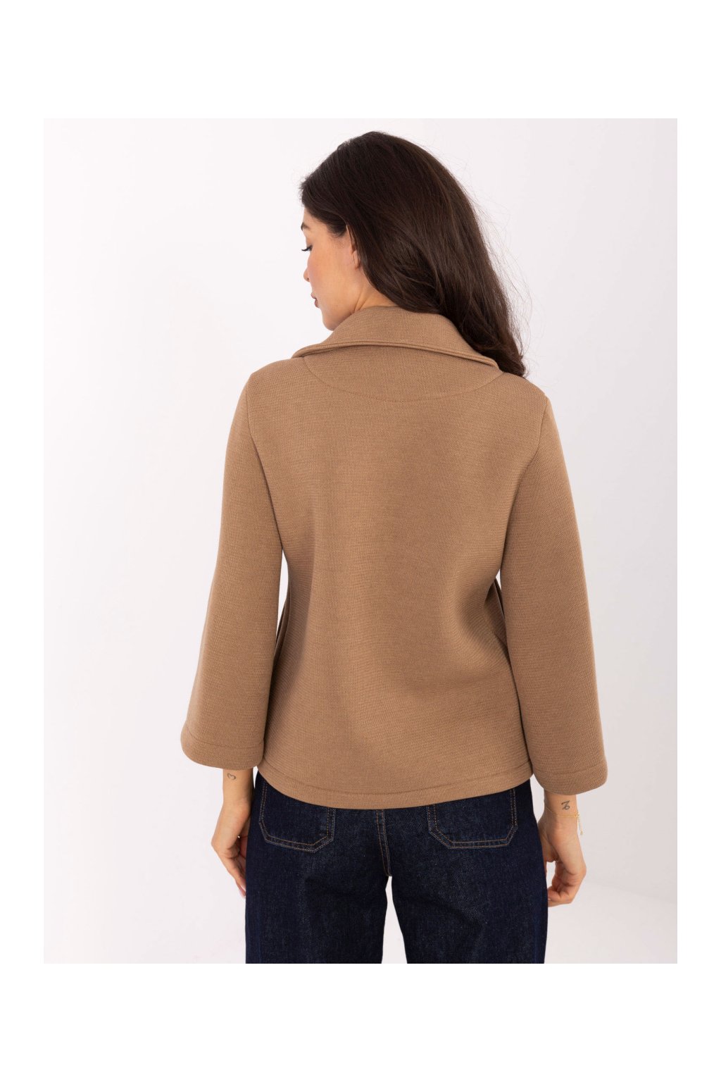 Výrazný límec s klopami dodává modelu osobitý charakter a šmrnc. Na límci nechybí ozdobná brož, která kabátku propůjčuje jemný nádech luxusu a originality. Tříčtvrteční rukávy se směrem dolů lehce rozšiřují, což působí velmi žensky a elegantně.