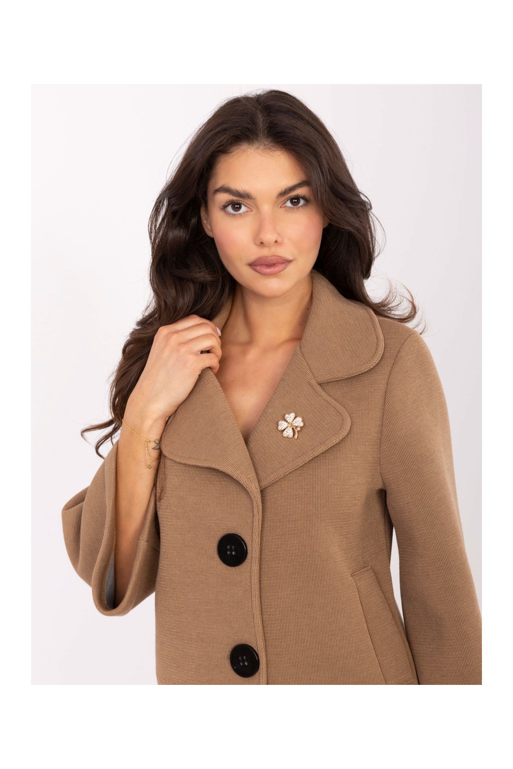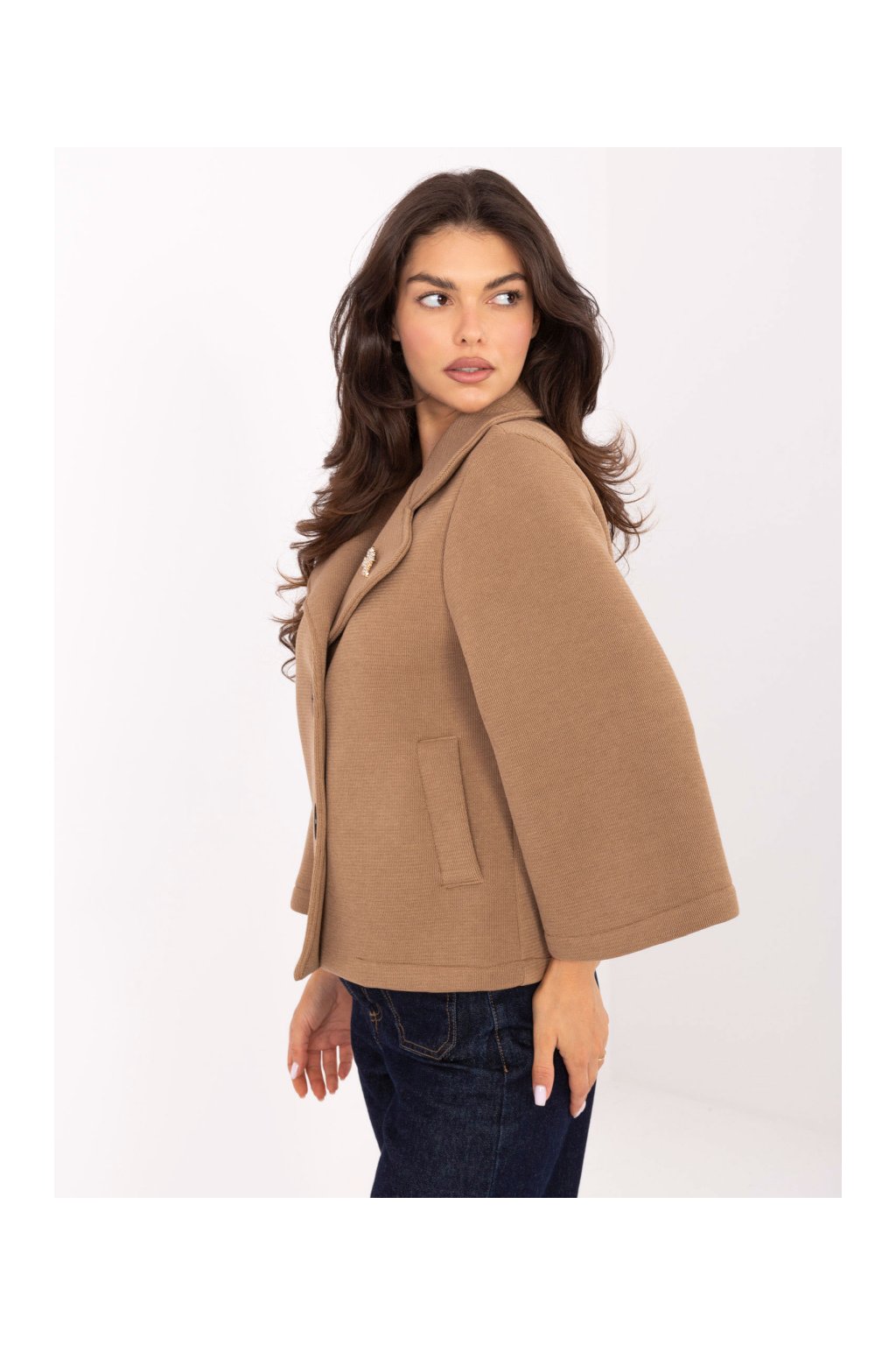 Elegantní podzimní kabátek širokého střihu do A v délce k bokům. Výrazný límec a klopy, na límci ozdobná brož. Tříčtvrteční rukávy, které se mírně rozšiřují. Vpředu kapsy, zapínání jednořadé na velké knoflíky. Bez zateplení.