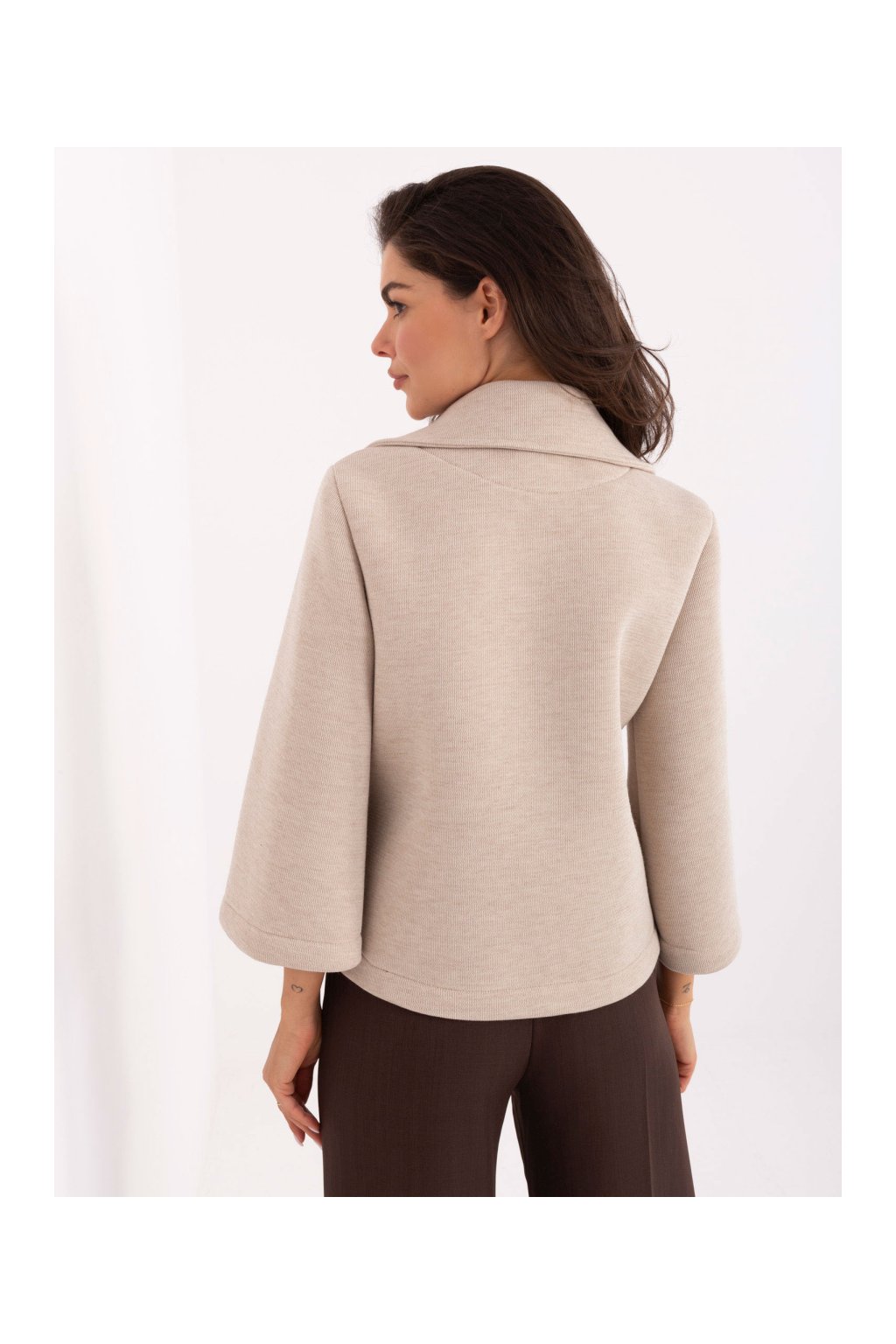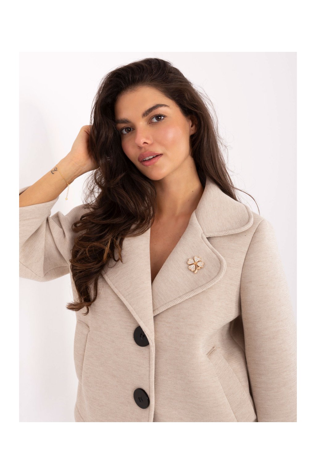 Výrazný límec s klopami dodává modelu osobitý charakter a šmrnc. Na límci nechybí ozdobná brož, která kabátku propůjčuje jemný nádech luxusu a originality. Tříčtvrteční rukávy se směrem dolů lehce rozšiřují, což působí velmi žensky a elegantně.