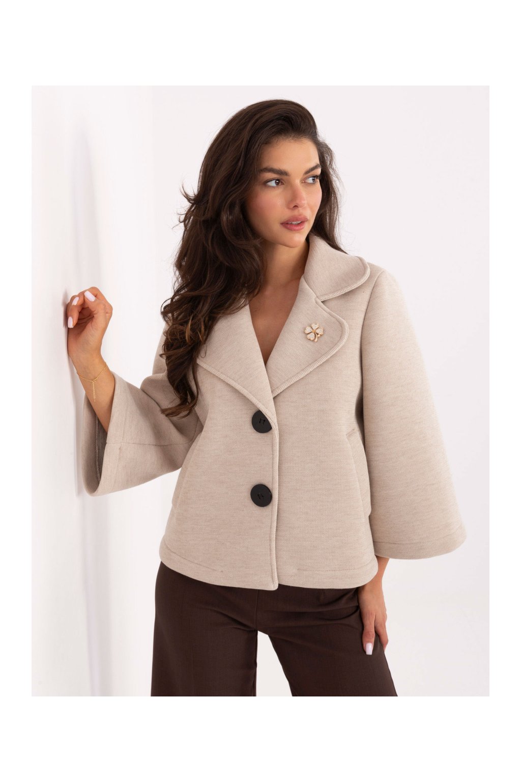 Elegantní podzimní kabátek širokého střihu do A v délce k bokům. Výrazný límec a klopy, na límci ozdobná brož. Tříčtvrteční rukávy, které se mírně rozšiřují. Vpředu kapsy, zapínání jednořadé na velké knoflíky. Bez zateplení.