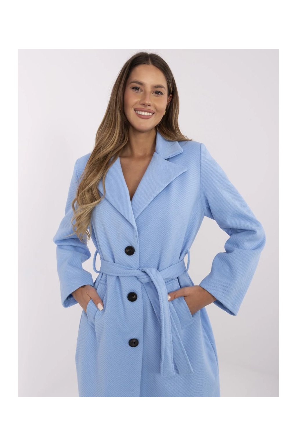 Elegantní flaušový kabát klasického střihu v délce nad kolena, jednořadé zapínání na tři knoflíky, klopy, v pase pásek na zavázání, postranní kapsy. S podšívkou.