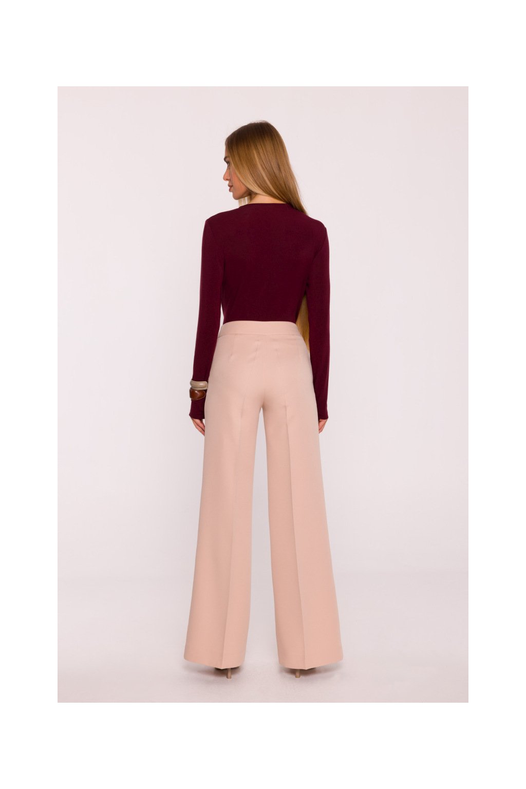 Společenské kalhoty klasického střihu. Středně vysoký pas, úzké přes boky, široké nohavice s výraznými puky. Zapínání knoflík a skrytý zip, postranní kapsy. Hladký materiál s matným povrchem.