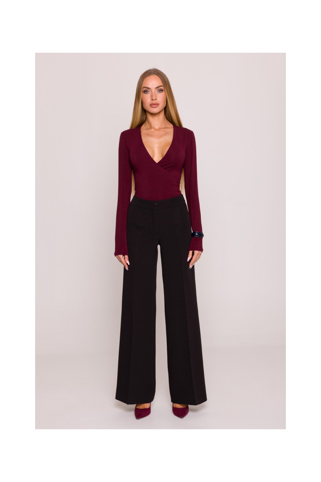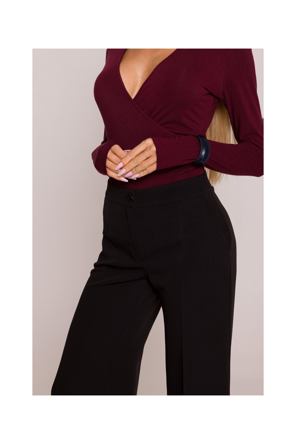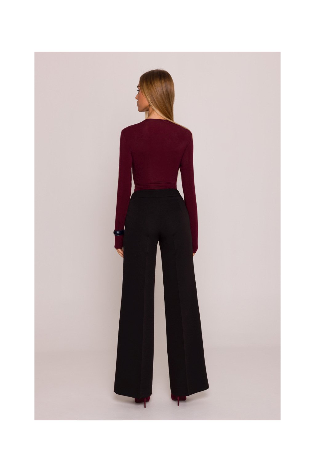 Společenské kalhoty klasického střihu. Středně vysoký pas, úzké přes boky, široké nohavice s výraznými puky. Zapínání knoflík a skrytý zip, postranní kapsy. Hladký materiál s matným povrchem.