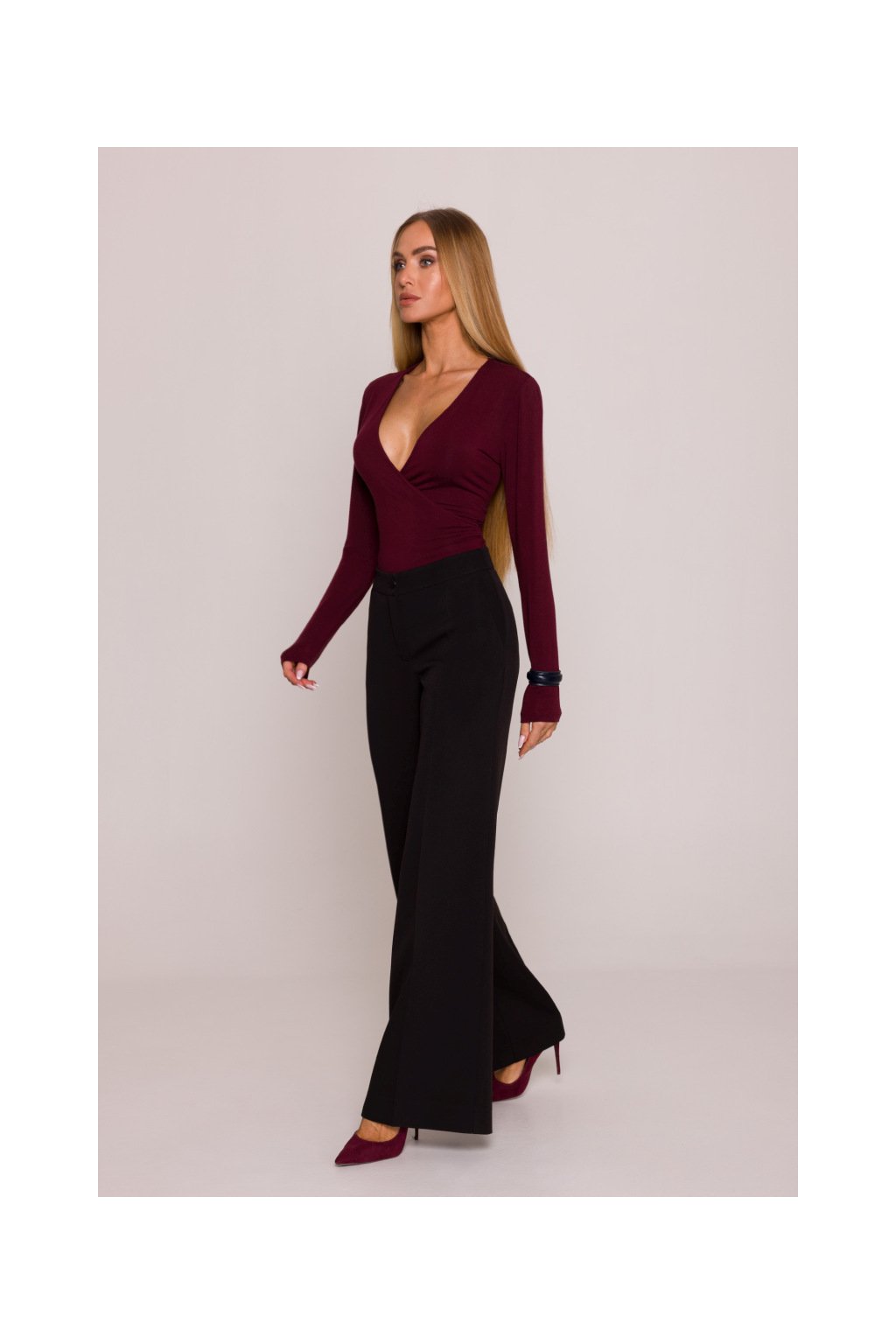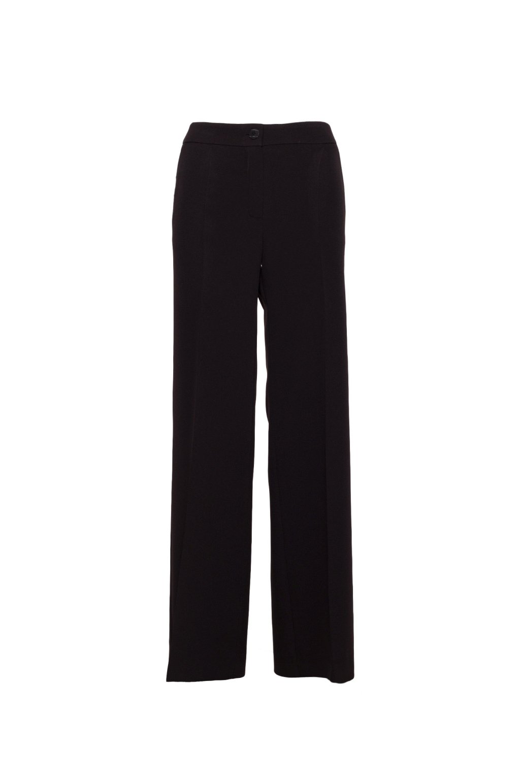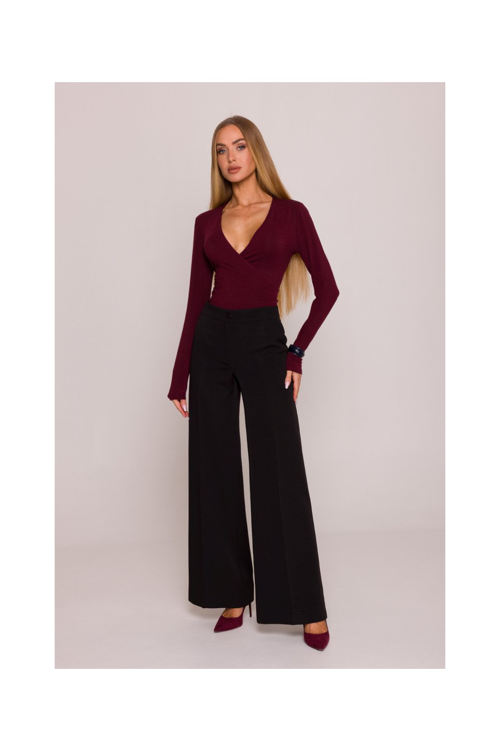 Společenské kalhoty klasického střihu. Středně vysoký pas, úzké přes boky, široké nohavice s výraznými puky. Zapínání knoflík a skrytý zip, postranní kapsy. Hladký materiál s matným povrchem.