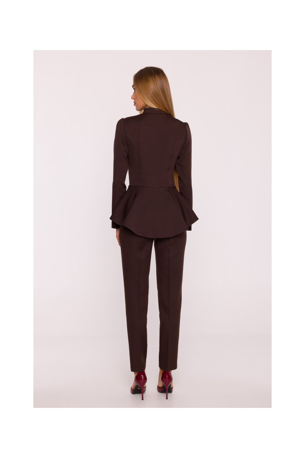 Zdůrazněný pas s peplum volánem opticky tvaruje postavu a přidává šmrnc, zatímco úzké nohavice s puky dodávají outfitu elegantní a uhlazený vzhled. Ideální volba pro večerní akce, slavnostní příležitosti i formální setkání, kde chcete vyniknout svým stylem a vkusem.