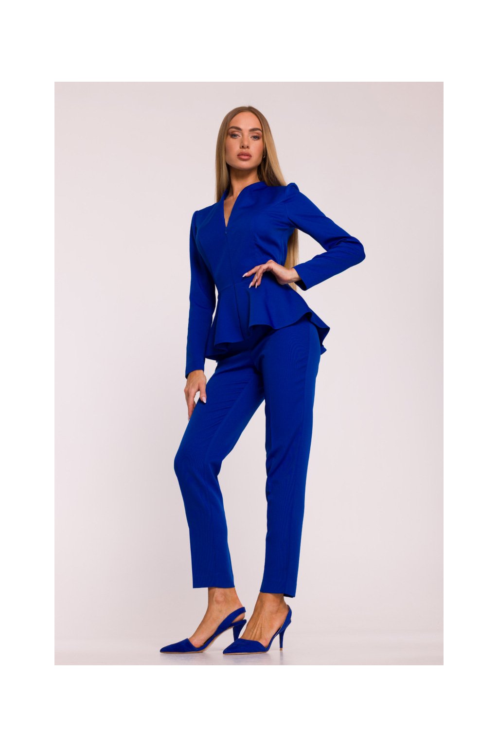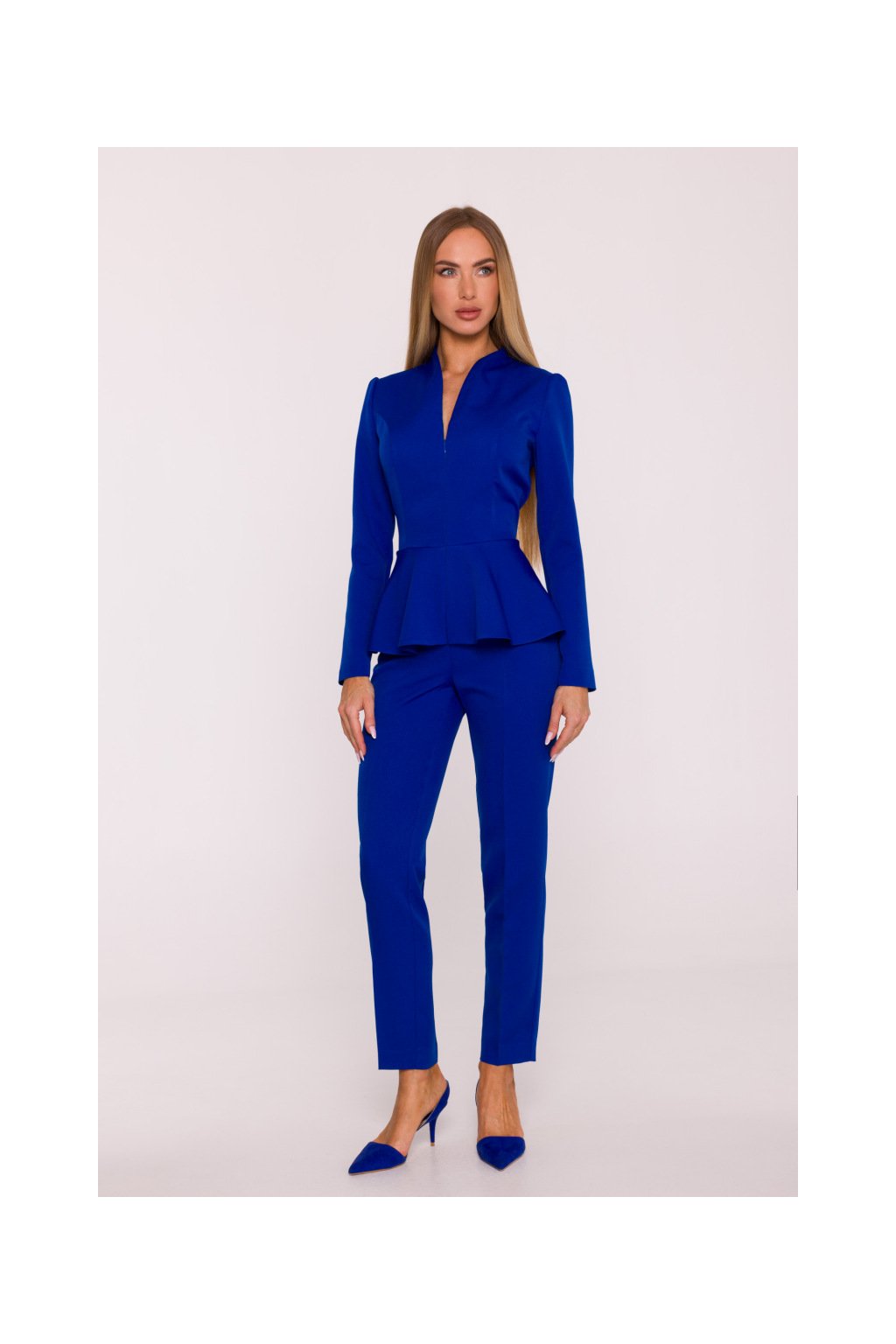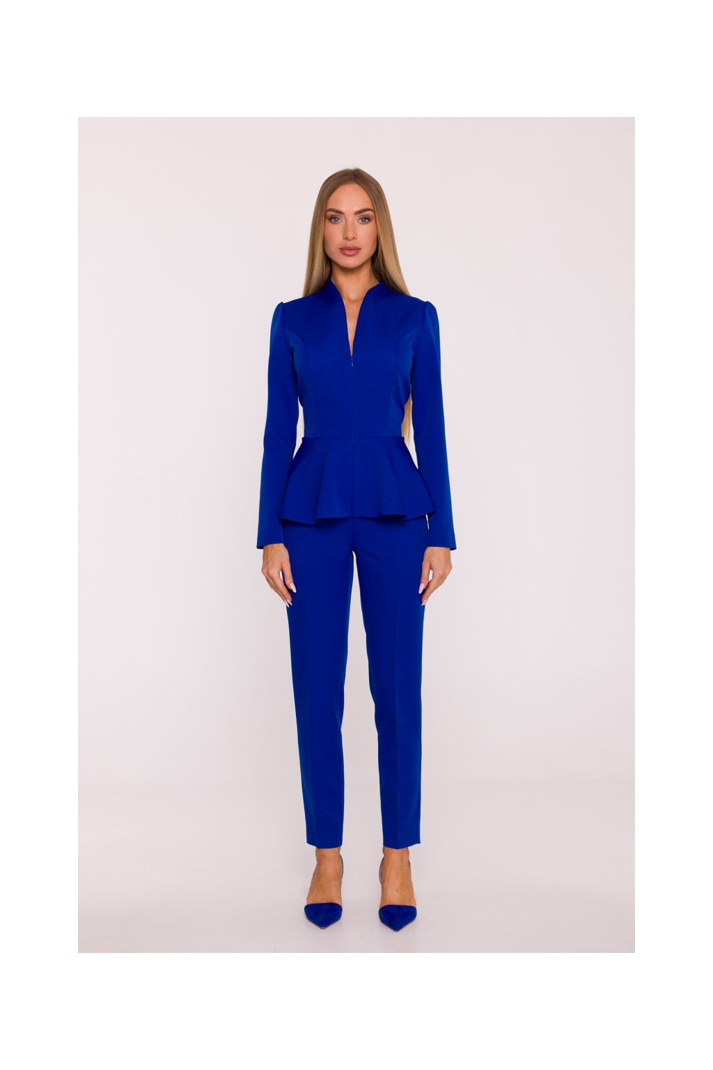 Zdůrazněný pas s peplum volánem opticky tvaruje postavu a přidává šmrnc, zatímco úzké nohavice s puky dodávají outfitu elegantní a uhlazený vzhled. Ideální volba pro večerní akce, slavnostní příležitosti i formální setkání, kde chcete vyniknout svým stylem a vkusem.