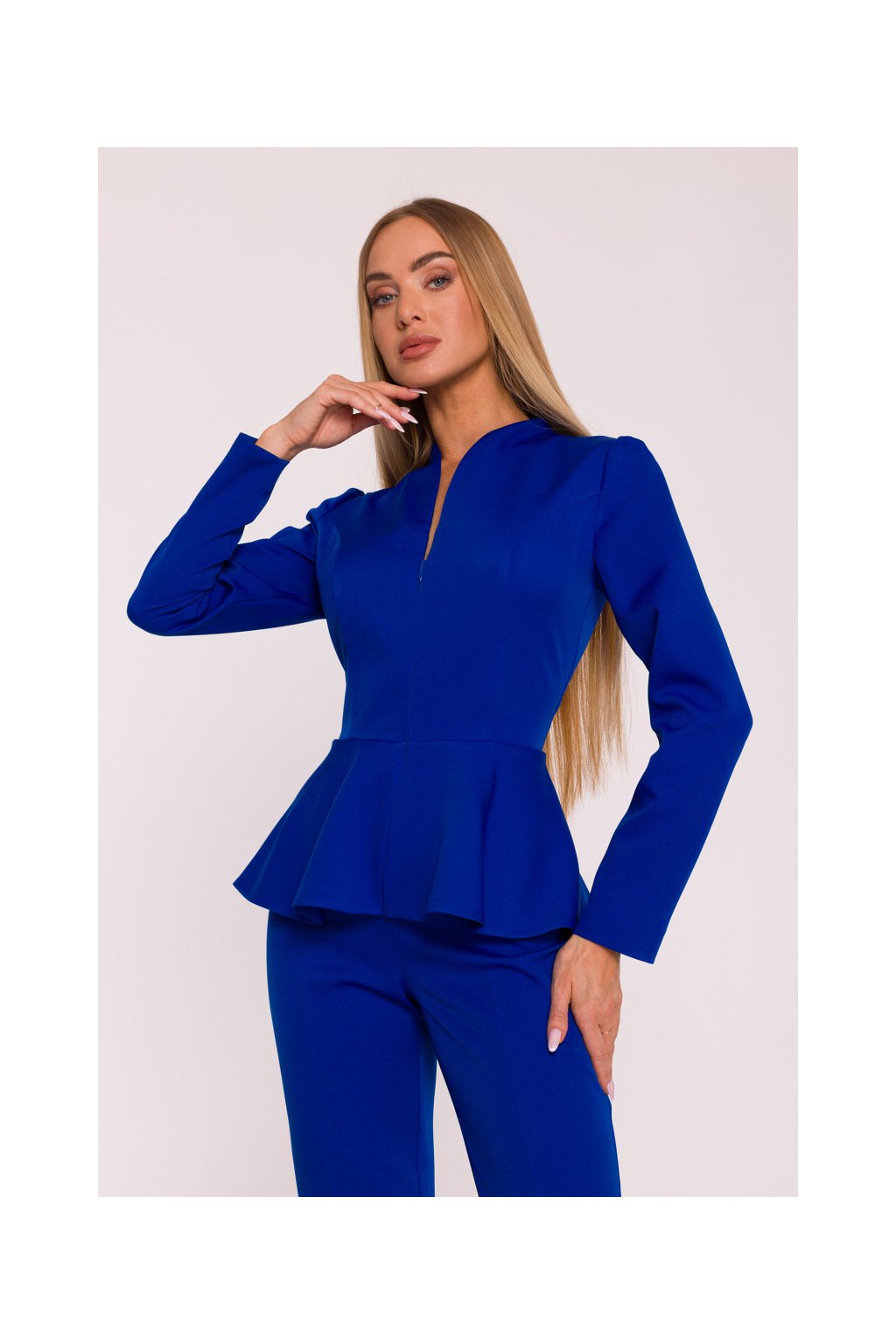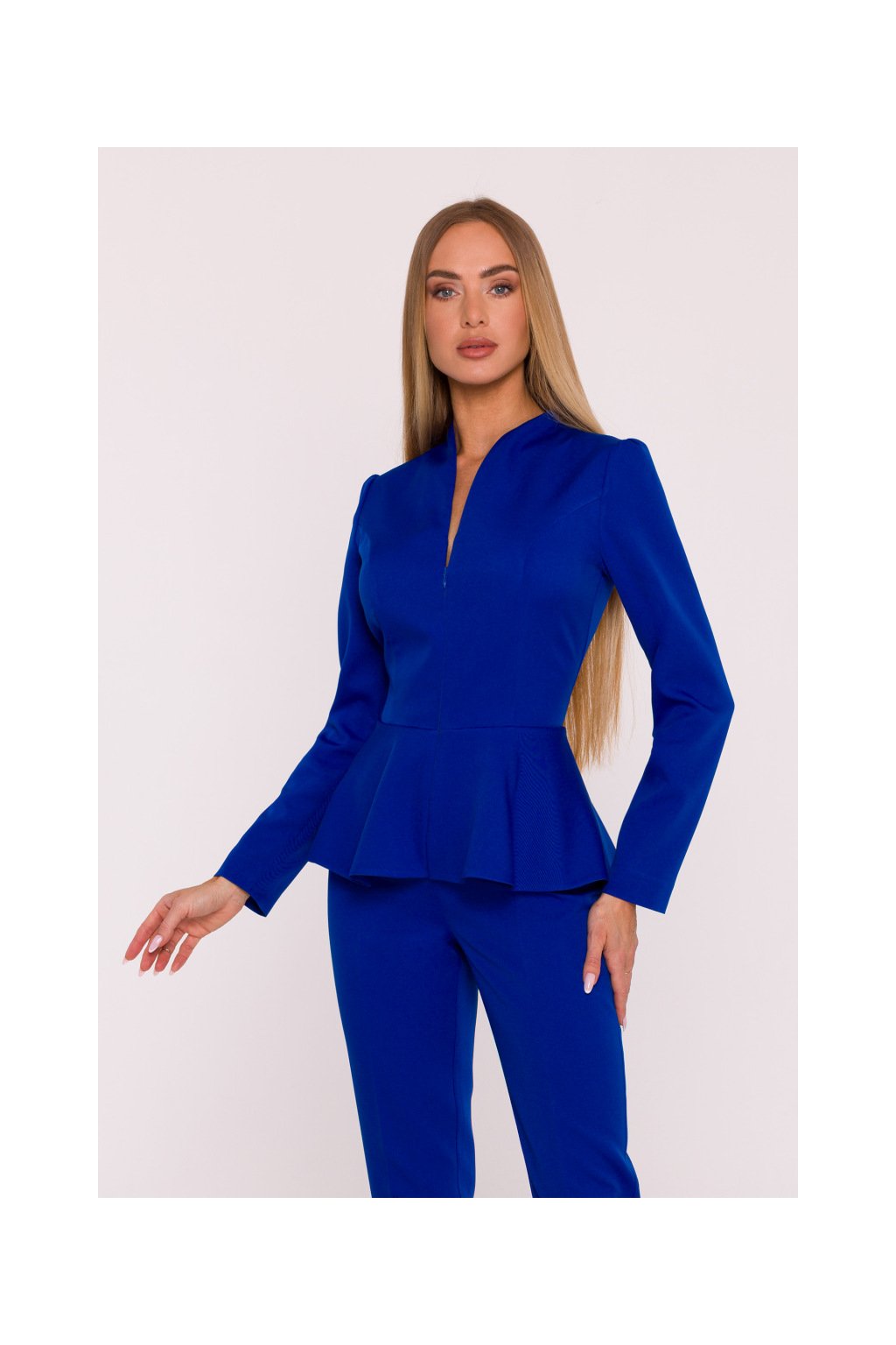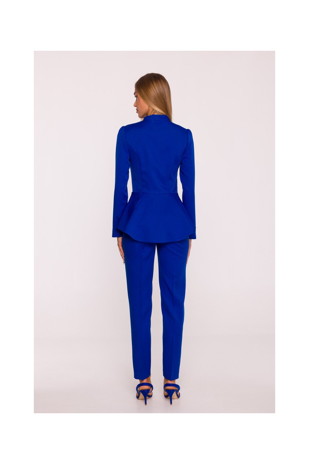 Zdůrazněný pas s peplum volánem opticky tvaruje postavu a přidává šmrnc, zatímco úzké nohavice s puky dodávají outfitu elegantní a uhlazený vzhled. Ideální volba pro večerní akce, slavnostní příležitosti i formální setkání, kde chcete vyniknout svým stylem a vkusem.
