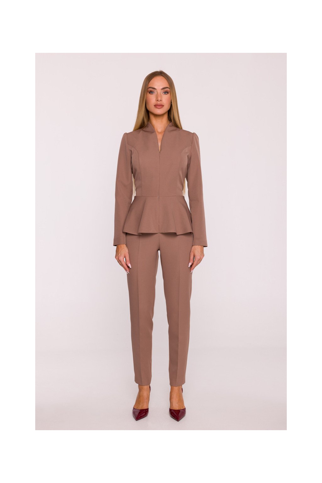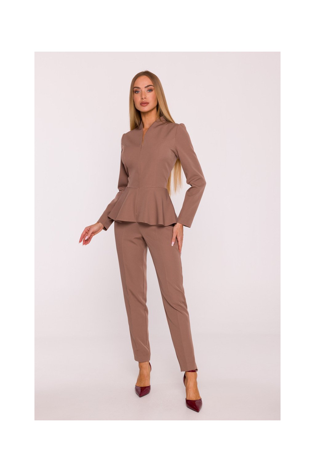 Zdůrazněný pas s peplum volánem opticky tvaruje postavu a přidává šmrnc, zatímco úzké nohavice s puky dodávají outfitu elegantní a uhlazený vzhled. Ideální volba pro večerní akce, slavnostní příležitosti i formální setkání, kde chcete vyniknout svým stylem a vkusem.
