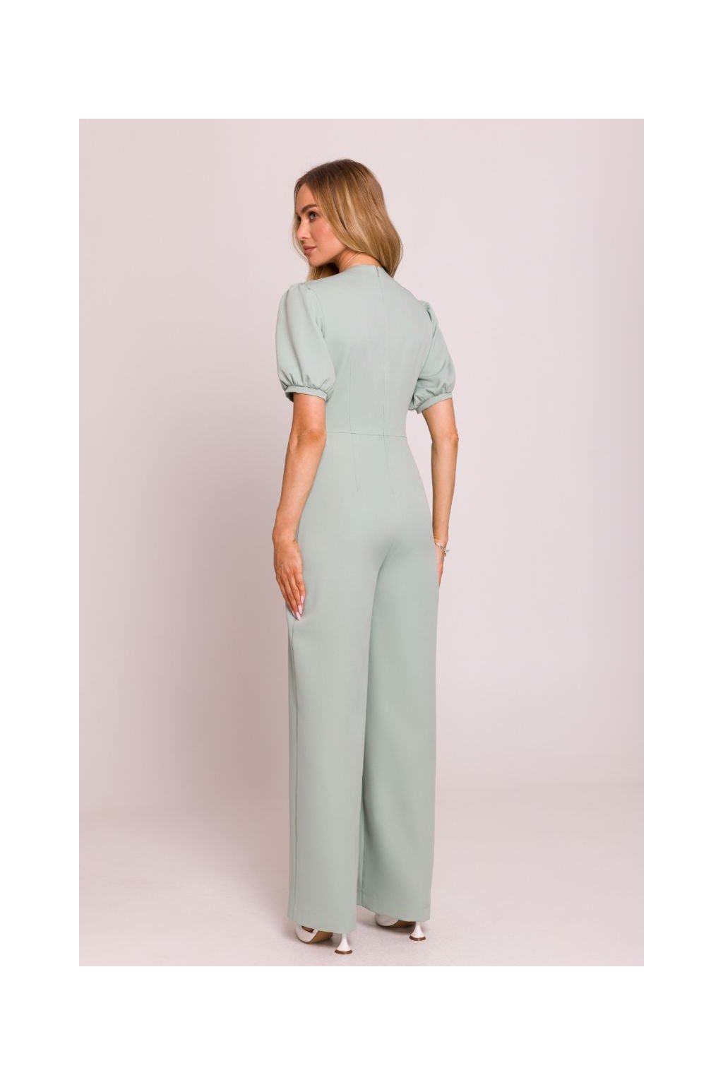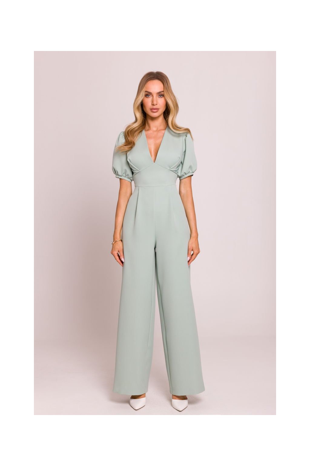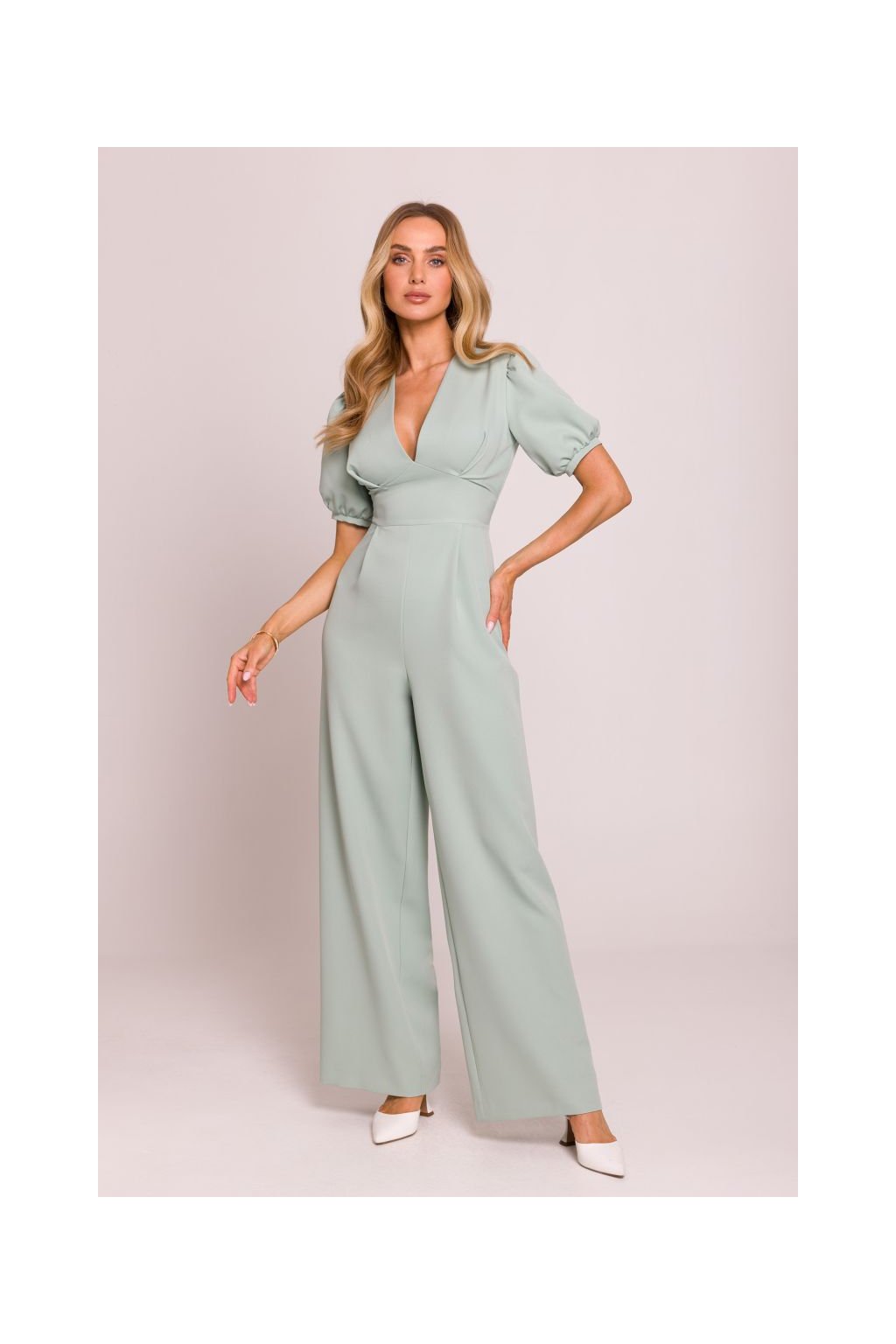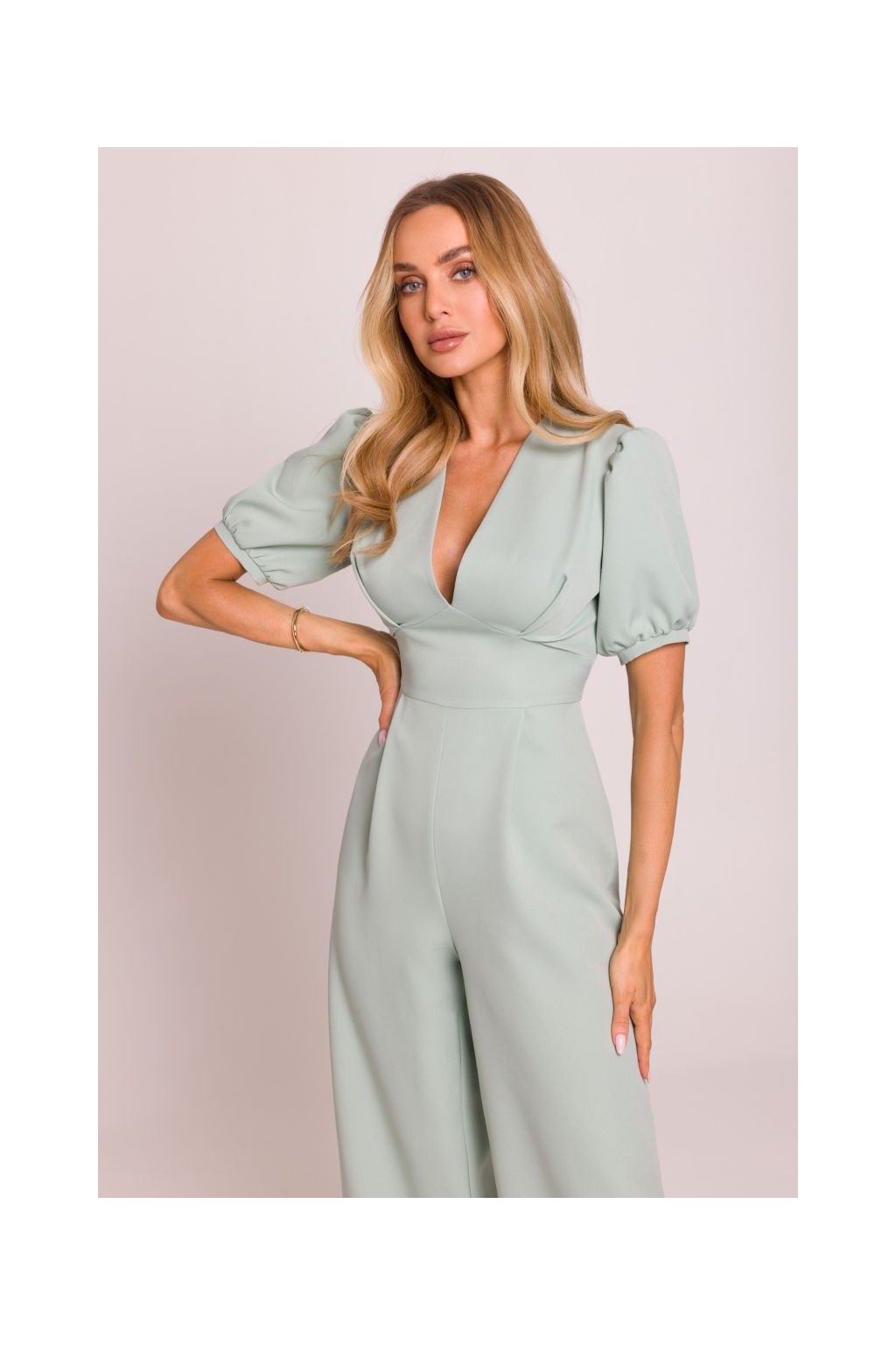 Nepřehlédnutelný společenský overal na léto či zimní plesy. Top s vysokým zdůrazněným pasem a záševky, hlubokým výstřihem do V, krátké balonové rukávy, široké nohavice, zapínání na zip na zádech. Částečně podšitý.