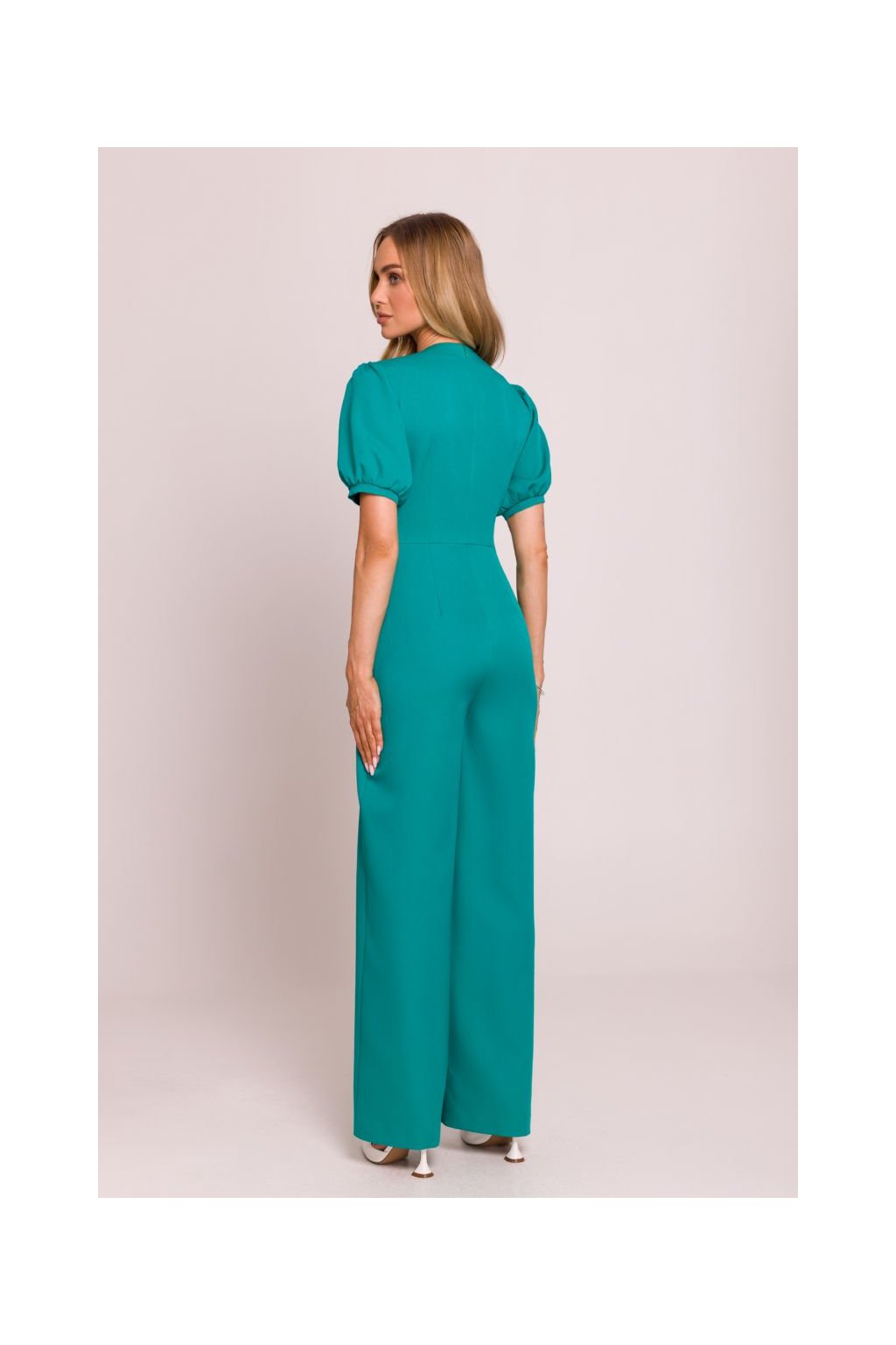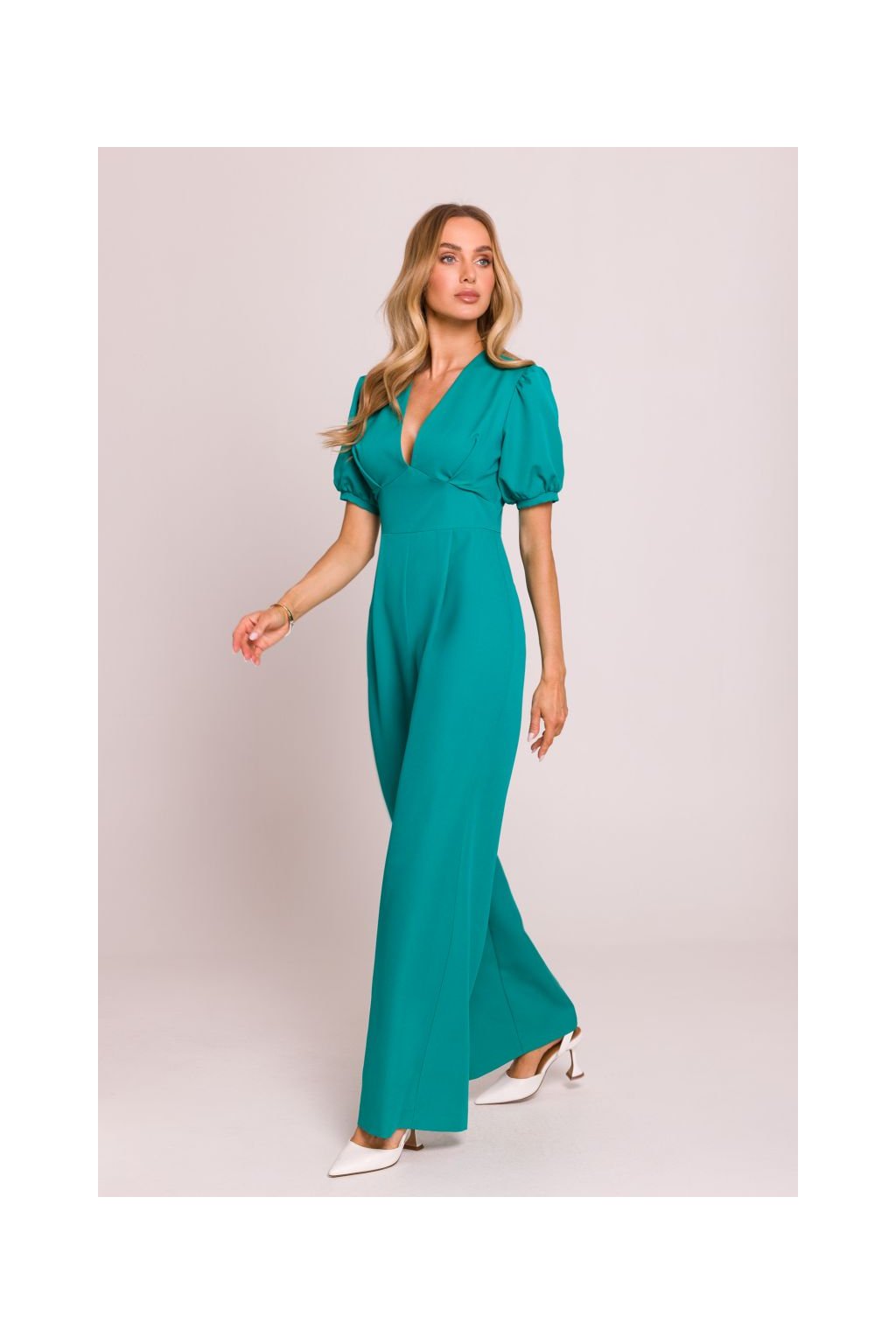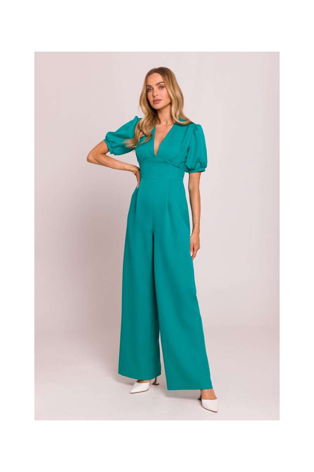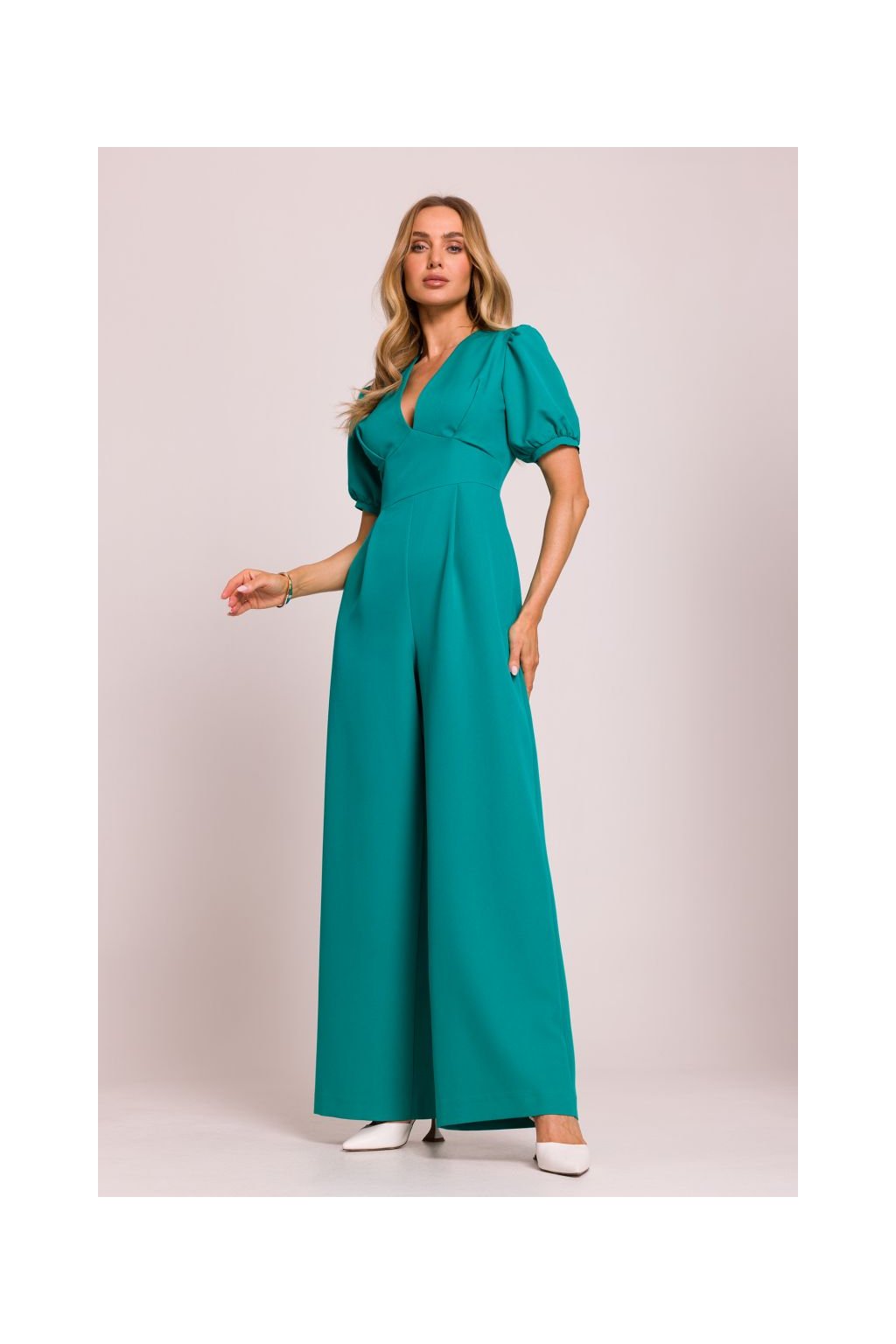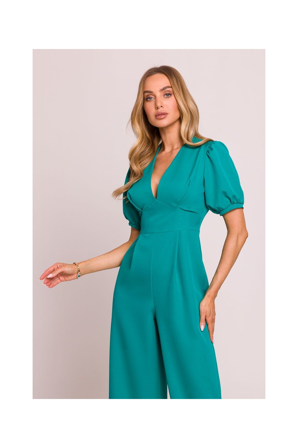Nepřehlédnutelný společenský overal na léto či zimní plesy. Top s vysokým zdůrazněným pasem a záševky, hlubokým výstřihem do V, krátké balonové rukávy, široké nohavice, zapínání na zip na zádech. Částečně podšitý.