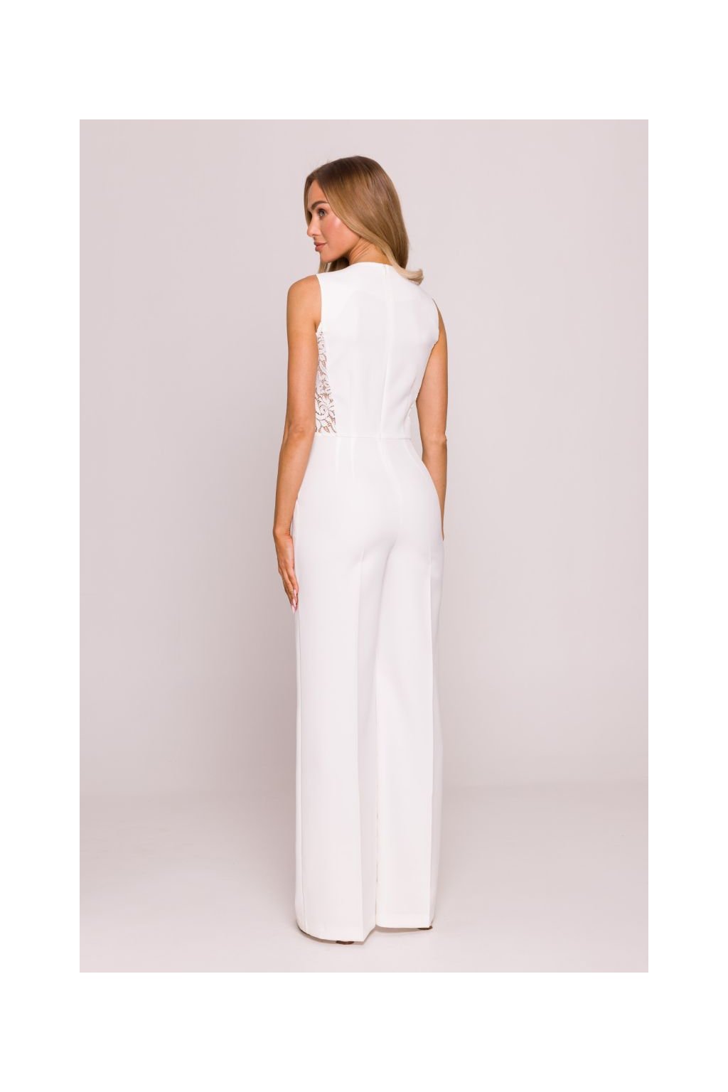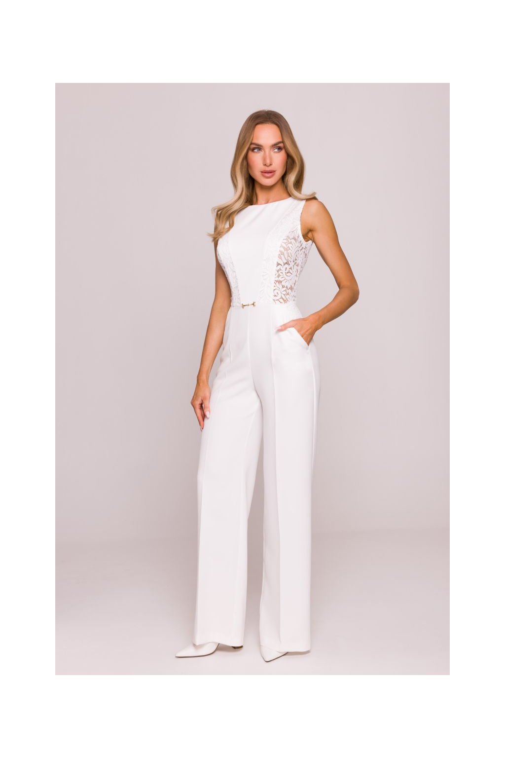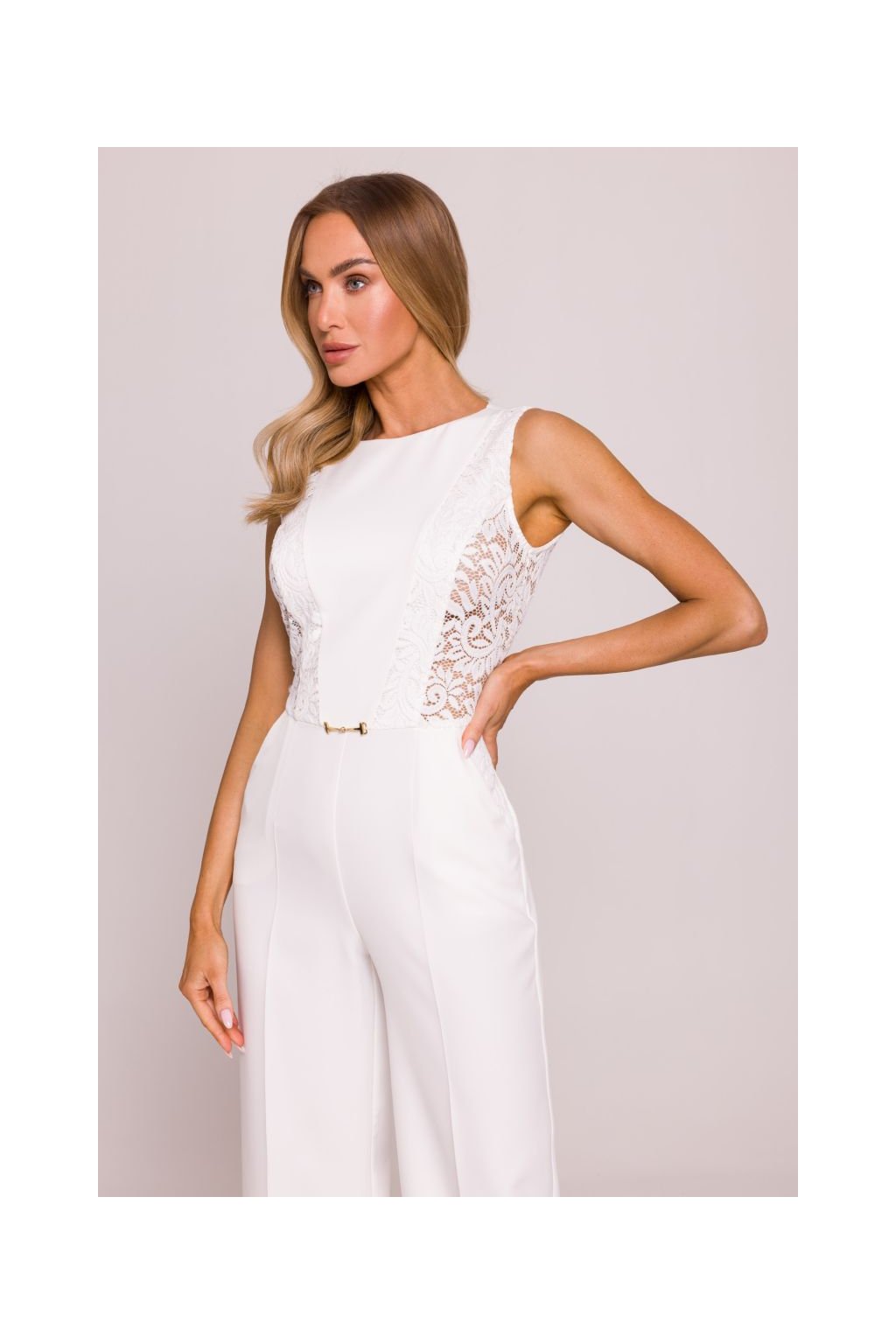 Nepřehlédnutelný společenský overal s krajkovými vsadkami, které opticky tvarují postavu. Úzký top bez rukávů s kulatým výstřihem. Pas zdůrazněný kovovou ozdobou. Široké splývavé nohavice s výraznými puky. Zapínání na skrytý zip na zádech.