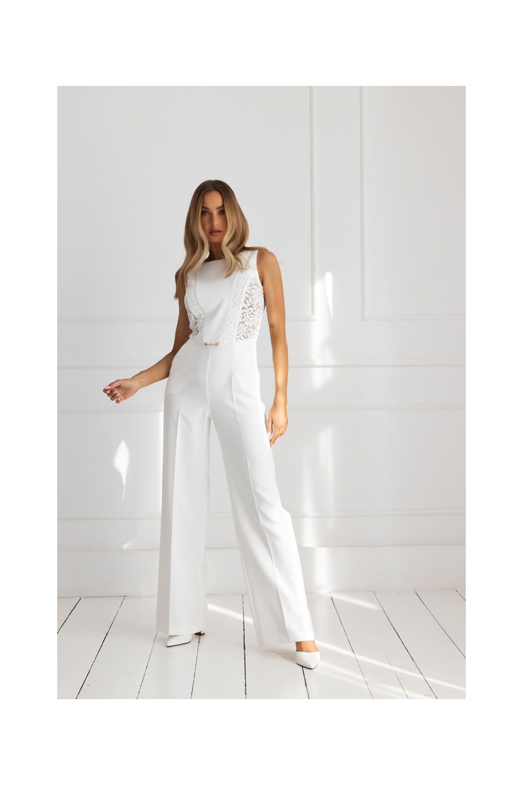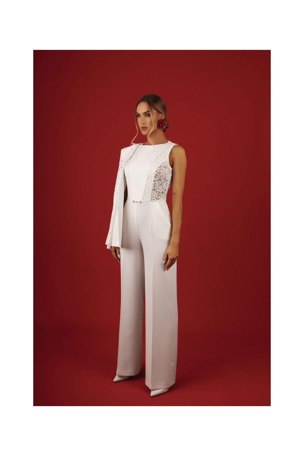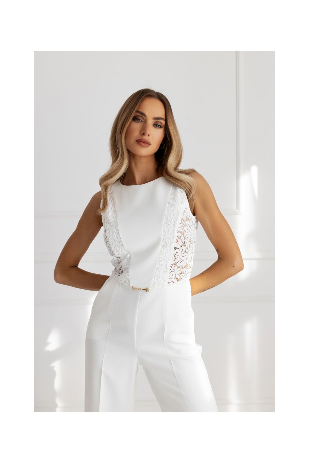 Nepřehlédnutelný společenský overal s krajkovými vsadkami, které opticky tvarují postavu. Úzký top bez rukávů s kulatým výstřihem. Pas zdůrazněný kovovou ozdobou. Široké splývavé nohavice s výraznými puky. Zapínání na skrytý zip na zádech.