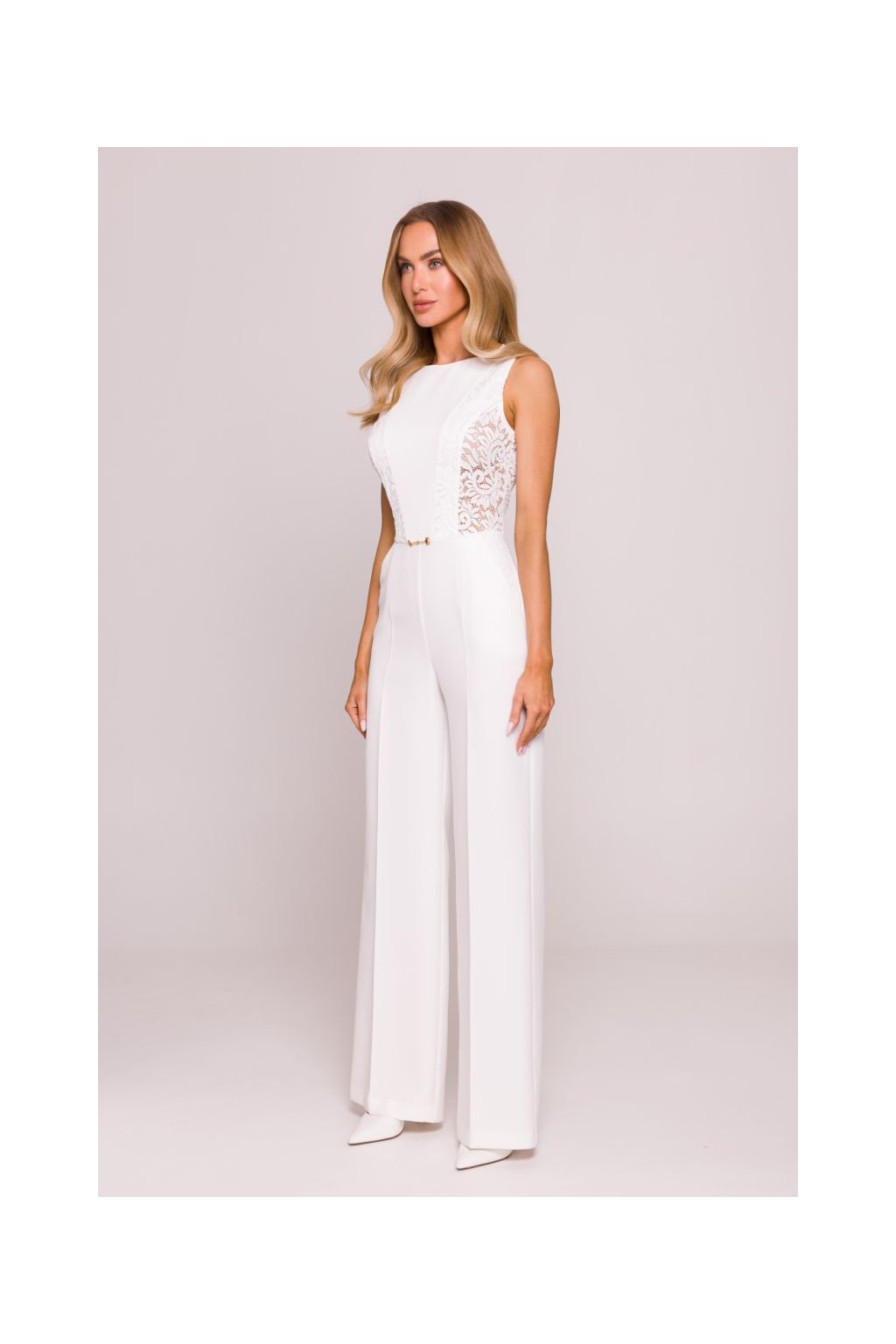 Elegantní společenský overal s krajkou MOE M866 smetanový