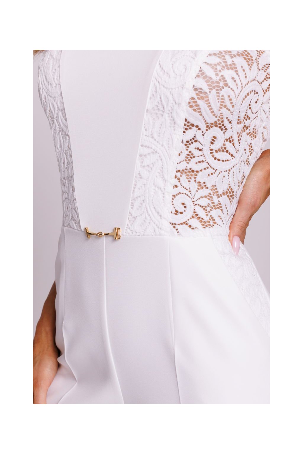 Jedním z nejvýraznějších prvků tohoto overalu jsou krajkové vsadky, které nejen zaujmou na první pohled, ale rovněž opticky tvarují postavu. Krajka je umístěna strategicky tak, aby podtrhla ženské křivky, vytvářela iluzi štíhlejšího pasu a současně přidala outfitu nádech noblesy. Overal tak působí velmi čistě a zároveň promyšleně. Pas je opticky zdůrazněn kovovou ozdobou, která rozbíjí jednolitost barvy.