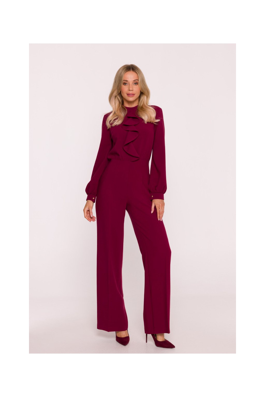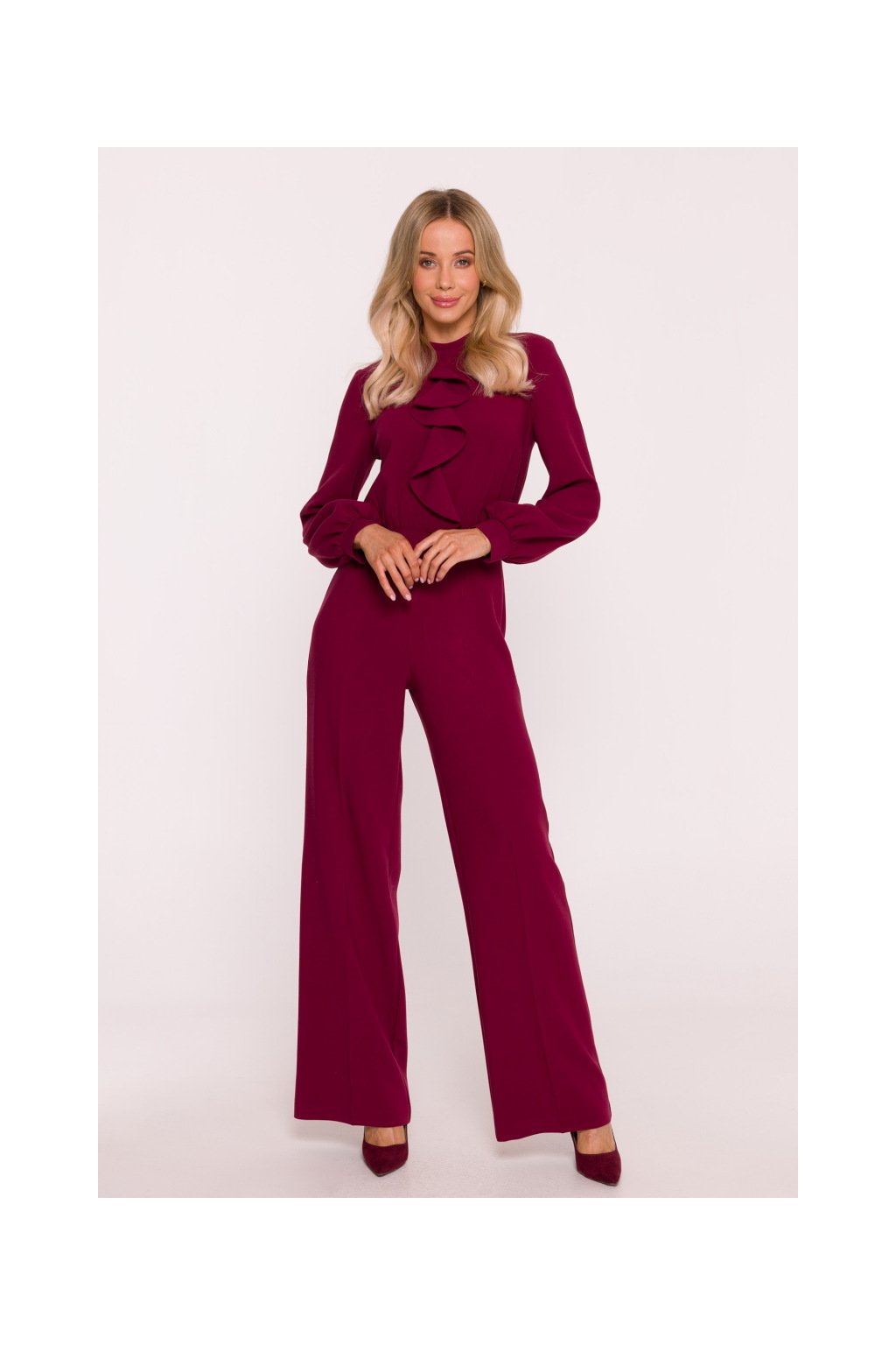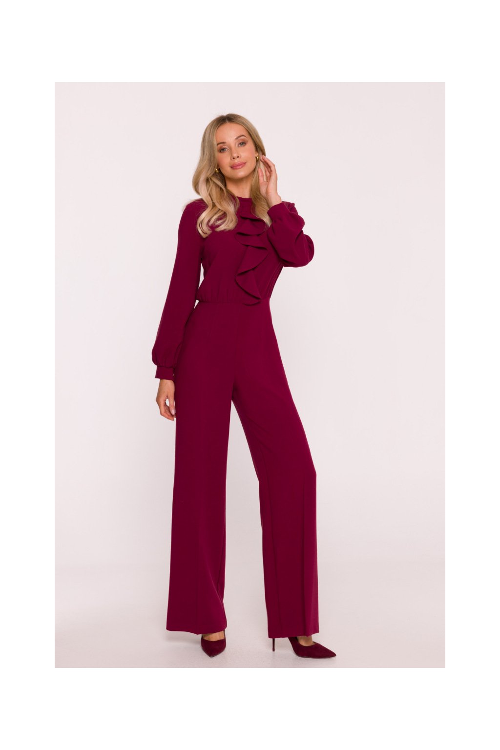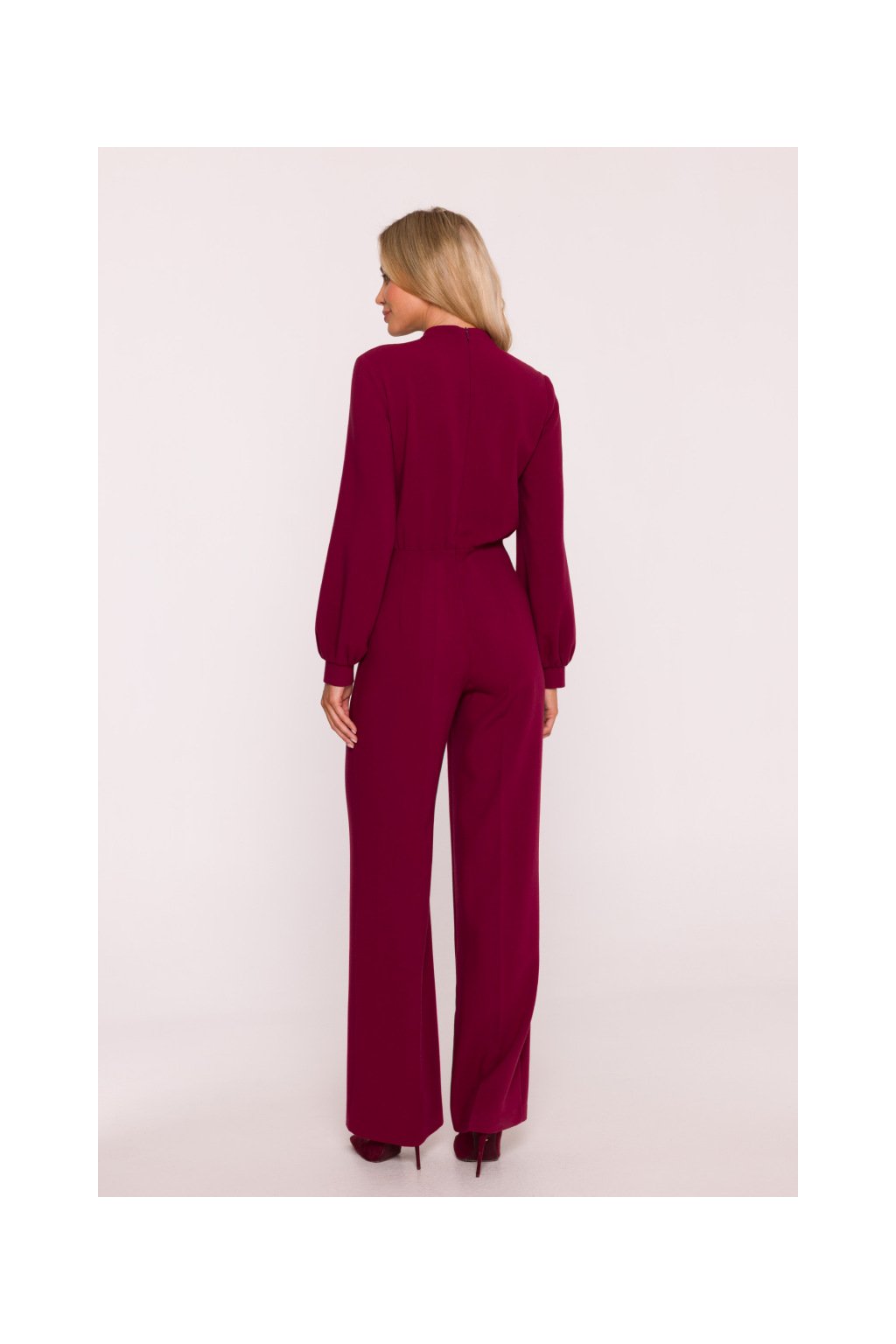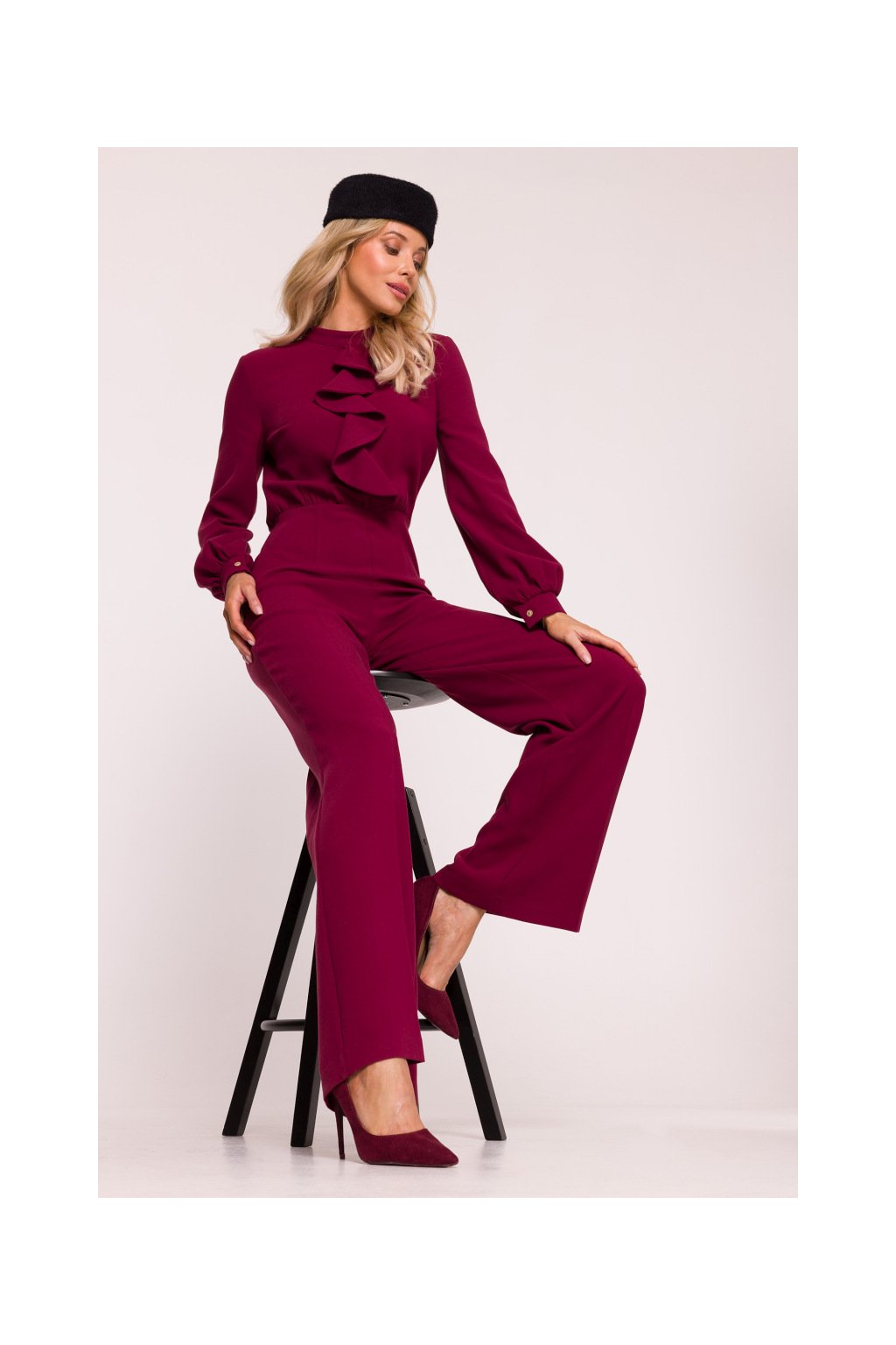 Overal má přiléhavý top, který krásně kopíruje siluetu těla. Výrazným prvkem jsou nabrané rukávy, které dodávají modelu ženskost a nádech romantiky. Rukávy jsou zakončené úzkou manžetou na drobný knoflíček, což podtrhuje sofistikovaný vzhled. U krku je vysoký stojáček, který působí velmi elegantně a opticky prodlužuje krk. Jedním z dominantních detailů topu je velké fiží, které se stává nepřehlédnutelným módním akcentem. Tento prvek dodává overalům nádech luxusu a originality. Je ideální pro ženy, které si potrpí na neotřelé detaily a chtějí vyniknout v davu. Overal je navržen s vysokým pasem, který krásně tvaruje postavu a opticky prodlužuje nohy. Široké nohavice s elegantními puky vytvářejí efektní siluetu a zajišťují maximální pohodlí při pohybu. Tento střih lichotí většině postav a umožňuje kombinovat overal s různými typy obuvi – od podpatků po elegantní baleríny. Model je vybaven praktickým zapínáním na skrytý zip na zádech, díky čemuž zůstává silueta čistá, nerušená zipem nebo knoflíky na přední straně. Tento detail přispívá k celkově uhlazenému dojmu z modelu.