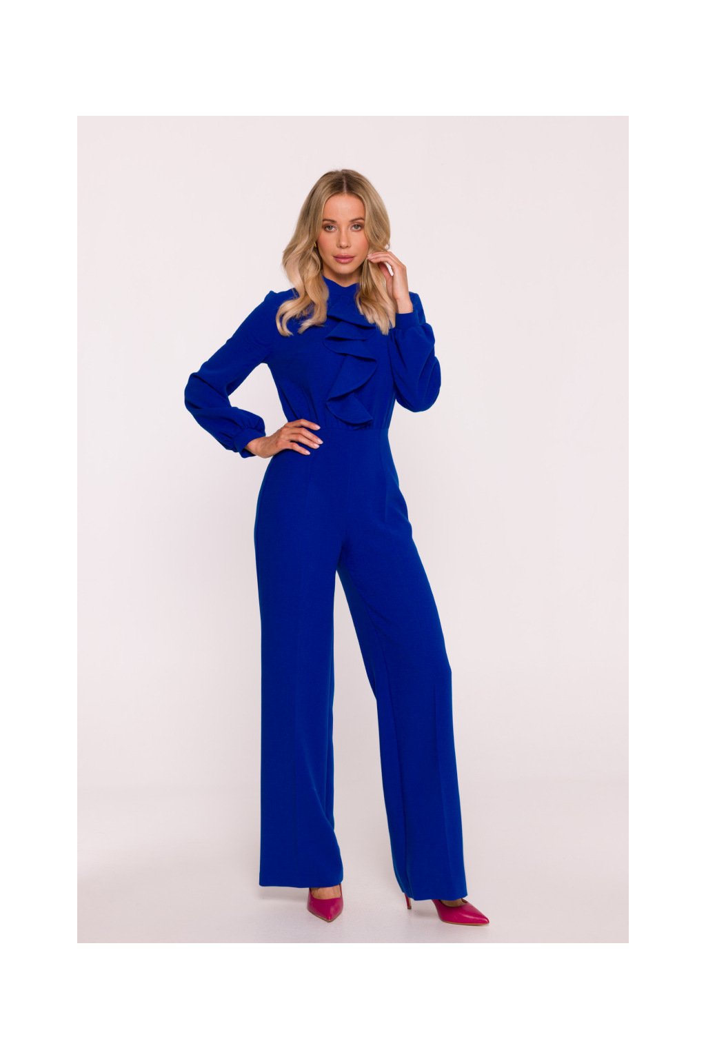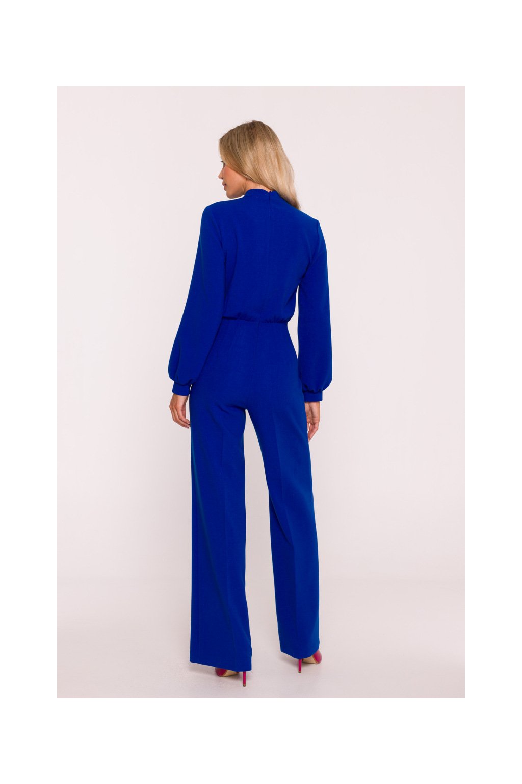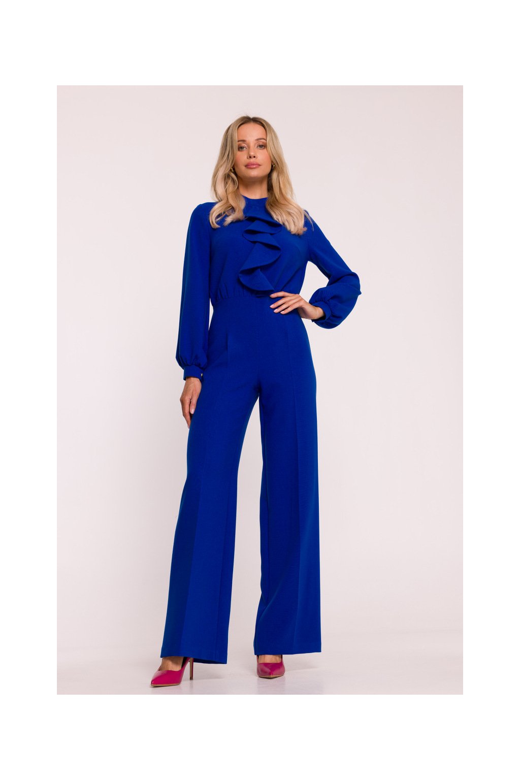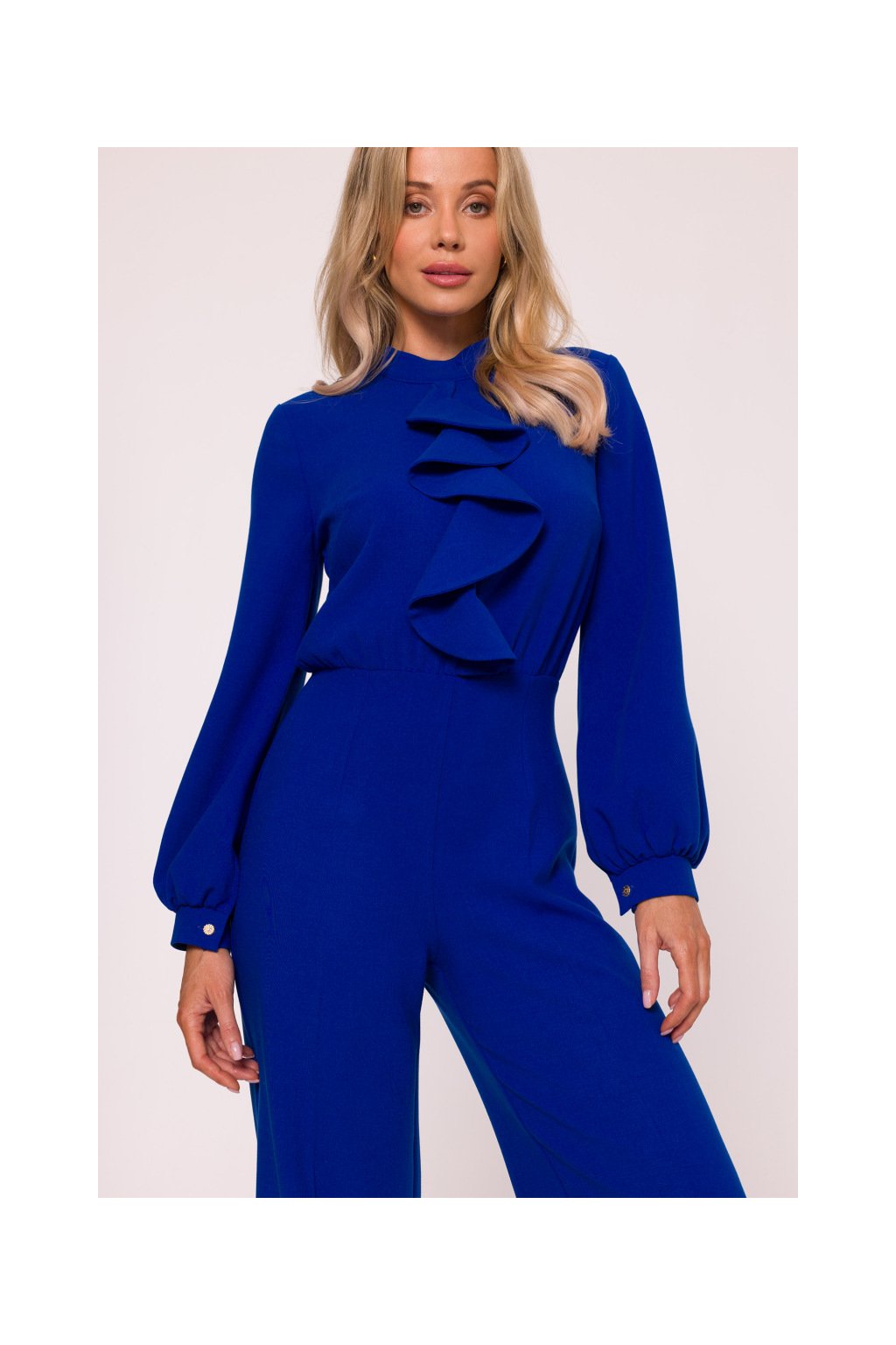Overal má přiléhavý top, který krásně kopíruje siluetu těla. Výrazným prvkem jsou nabrané rukávy, které dodávají modelu ženskost a nádech romantiky. Rukávy jsou zakončené úzkou manžetou na drobný knoflíček, což podtrhuje sofistikovaný vzhled. U krku je vysoký stojáček, který působí velmi elegantně a opticky prodlužuje krk. Jedním z dominantních detailů topu je velké fiží, které se stává nepřehlédnutelným módním akcentem. Tento prvek dodává overalům nádech luxusu a originality. Je ideální pro ženy, které si potrpí na neotřelé detaily a chtějí vyniknout v davu. Overal je navržen s vysokým pasem, který krásně tvaruje postavu a opticky prodlužuje nohy. Široké nohavice s elegantními puky vytvářejí efektní siluetu a zajišťují maximální pohodlí při pohybu. Tento střih lichotí většině postav a umožňuje kombinovat overal s různými typy obuvi – od podpatků po elegantní baleríny. Model je vybaven praktickým zapínáním na skrytý zip na zádech, díky čemuž zůstává silueta čistá, nerušená zipem nebo knoflíky na přední straně. Tento detail přispívá k celkově uhlazenému dojmu z modelu.