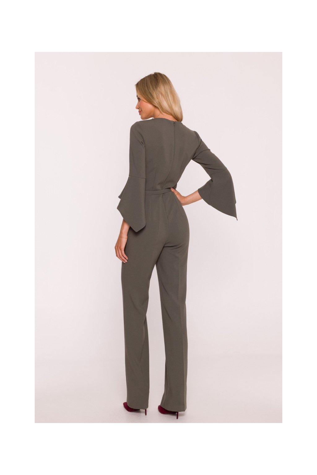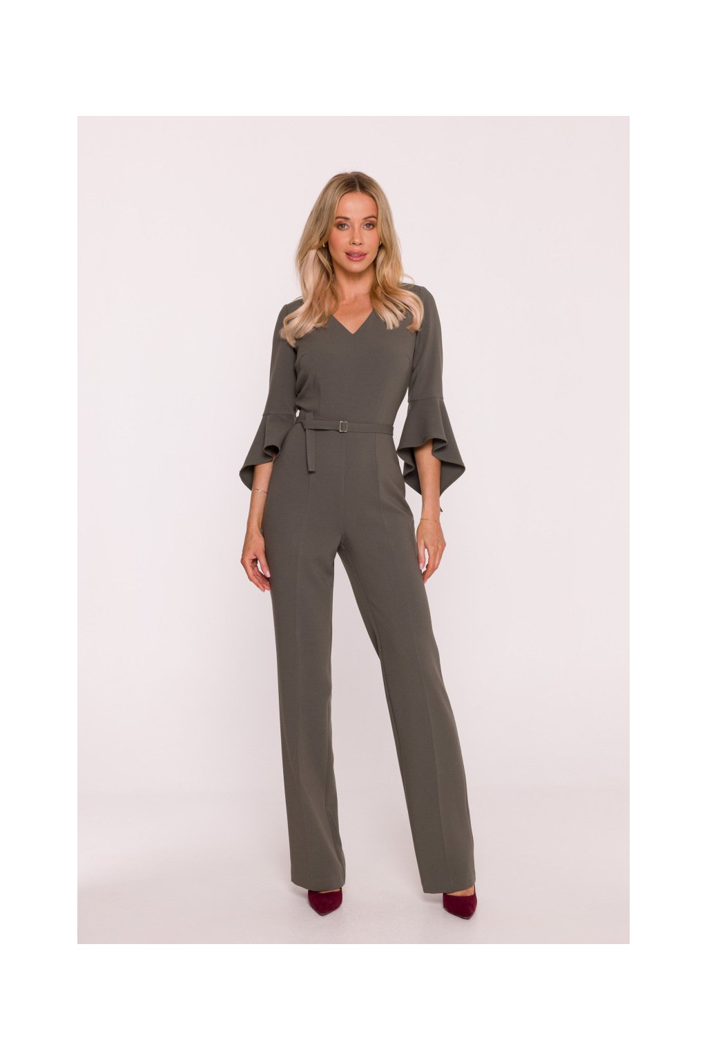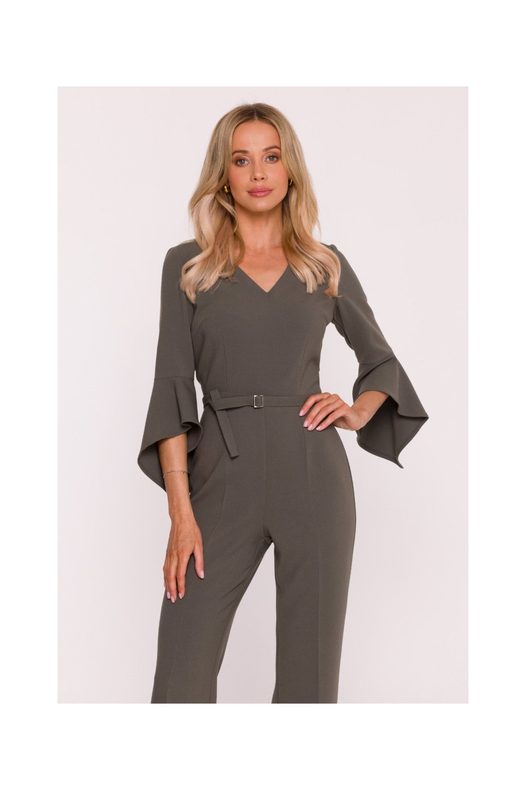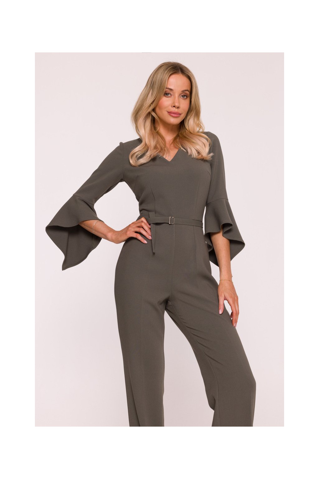 Horní část overalu je tvořena přiléhavým topem s tříčtvrtečními rukávy. Rukávy jsou zakončené výraznými volány, které dodávají celému outfitu špetku originality a zdůrazňují ženskou eleganci. Výstřih do V jemně zvýrazňuje dekolt a opticky prodlužuje postavu. Overal má zvýšený pas, který elegantně modeluje siluetu a opticky prodlužuje nohy. Součástí je tenký látkový pásek s decentní přezkou ve stejném odstínu, jenž krásně zvýrazní pas a zároveň působí velmi sofistikovaně. Spodní část tvoří volné, široké nohavice s výraznými puky. Tento střih nejenže poskytuje maximální pohodlí při nošení, ale zároveň působí velmi moderně a lichotivě. Puky dodávají nohavicím slavnostní nádech a celkový vzhled overalu je tak ještě více elegantní. Overal je vybaven nenápadným, skrytým zipem na zadní straně, což zajišťuje snadné oblékání a zároveň zachovává čistotu linií.