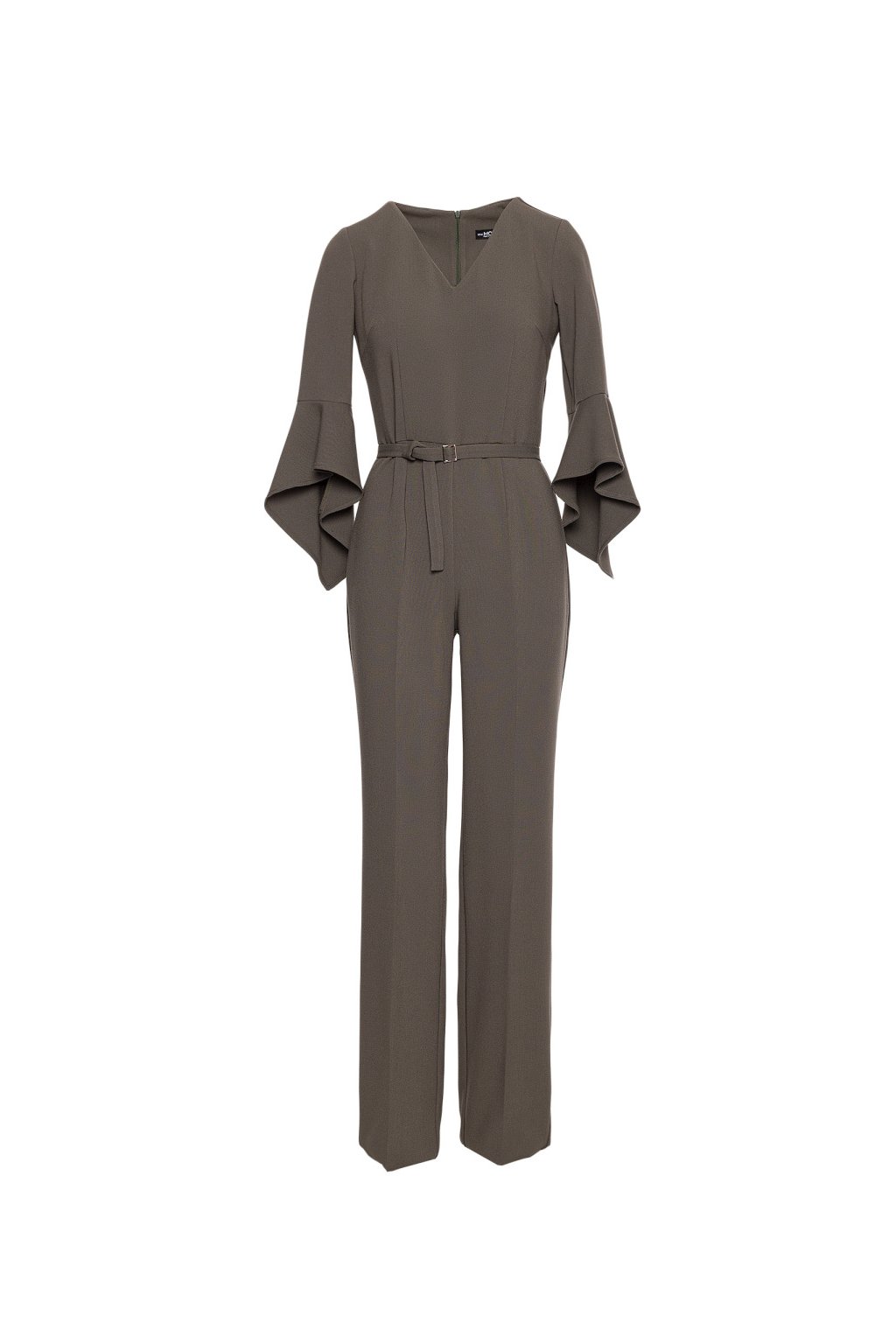 Elegantní a sofistikovaný společenský overal se zajímavými rukávy. Přiléhavý top s tříčtvrtečními rukávy zakončenými výraznými volány a výstřihem do V, vysoký pas s tenkým látkovým páskem s přezkou, široké nohavice s puky. Zapínání na skrytý zip na zádech.