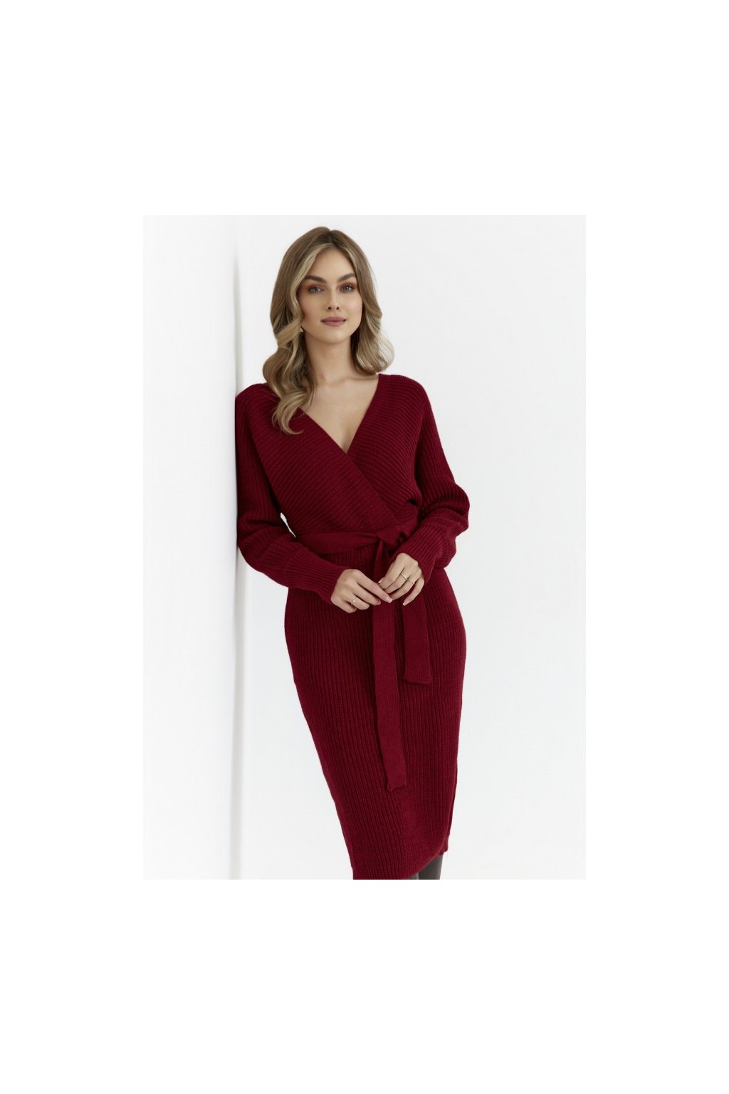 Efektní pletené šaty s úzkou sukní, netopýřími rukávy a topem s hlubokým výstřihem do V vpředu i vzadu. Rukávy jsou zúžené do vysokých manžet, šaty mají pevné překřížení (zavinování), vroubkovaný vzor a v pase pletený pásek.