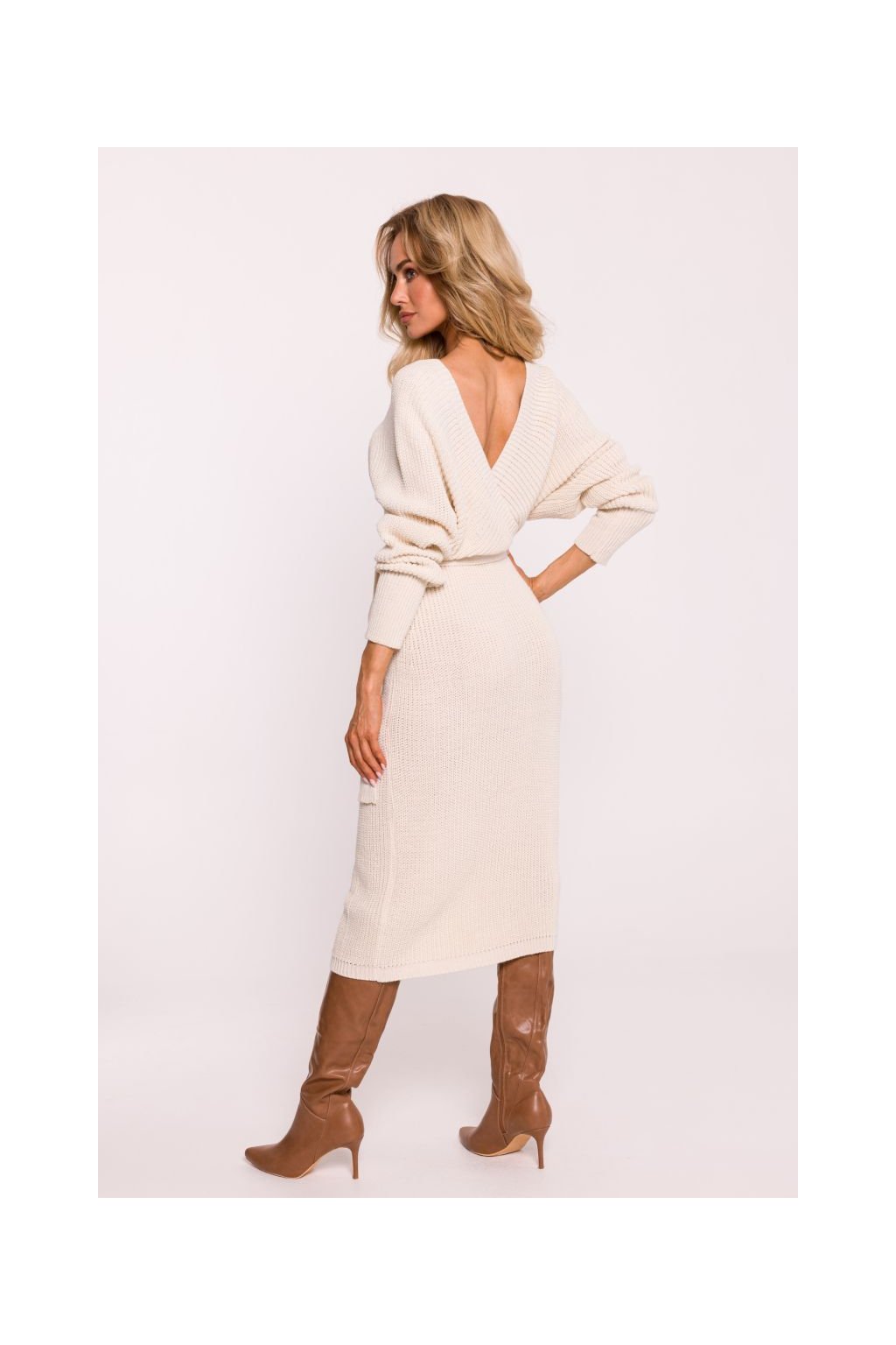 Efektní pletené šaty s úzkou sukní, netopýřími rukávy a topem s hlubokým výstřihem do V vpředu i vzadu.