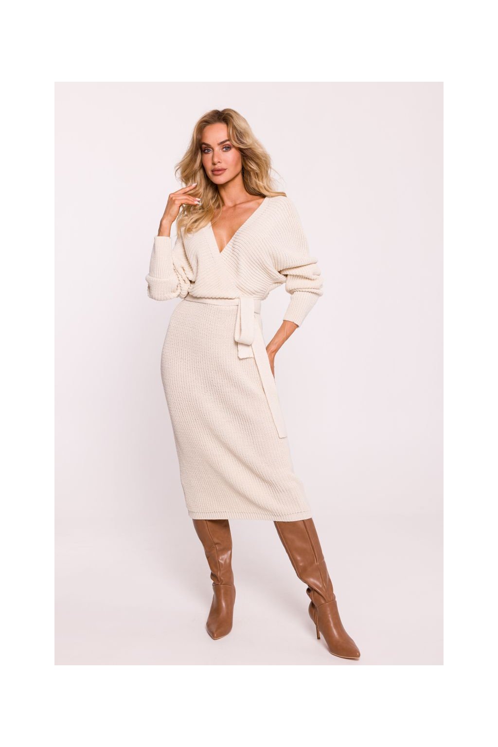 Efektní pletené šaty s úzkou sukní, netopýřími rukávy a topem s hlubokým výstřihem do V vpředu i vzadu. Rukávy jsou zúžené do vysokých manžet, šaty mají pevné překřížení (zavinování), vroubkovaný vzor a v pase pletený pásek.