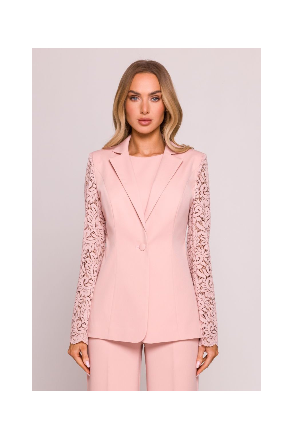 Slavnostní elegantní sako vypasovaného střihu střihu s výraznými krajkovými rukávy tón v tónu. Klasické klopy, podélné prošívání, zapínání na jeden knoflík potažený látkou. Vhodný doplněk k šatům MOE M864 nebo overalu MOE M866.