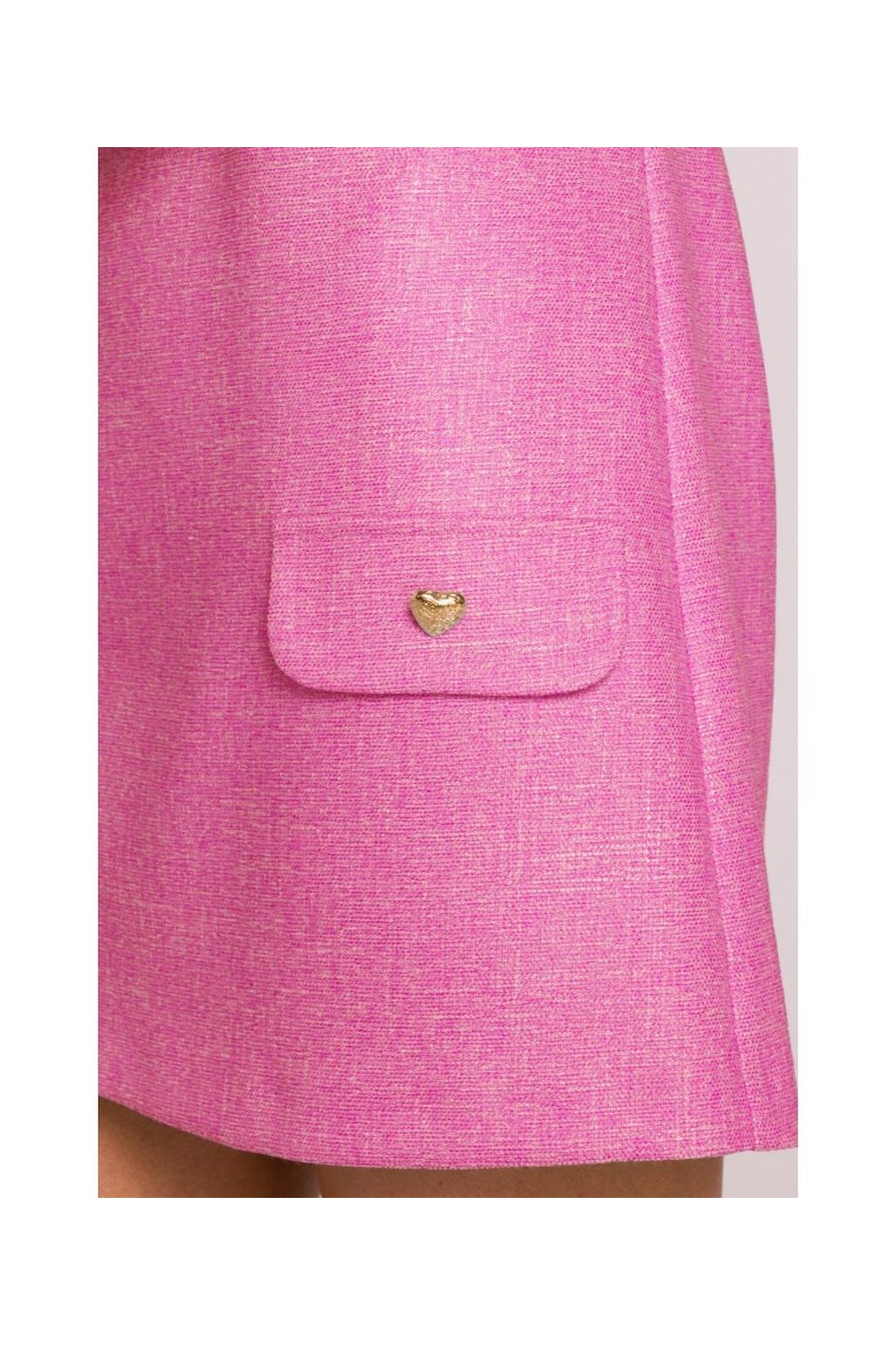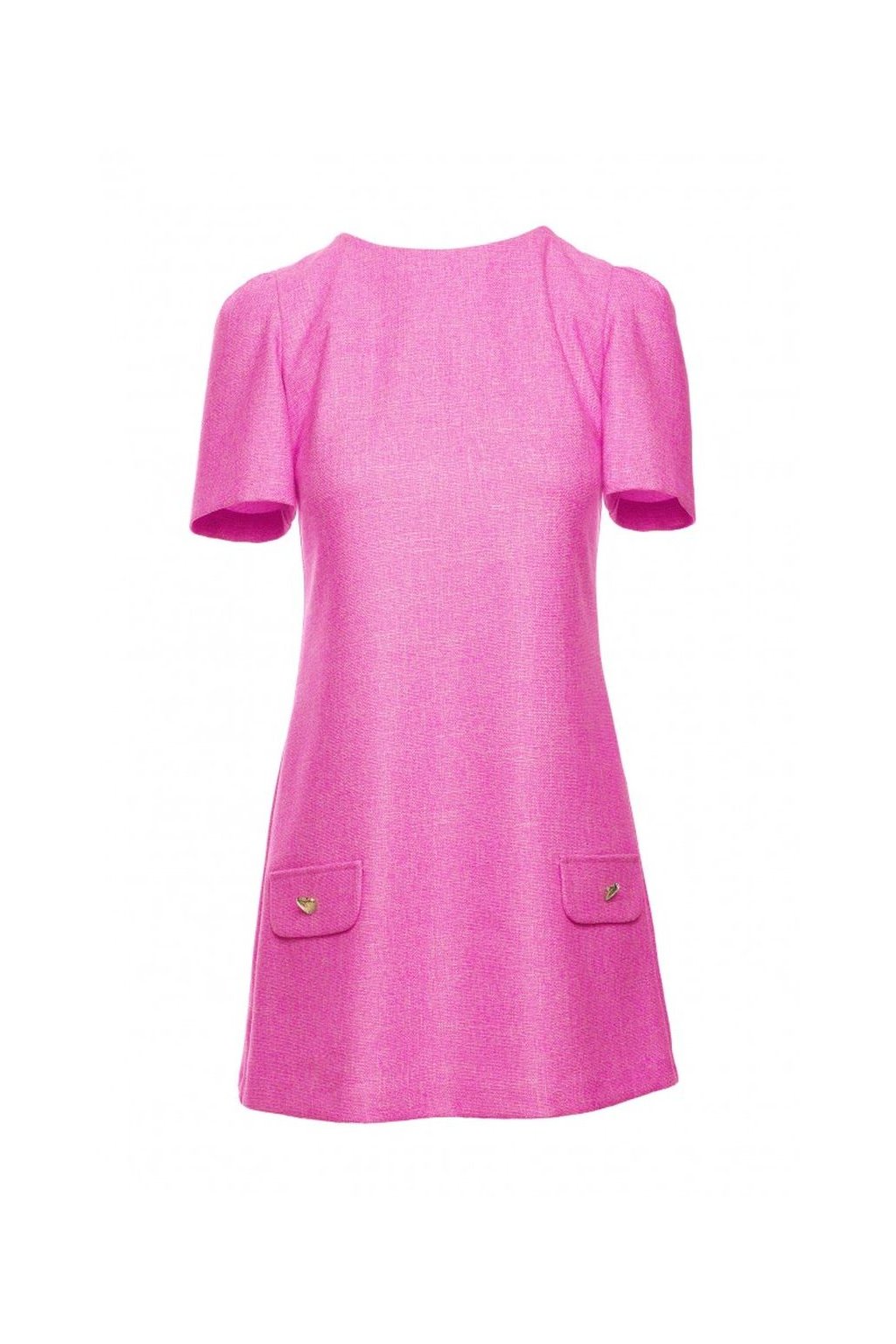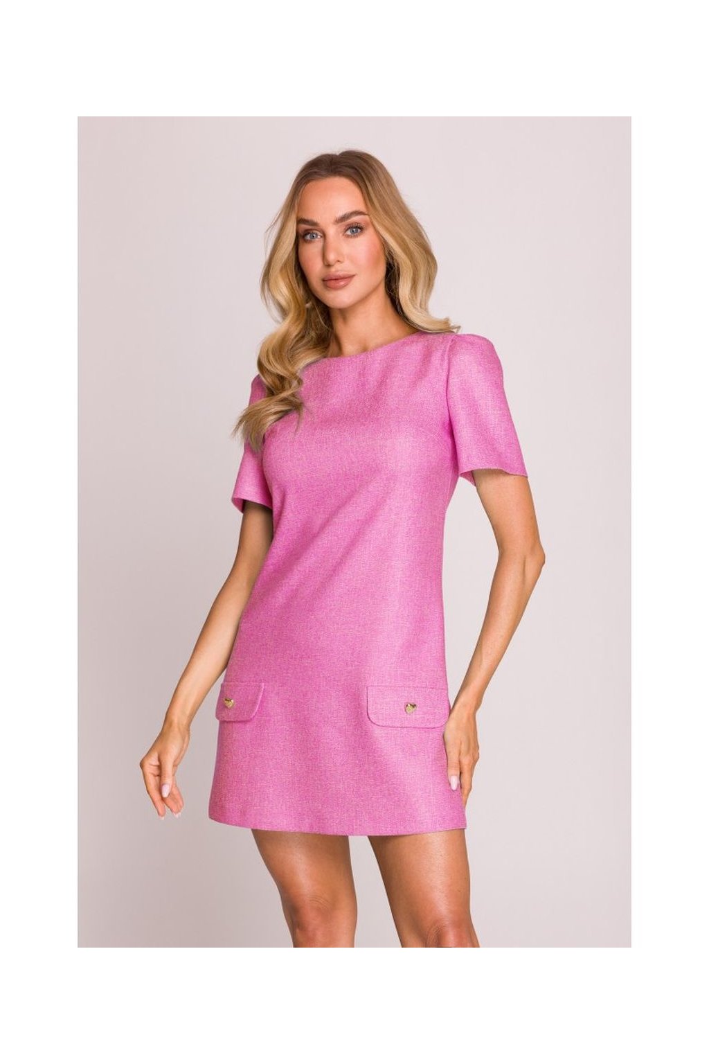 Elegantní retro minišaty představují stylový návrat do éry vytříbené módy, kde každý detail podtrhuje smysl pro ženskost a originalitu. Hladký, jemně splývavý materiál těchto šatů přináší exkluzivní pocit na dotek i na pohled, zatímco mírně projmutý střih elegantně zvýrazní siluetu a přirozeně nasměruje pozornost k linii pasu. Nadčasové krátké balonové rukávy působí nadýchaně a zároveň přispívají k lehce hravému dojmu. Vpředu dominují ozdobné klopy, na nichž se vyjímají zlaté knoflíčky ve tvaru srdce – luxusní detail, který šatům dodává šmrnc a osobitý charakter. Zapínání je diskrétně řešeno pomocí skrytého zipu na zádech, což podporuje uhlazený vzhled a neruší čisté linie modelu.