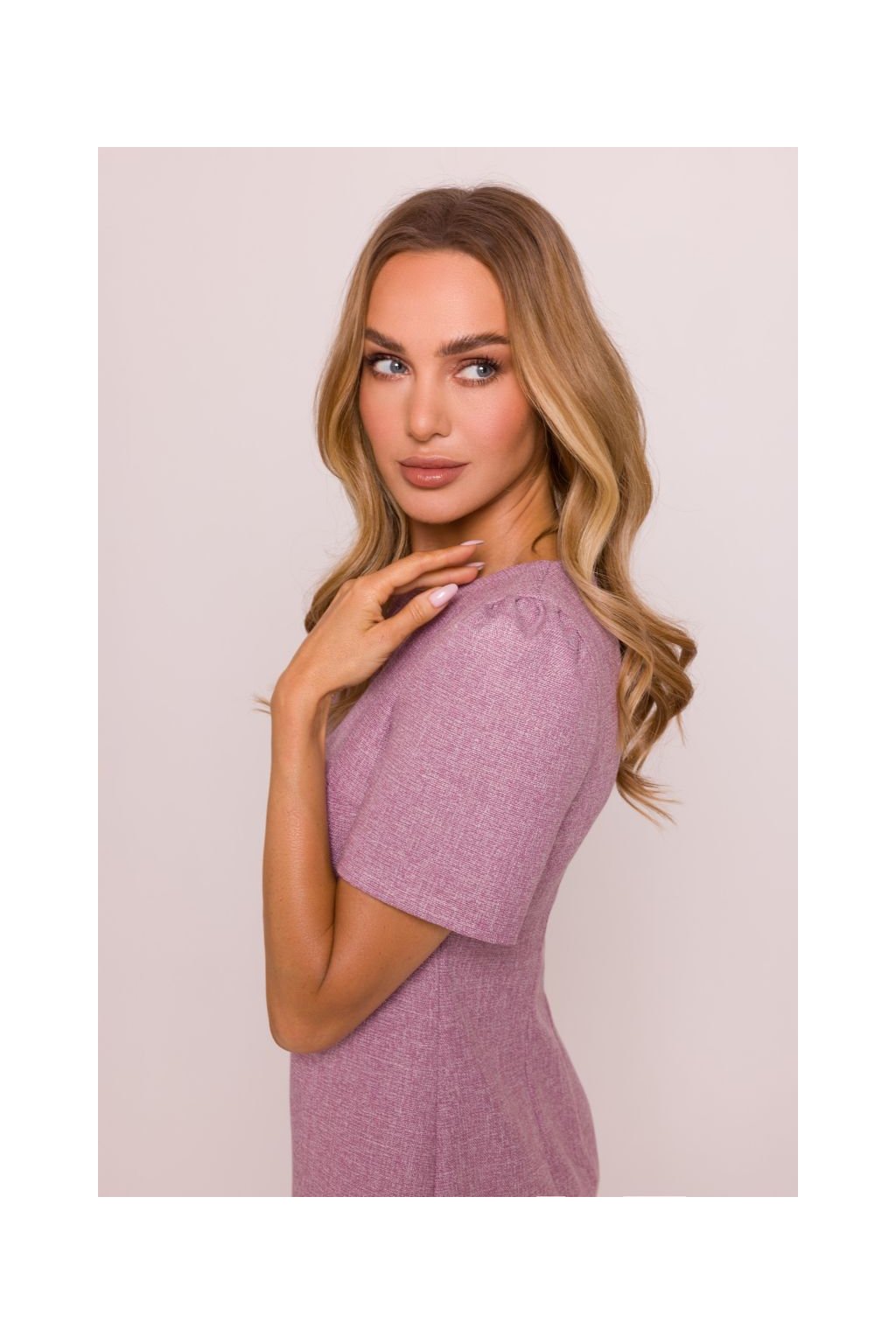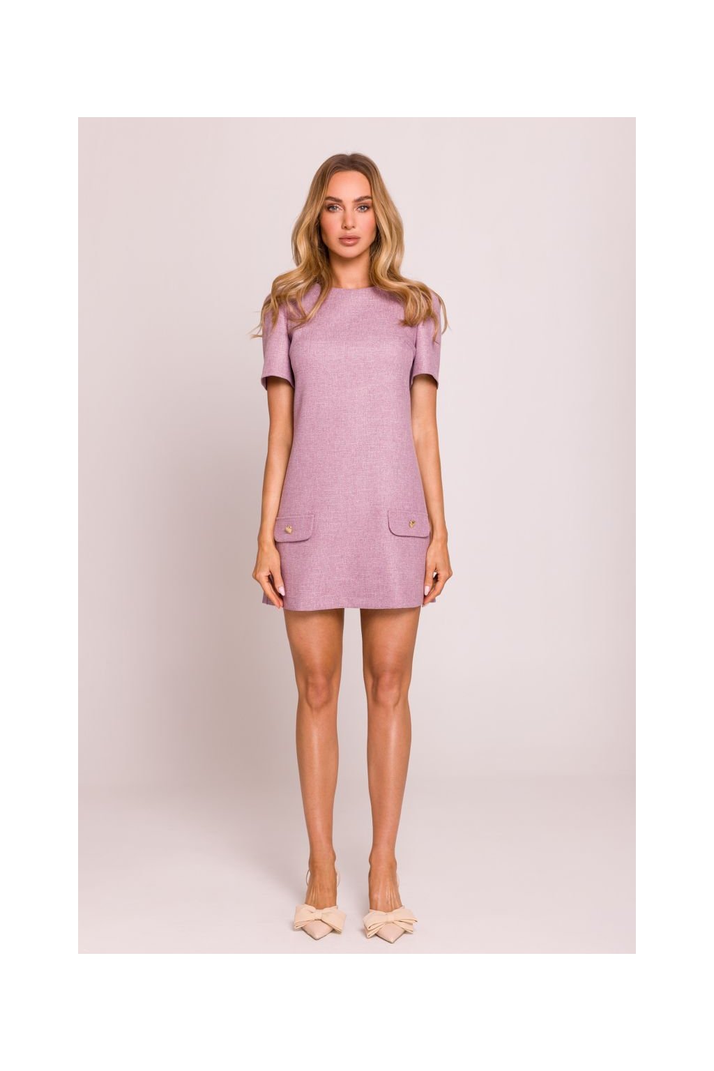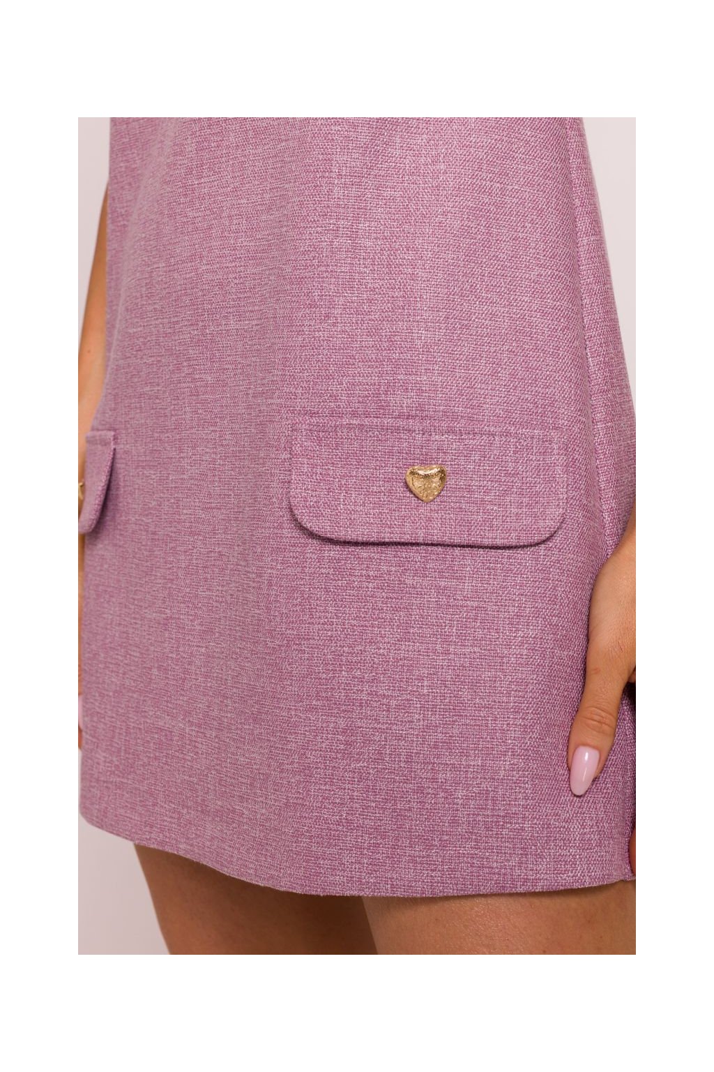 Elegantní retro minišaty, hladké elegantní, mírně projmuté zdůrazňující postavu, krátké nabrané balonové rukávy, vpředu ozdobné klopy se zlatými knoflíčky ve tvaru srdce. Zapínání na skrytý zip na zádech. Bez podšívky.