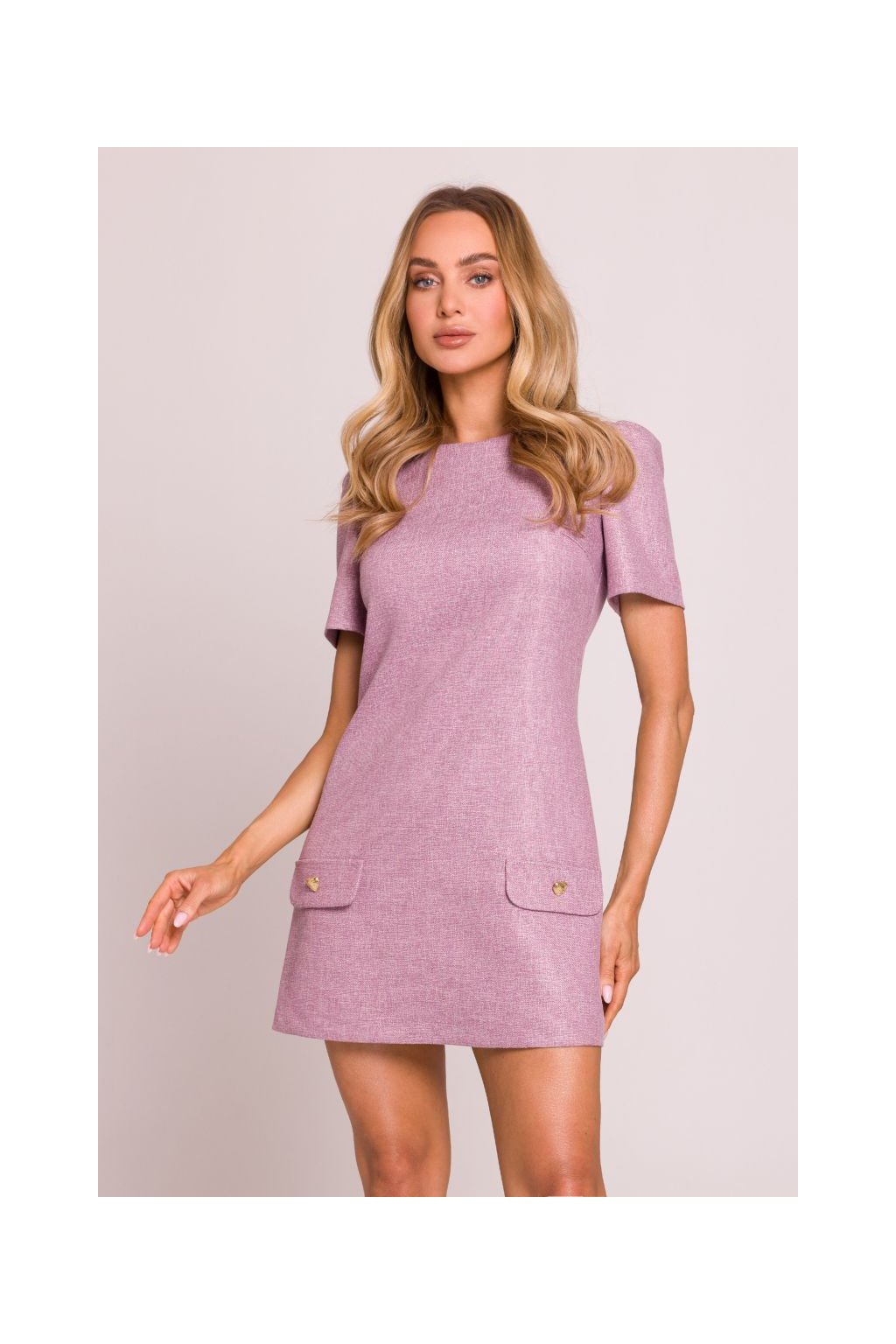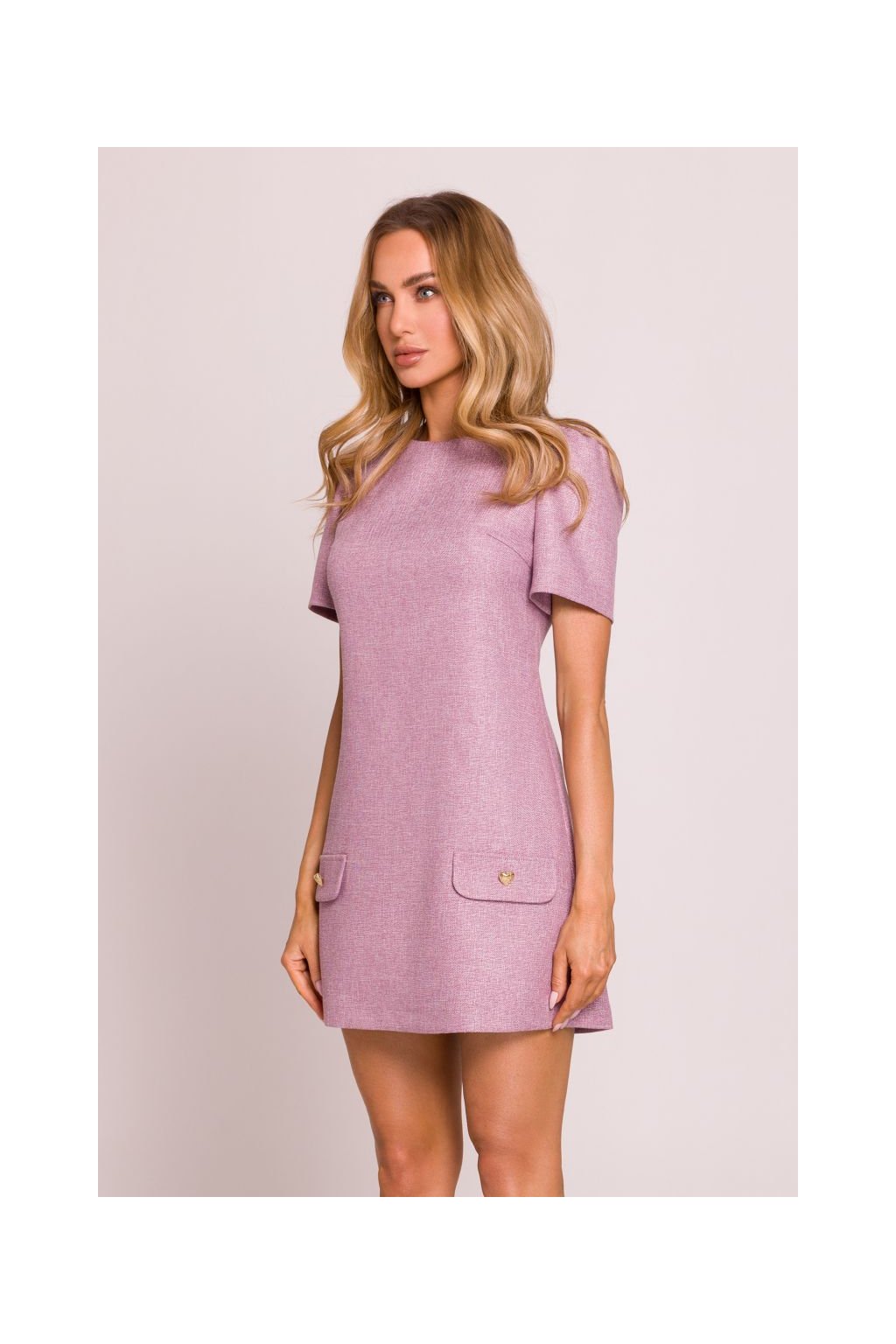 Elegantní retro minišaty představují stylový návrat do éry vytříbené módy, kde každý detail podtrhuje smysl pro ženskost a originalitu. Hladký, jemně splývavý materiál těchto šatů přináší exkluzivní pocit na dotek i na pohled, zatímco mírně projmutý střih elegantně zvýrazní siluetu a přirozeně nasměruje pozornost k linii pasu. Nadčasové krátké balonové rukávy působí nadýchaně a zároveň přispívají k lehce hravému dojmu. Vpředu dominují ozdobné klopy, na nichž se vyjímají zlaté knoflíčky ve tvaru srdce – luxusní detail, který šatům dodává šmrnc a osobitý charakter. Zapínání je diskrétně řešeno pomocí skrytého zipu na zádech, což podporuje uhlazený vzhled a neruší čisté linie modelu.