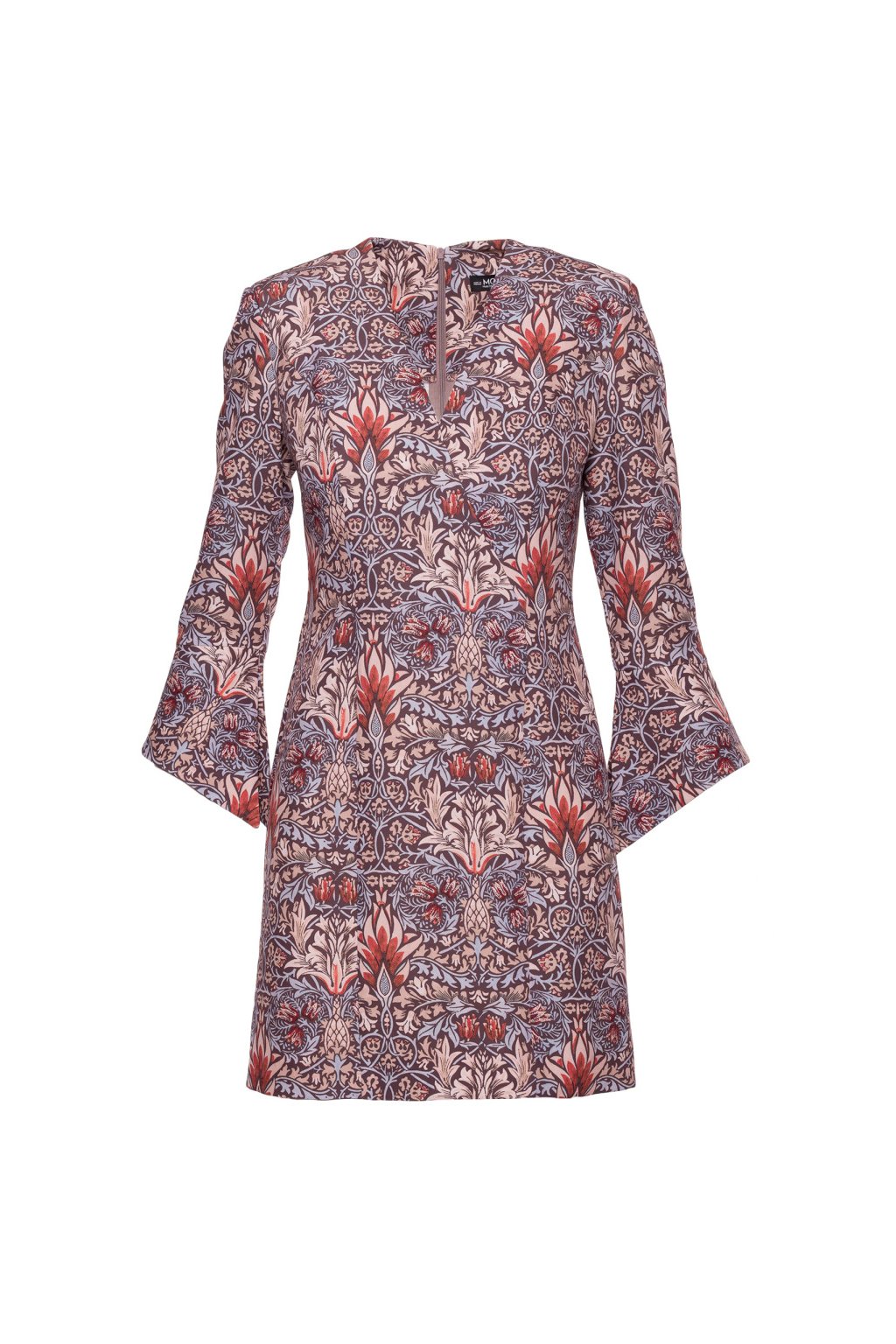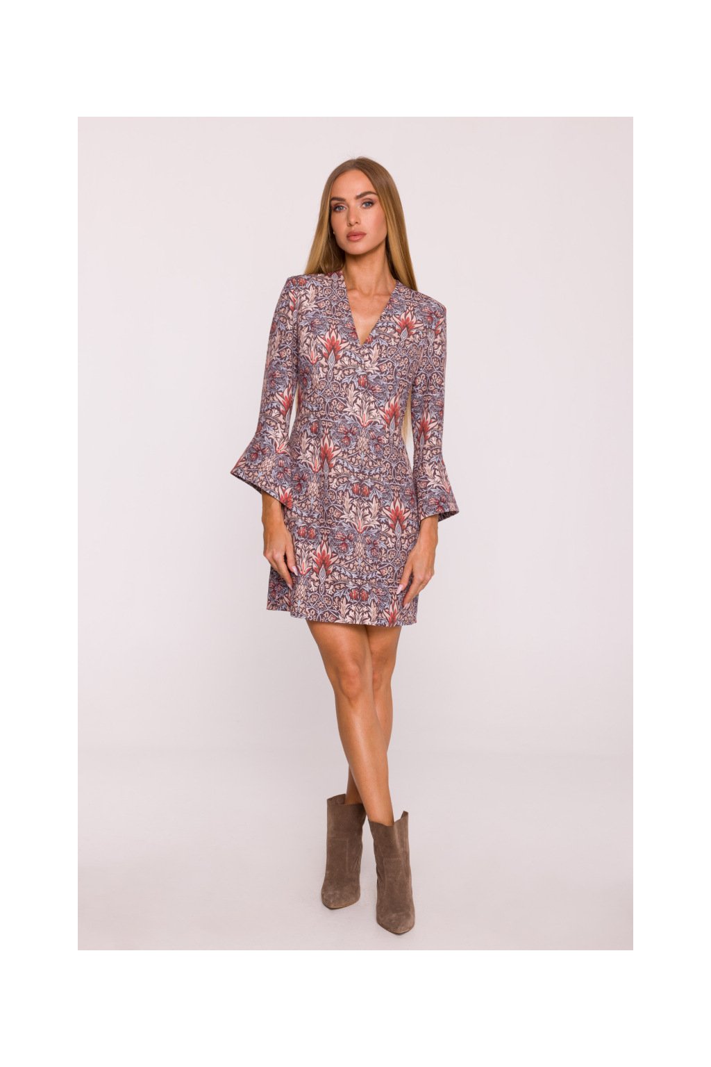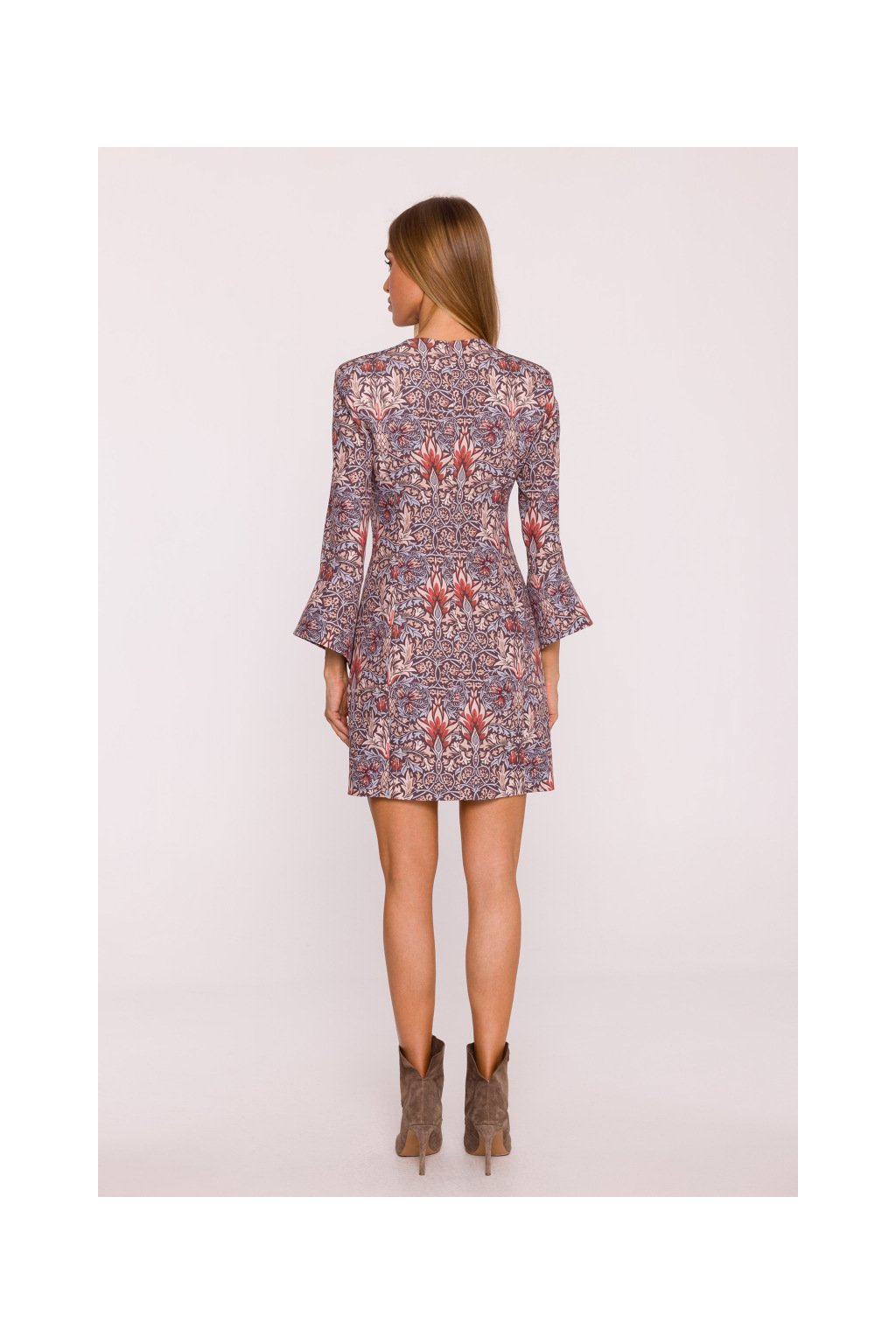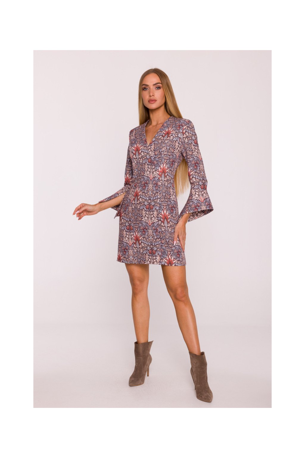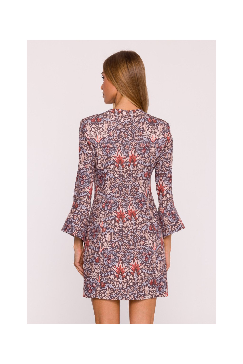 Elegantní minišaty mírně projmutého střihu, s hlubokými výstřihem do V, s dlouhými rukávy zakončenými zajímavou širokou manžetou, mírně projmuté zdůrazňující postavu, ozdobně svislé prošité pro štíhlou linii. Retro květinový potisk. Zapínání na skrytý zip na zádech. Bez podšívky.