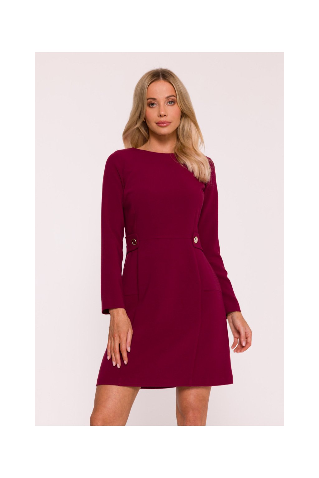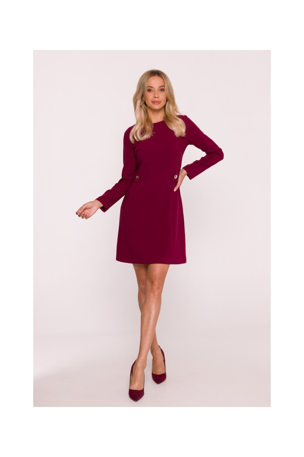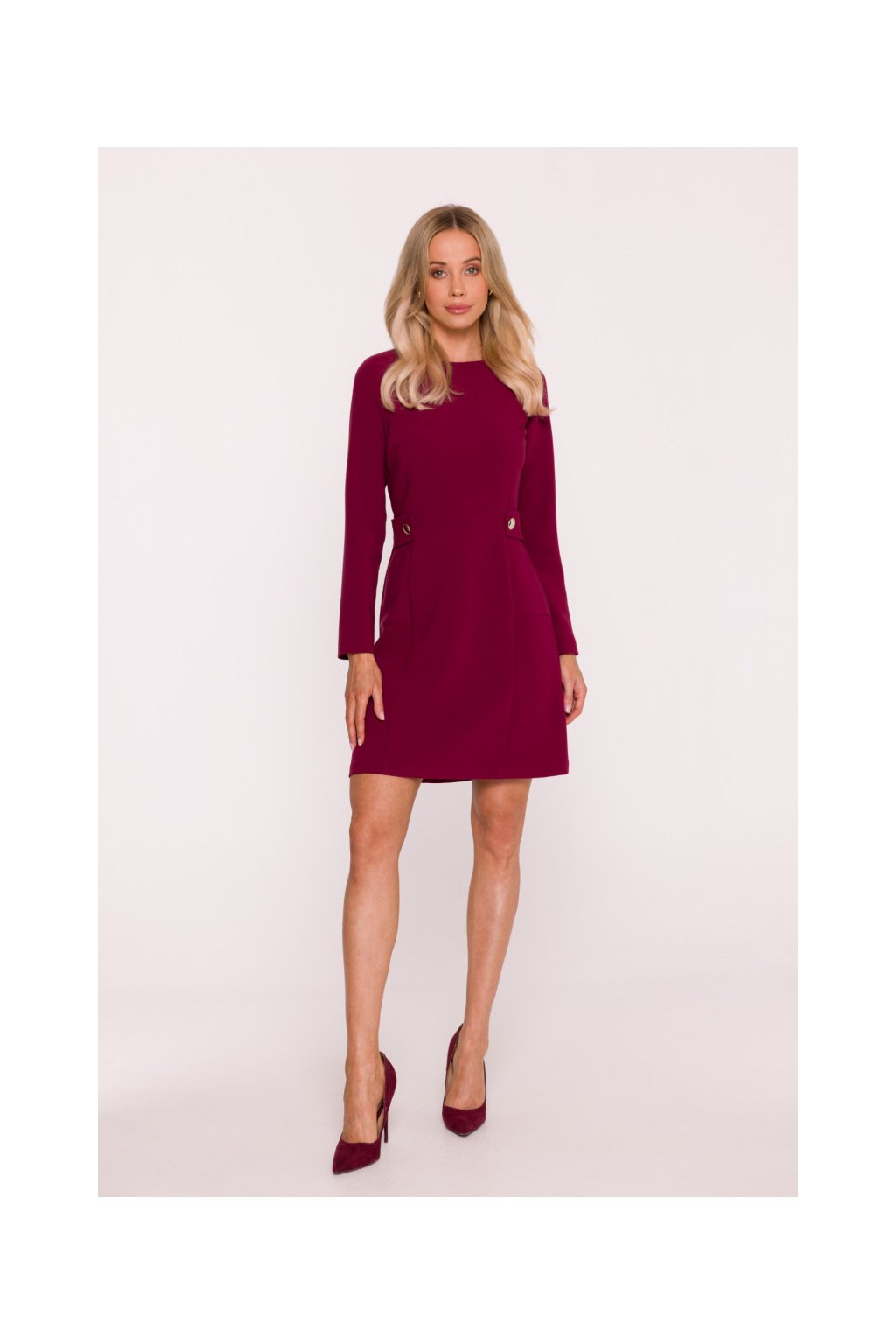 Elegantní minišaty trapézového střihu. Užší top s kulatým výstřihem a dlouhými rukávy, zapínání na skrytý zip na zádech. V pase poutka s ozdobnými knoflíky pro zvýraznění siulety. Áčková minisukně.