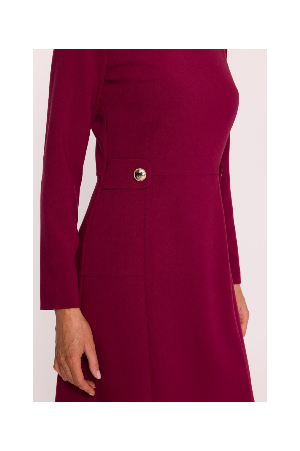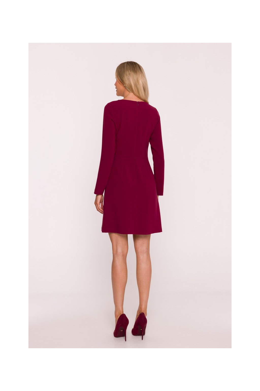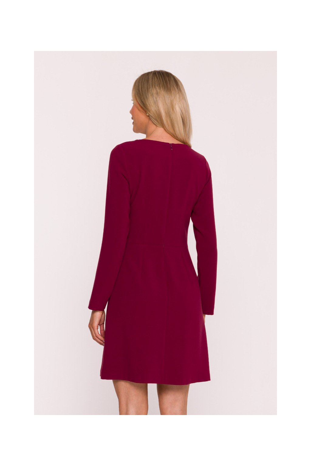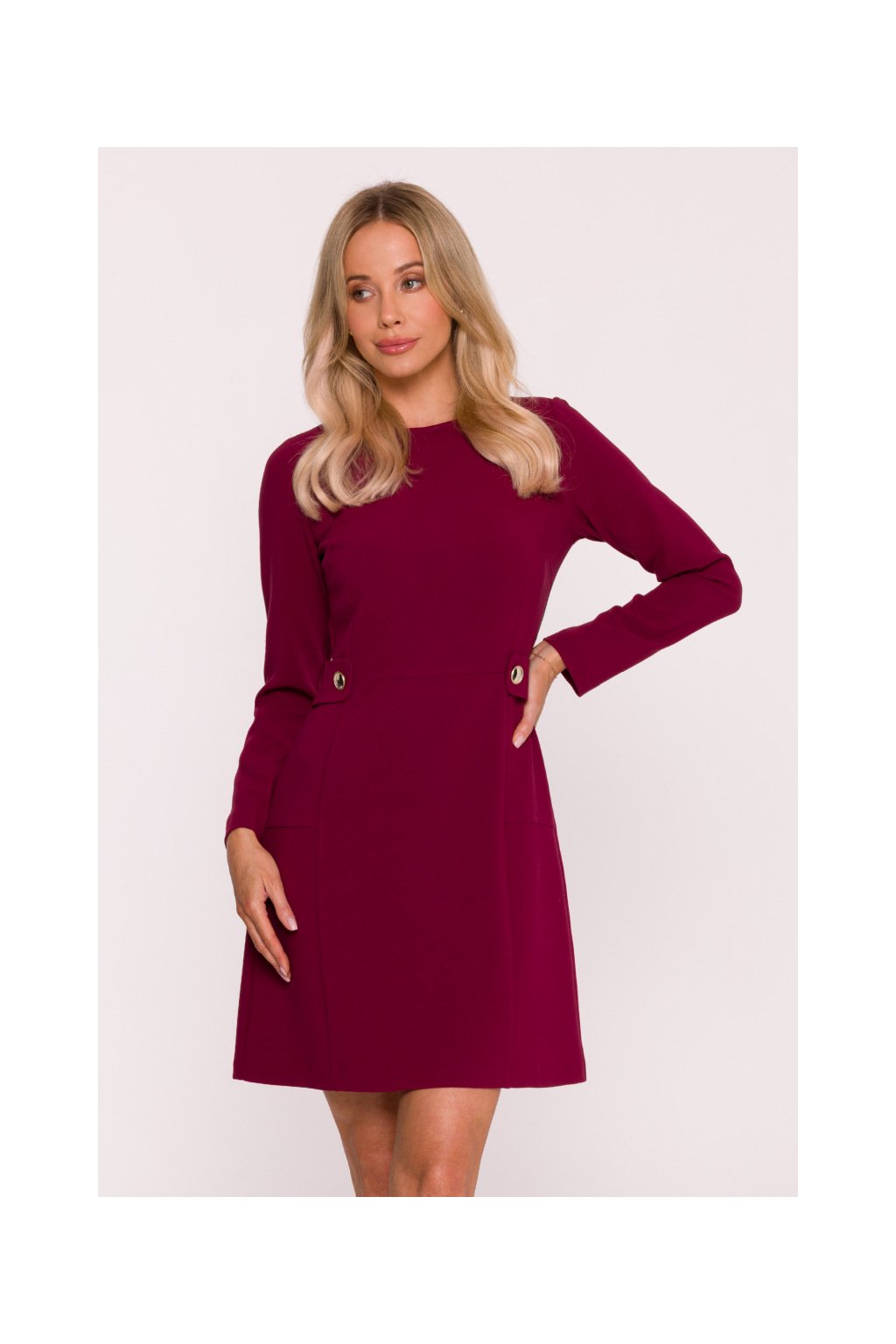 Elegantní minišaty trapézového střihu. Užší top s kulatým výstřihem a dlouhými rukávy, zapínání na skrytý zip na zádech. V pase poutka s ozdobnými knoflíky pro zvýraznění siulety. Áčková minisukně.