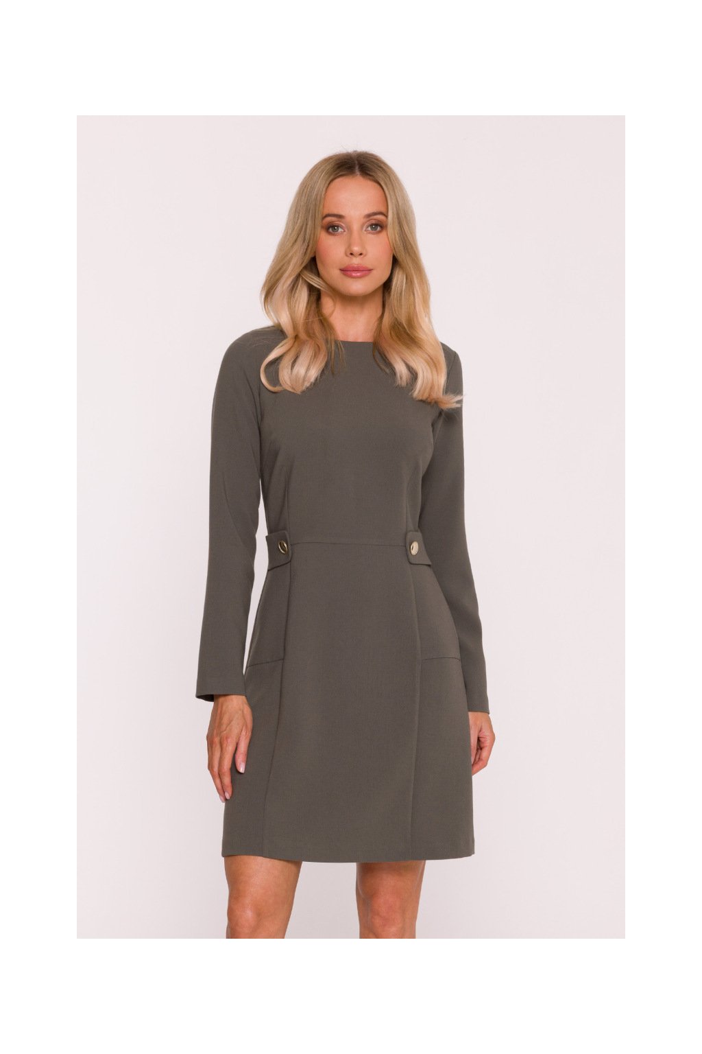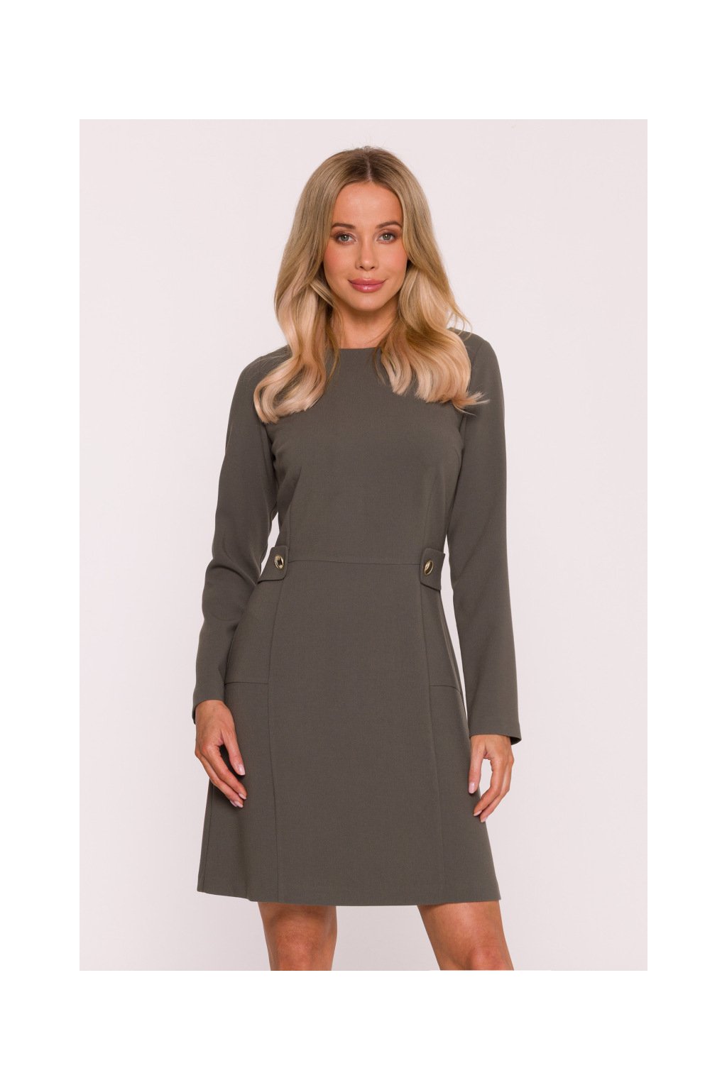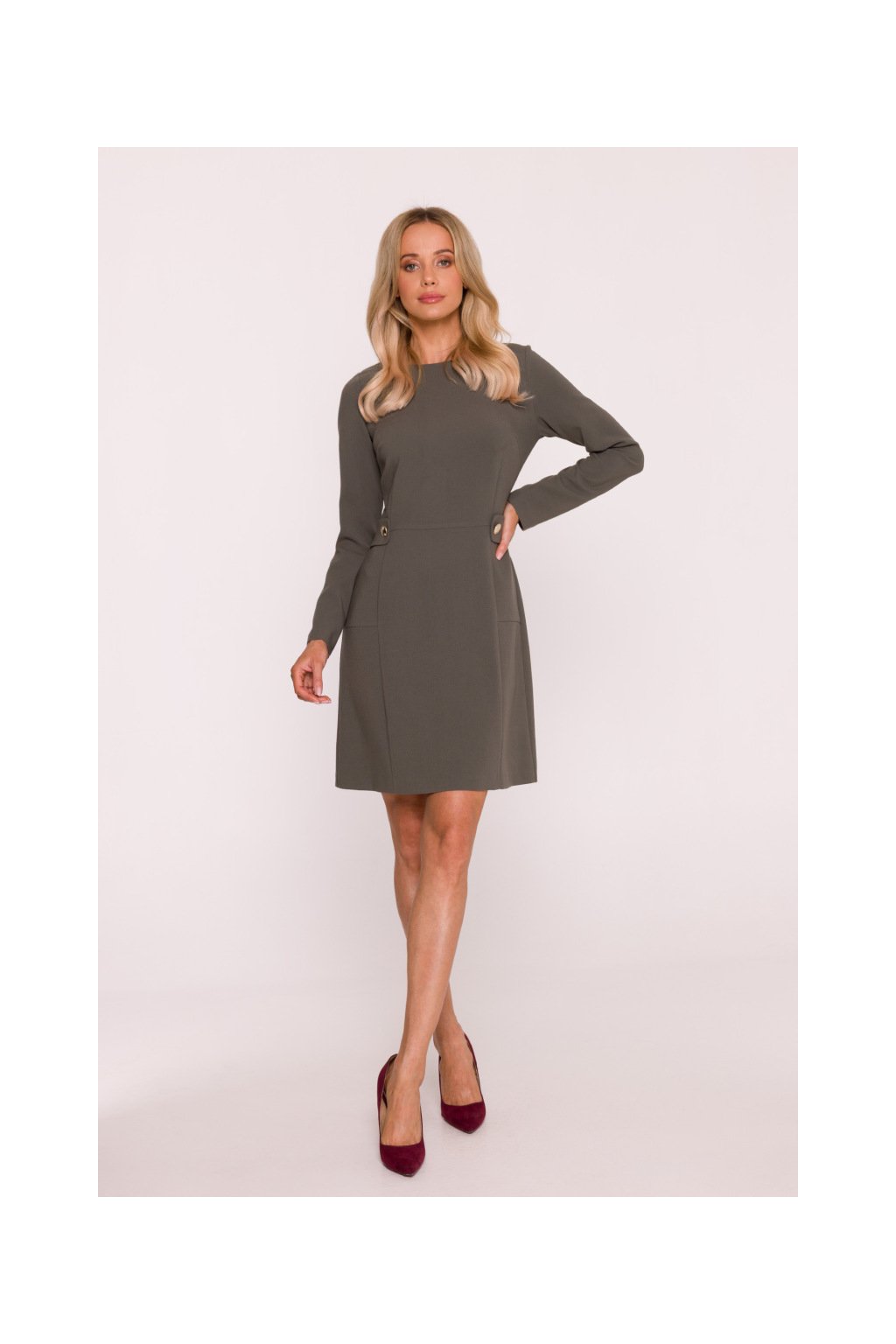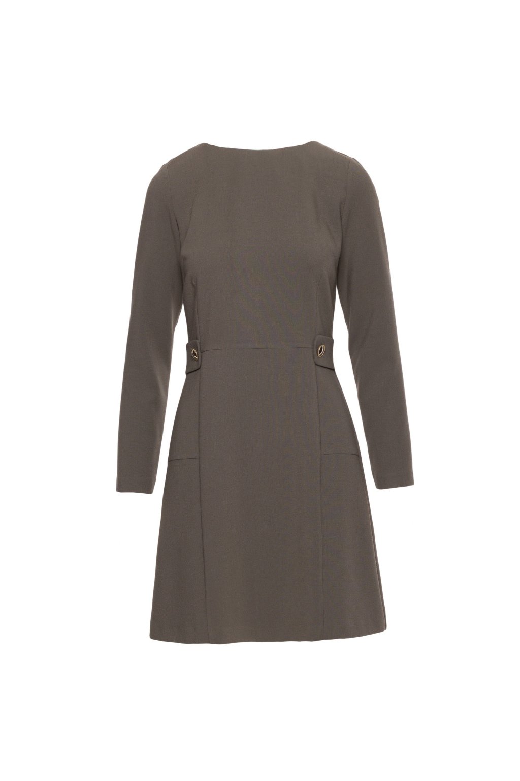 Elegantní minišaty trapézového střihu. Užší top s kulatým výstřihem a dlouhými rukávy, zapínání na skrytý zip na zádech. V pase poutka s ozdobnými knoflíky pro zvýraznění siulety. Áčková minisukně.