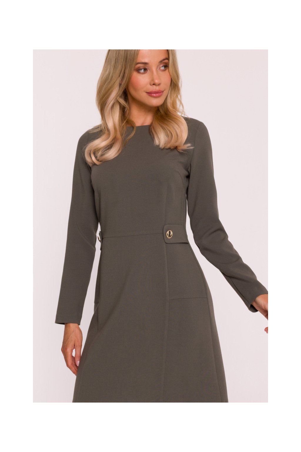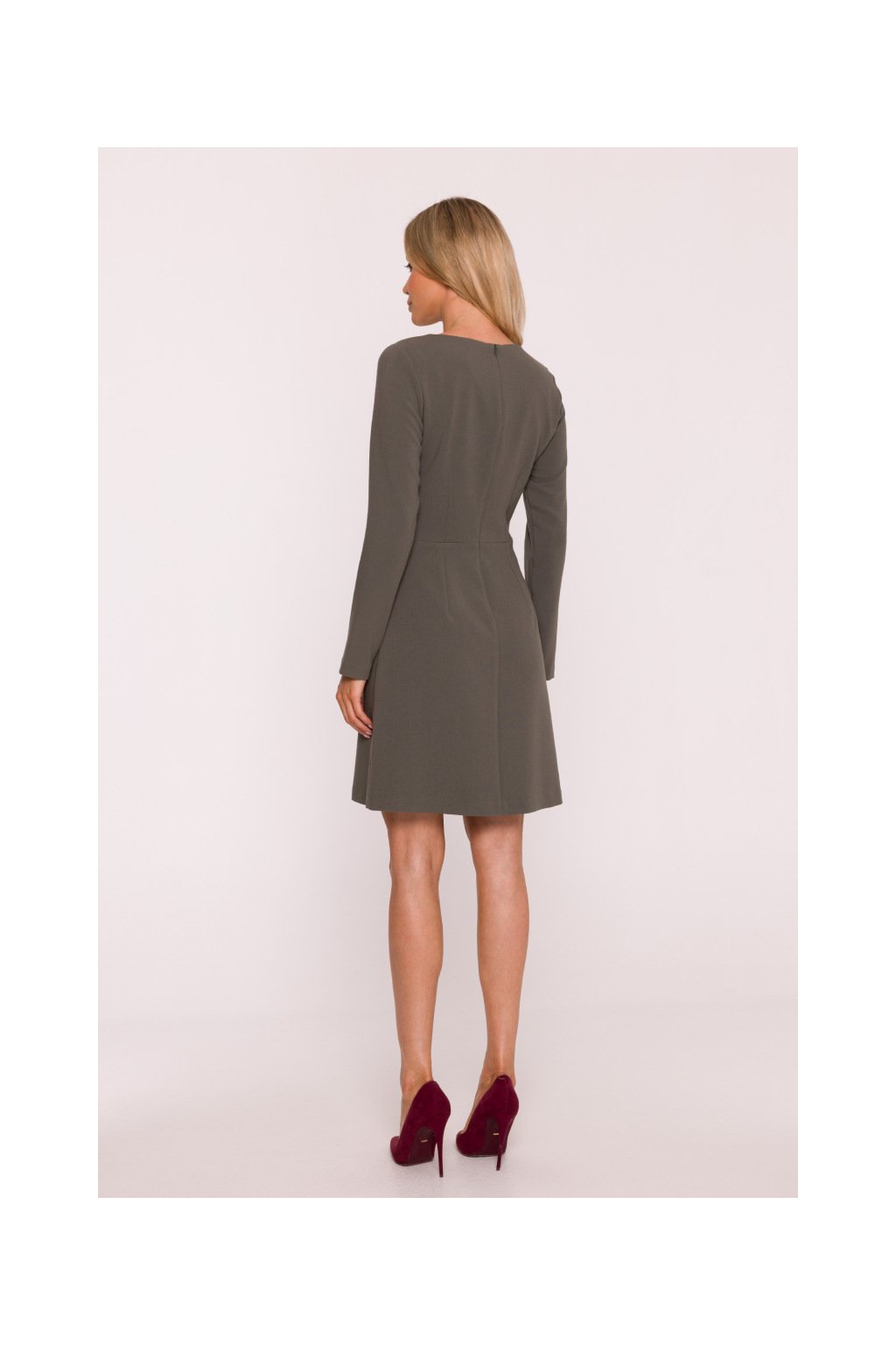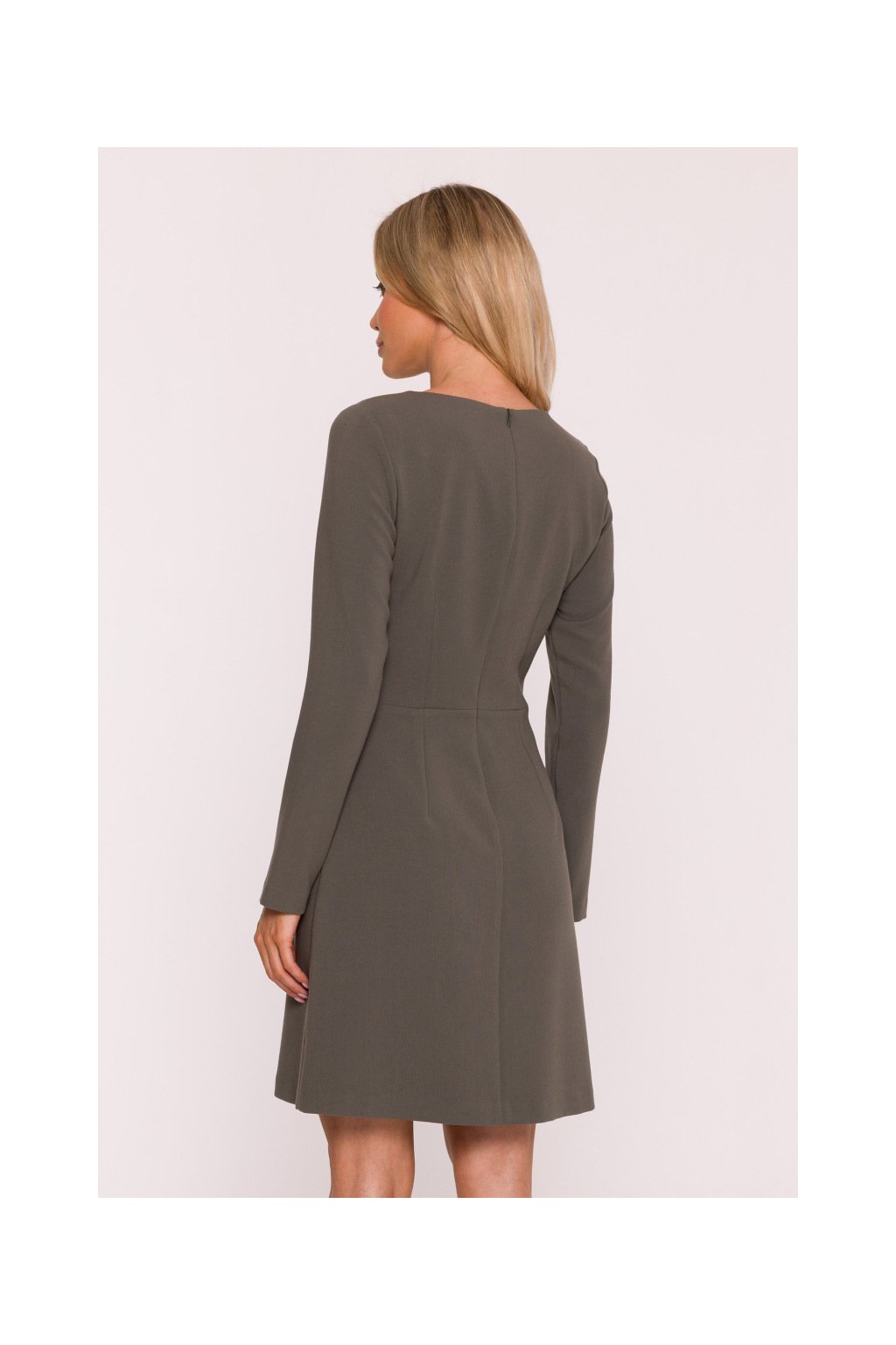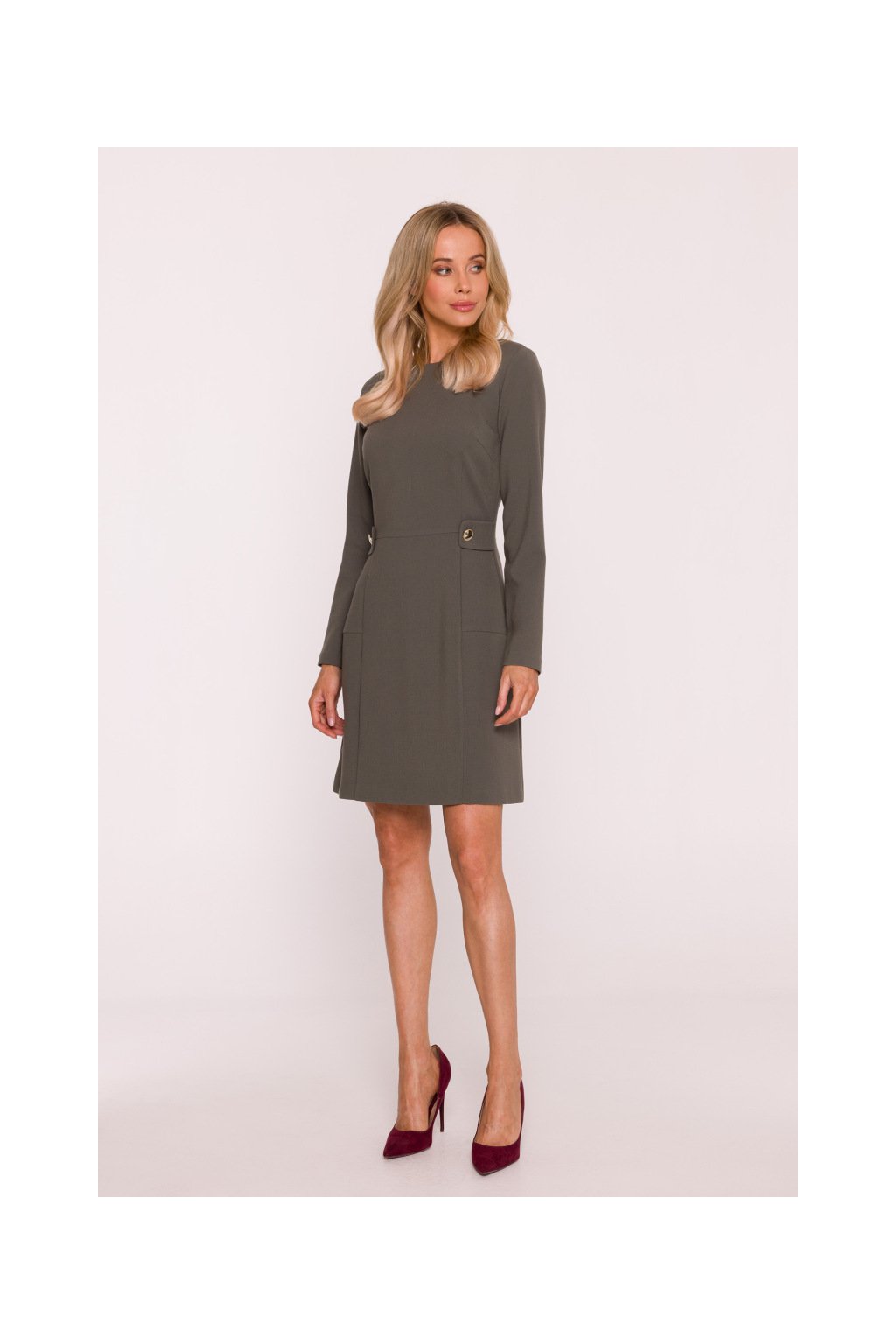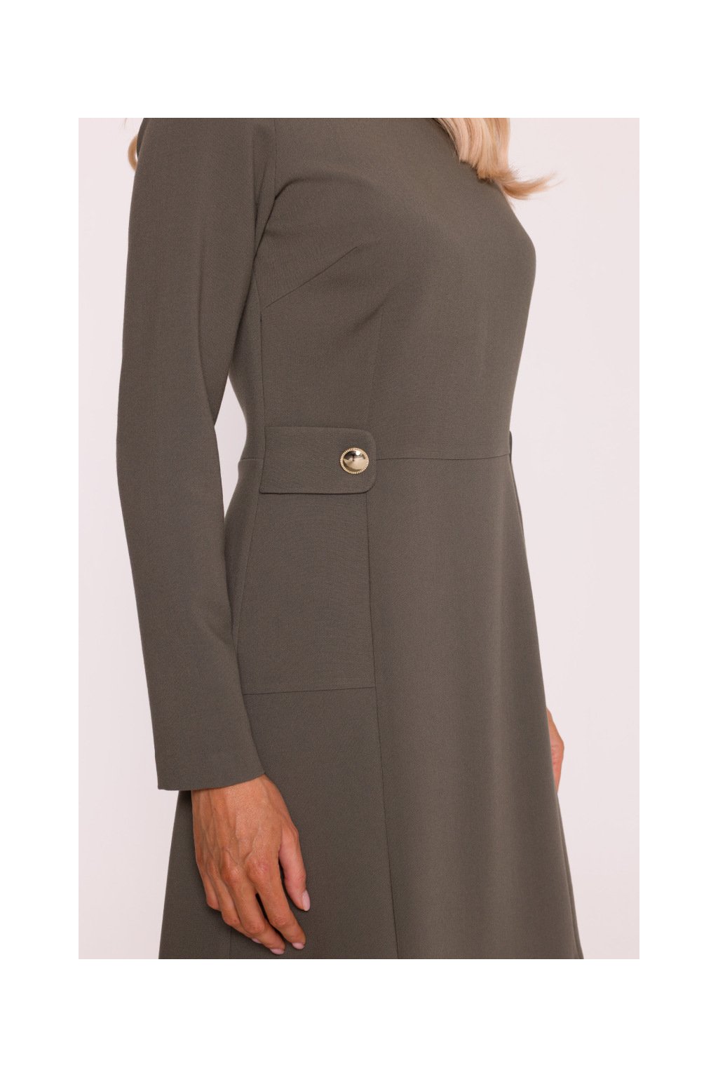 Elegantní minišaty trapézového střihu. Užší top s kulatým výstřihem a dlouhými rukávy, zapínání na skrytý zip na zádech. V pase poutka s ozdobnými knoflíky pro zvýraznění siulety. Áčková minisukně.