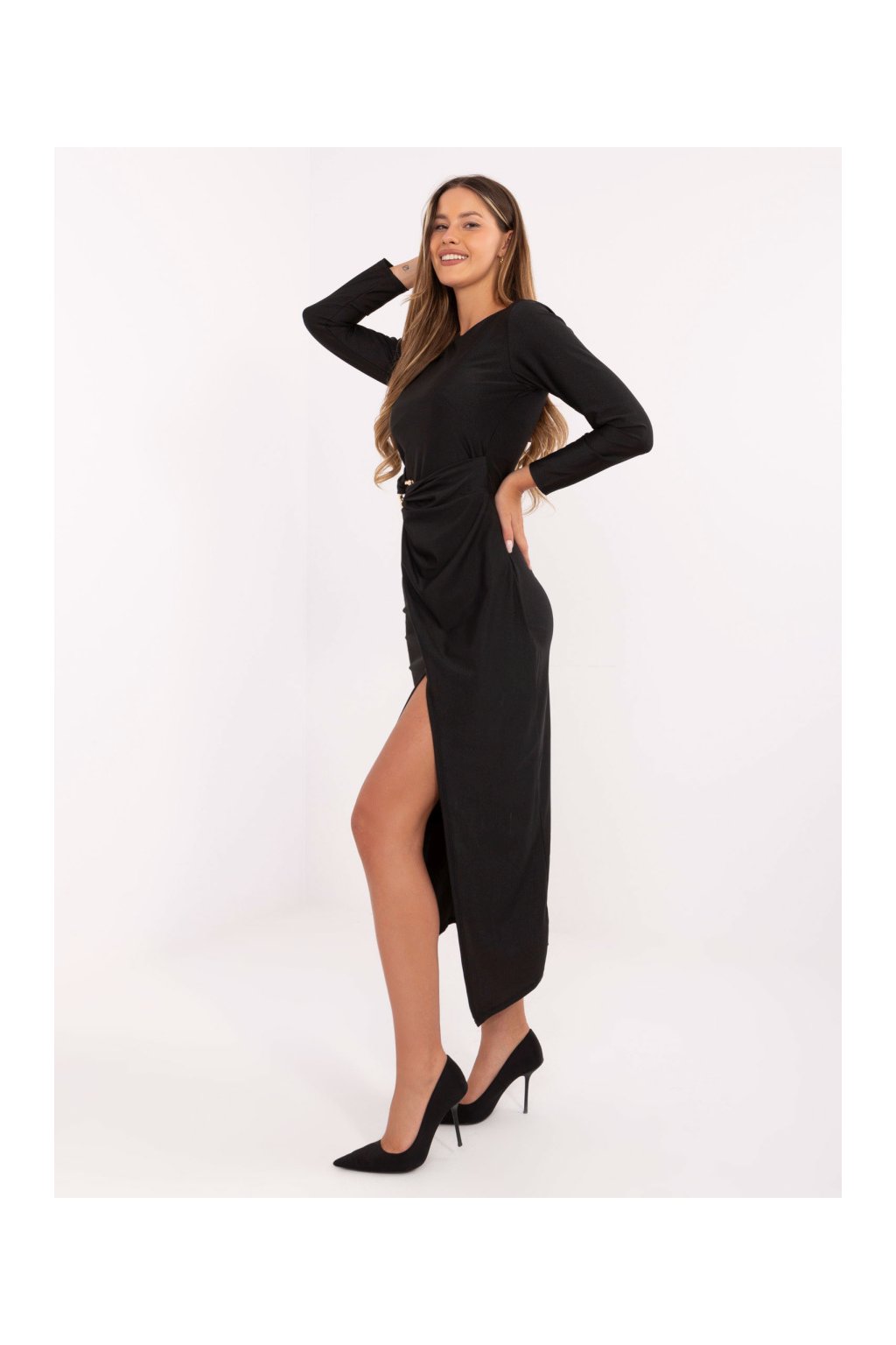 Elegantní šaty zvýrazňující postavu z jemného splývavého materiálu. Úzký pouzdrový střih s efekntím nařasením. Top s kulatým výstřihem a dlouhým rukávem, efektní nařasení v pase s efektní zlatou sponou. Úzká sukně pod kolena s vysokým rozparkem.